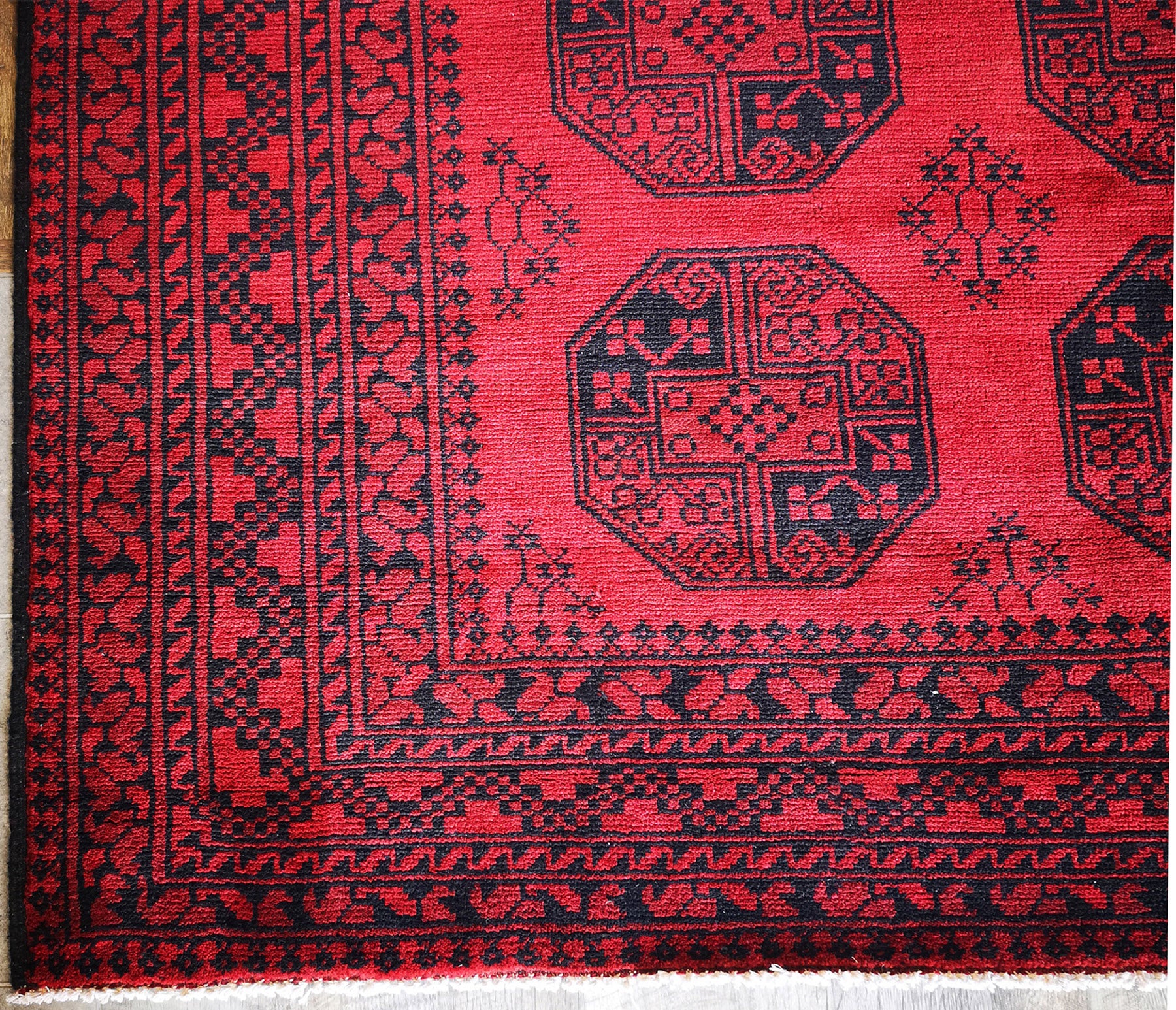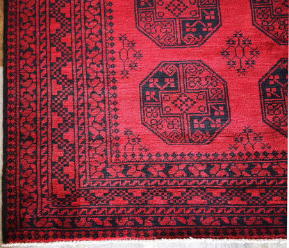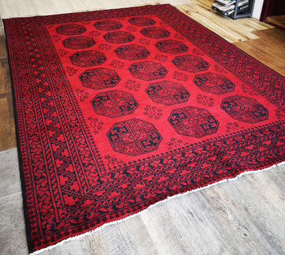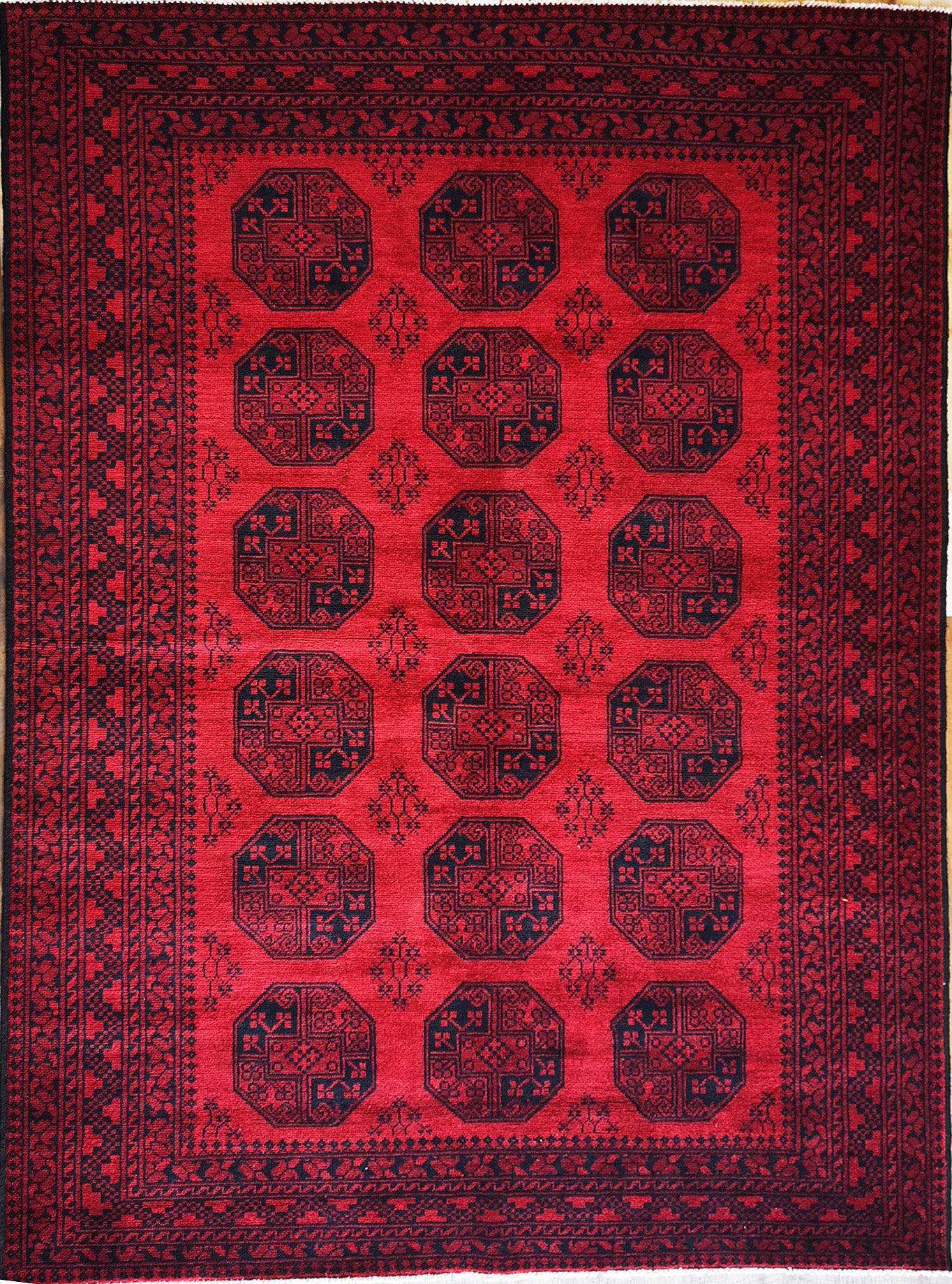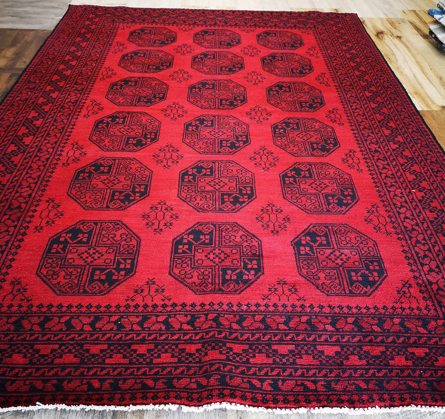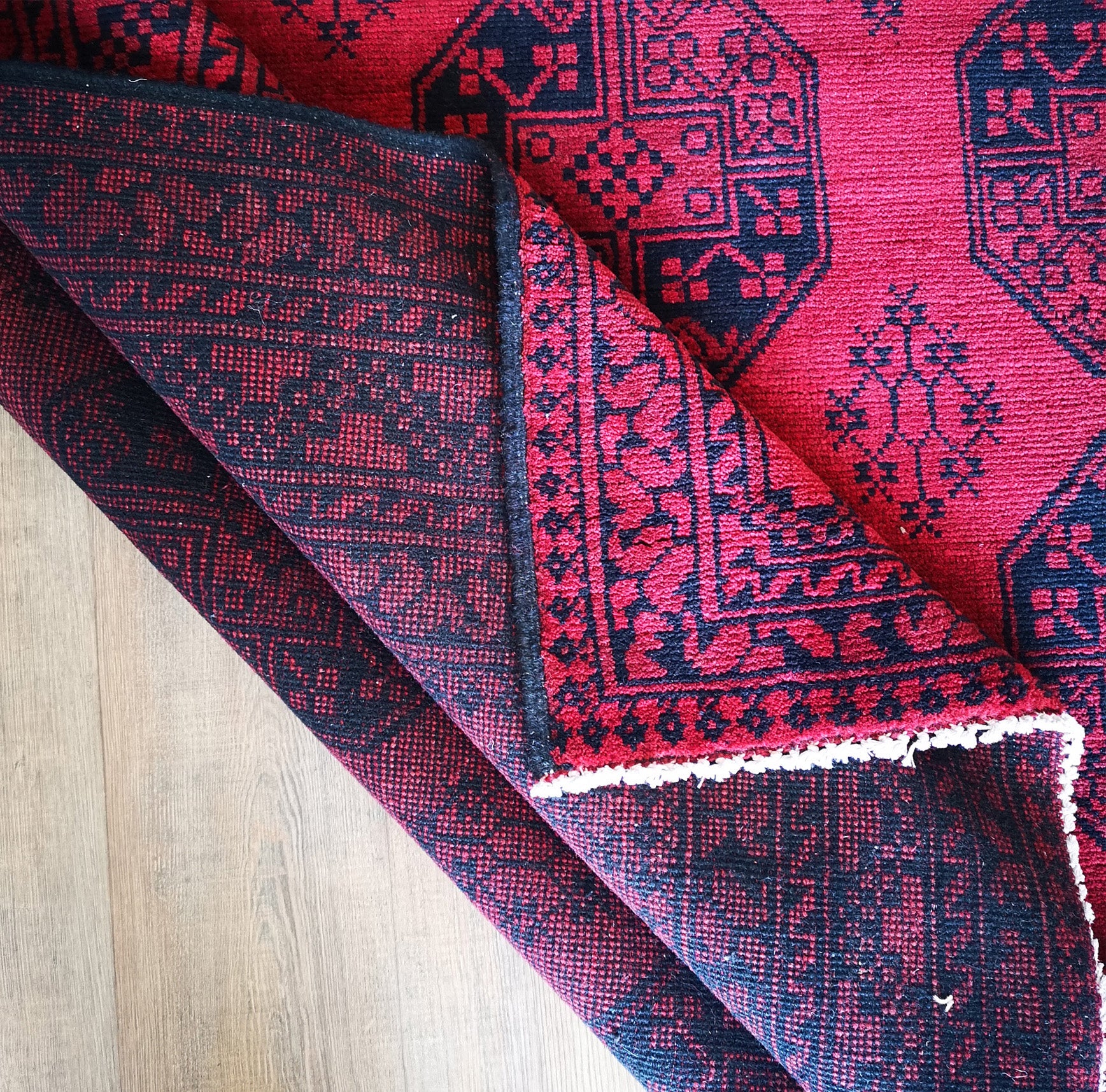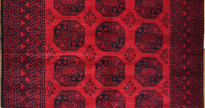 Hand-knotted in Aqcha, Afghanistan, this tribal rug embodies the bold symmetry and geometric precision of Afghan weaving. Its repeat medallion layout features octagonal guls arranged in a structured grid, surrounded by smaller motifs resembling stars or crosses, all set against a deep crimson field.