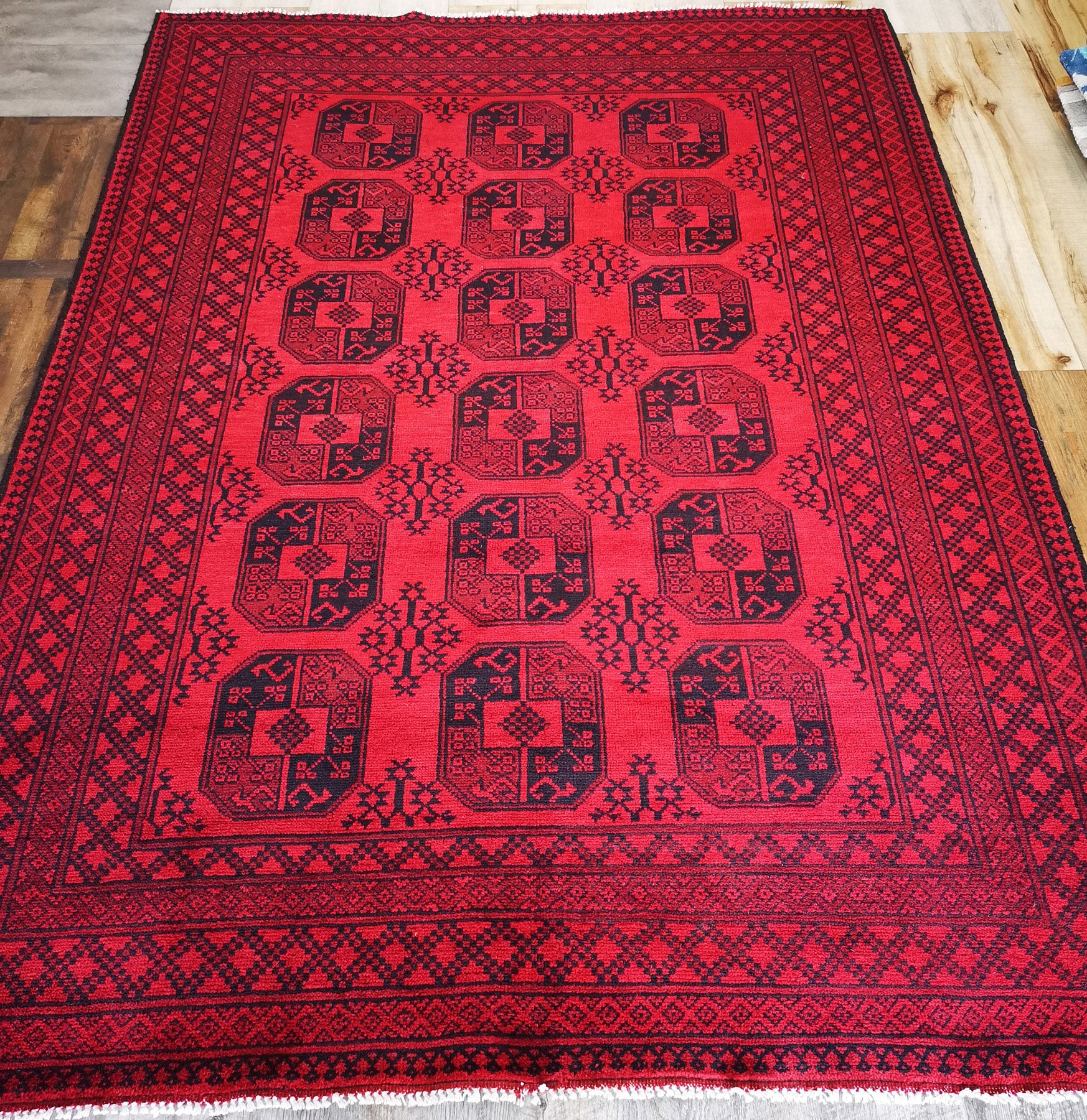 Hand-knotted in Aqcha, Afghanistan, this tribal rug embodies the bold symmetry and rich heritage of Afghan weaving. Its repeat medallion layout features octagonal guls—traditional tribal emblems—arranged in a precise grid, framed by a striking geometric border.