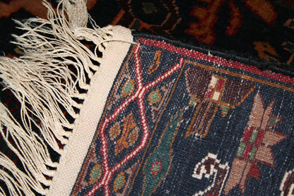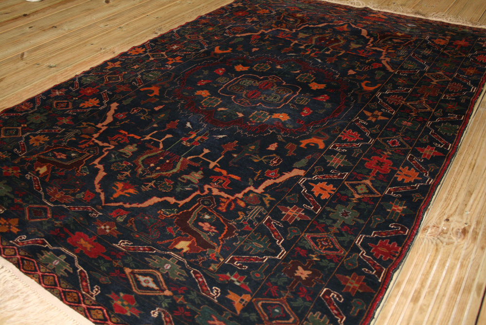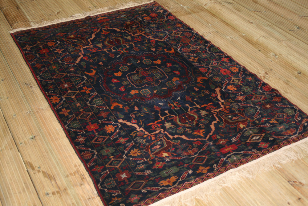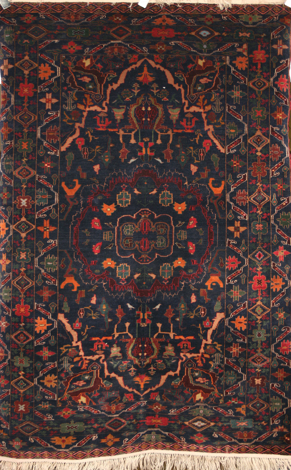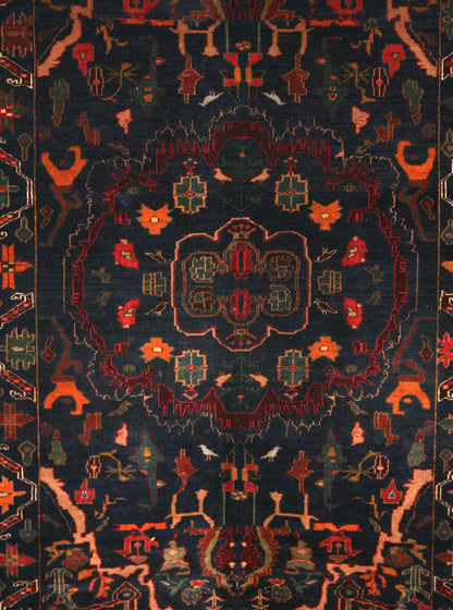 This hand-knotted Afghan Baluch rug captures the spirit of tribal artistry, blending geometric precision with floral grace. Its central medallion, framed by angular floral motifs and stylised palmettes, sits within a mirrored field of deep navy blue, rich burgundy, and forest green, softened by touches of burnt orange, golden yellow, and pink.