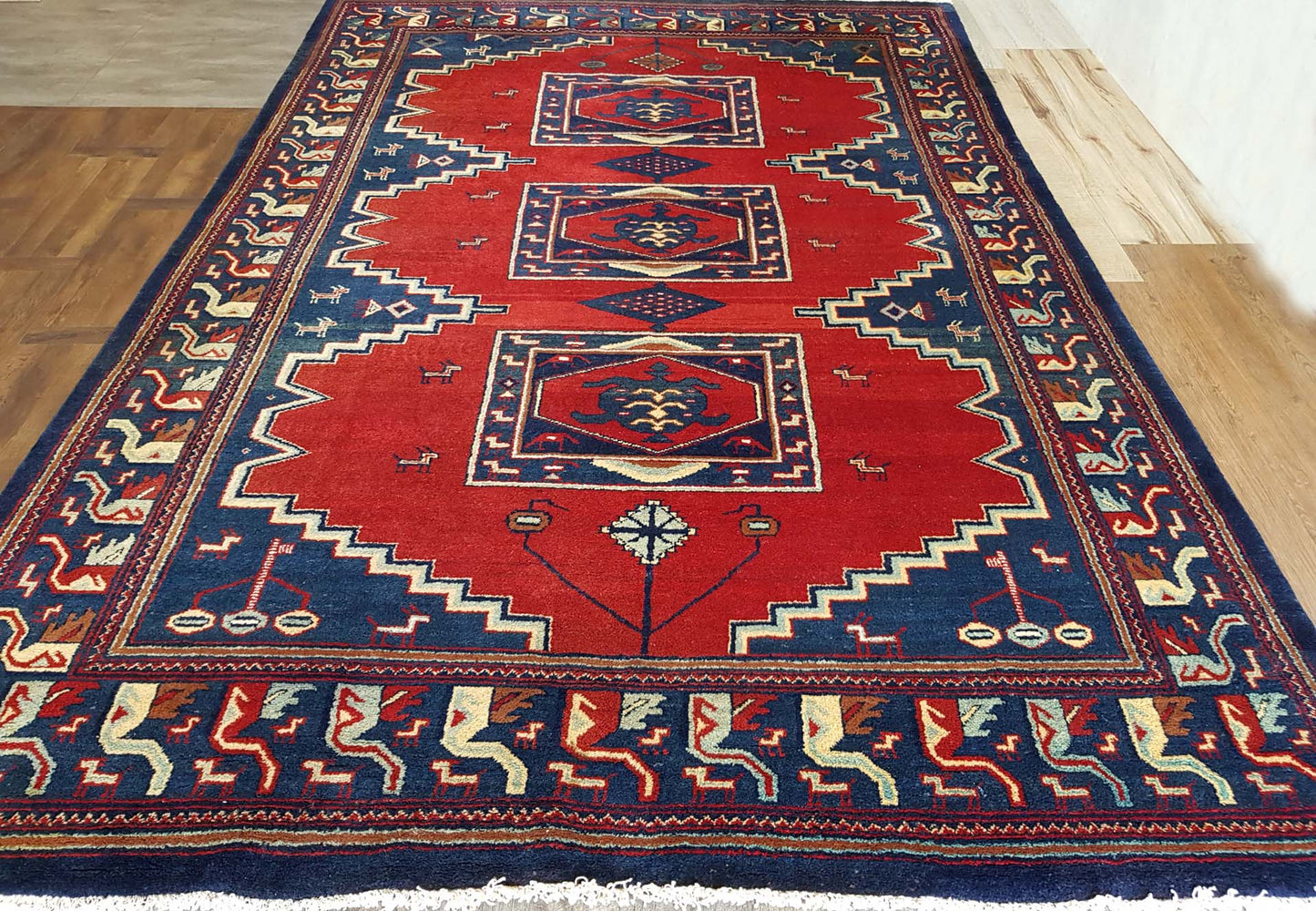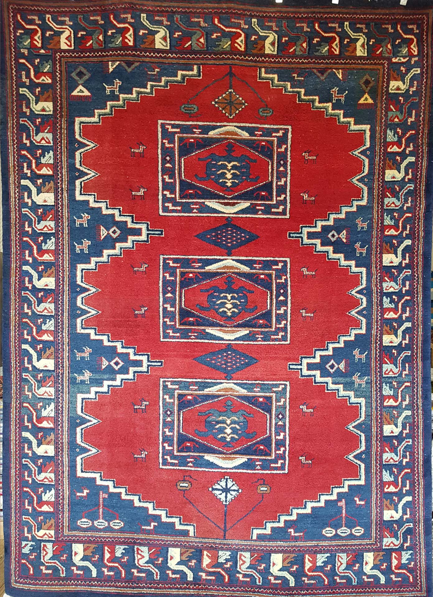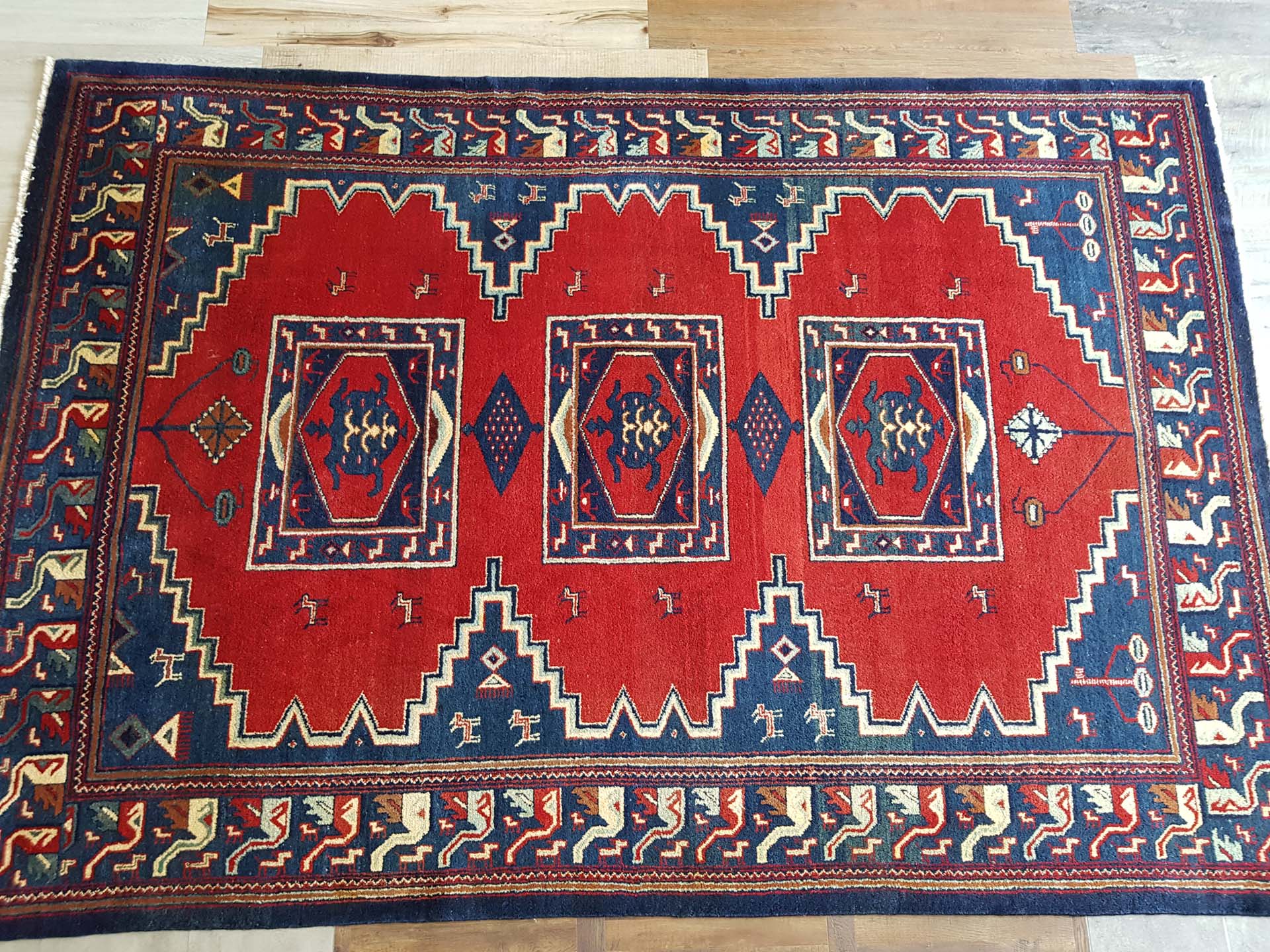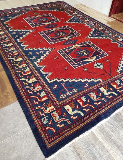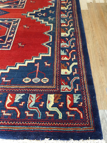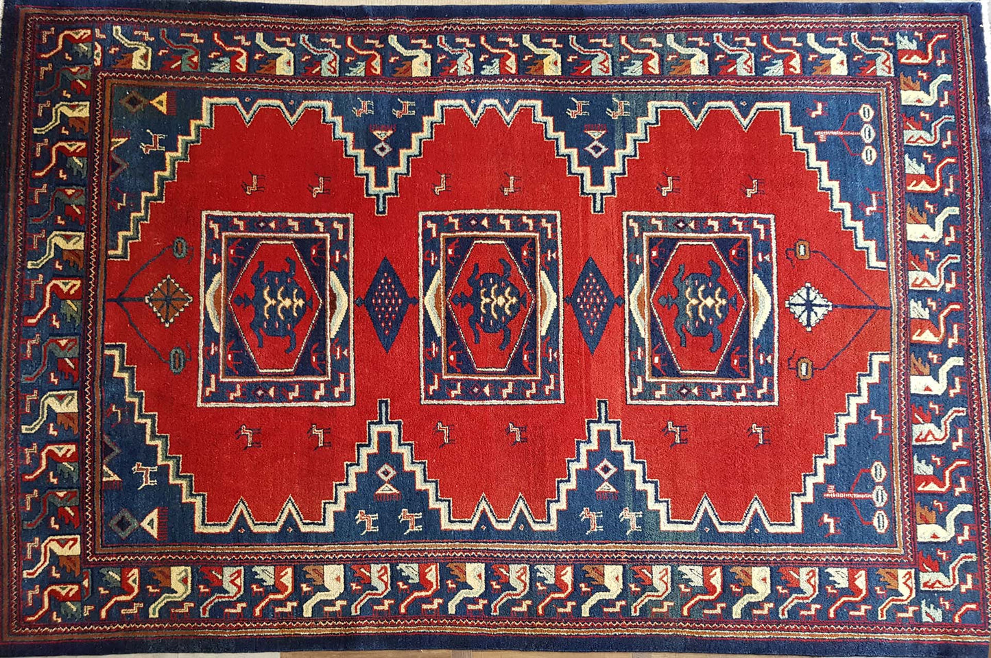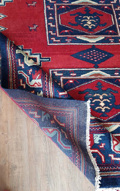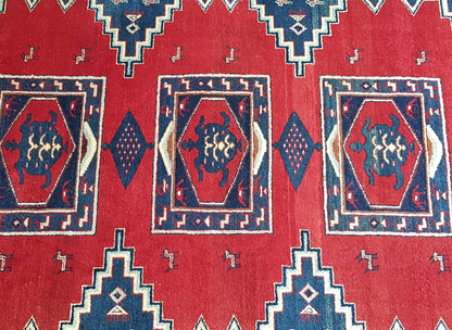 Visually striking, this rug features bold geometric patterns that are characteristic of Baluch designs. Dominated by deep reds and contrasting blues, the rug's central motifs resemble medallions, surrounded by intricate borders that add depth and complexity. The use of these vibrant colours and patterns not only highlights the rug's aesthetic appeal but also its cultural significance, as these designs often carry symbolic meanings and reflect the artistic traditions of the region.