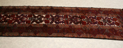 Hand-knotted by Baluch weavers in Afghanistan, this tribal runner captures the raw beauty and symbolism of nomadic design. A central column of abstract floral and geometric motifs runs the length of the rug, flanked by staggered tribal symbols that echo the traditions of storytelling through pattern.