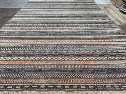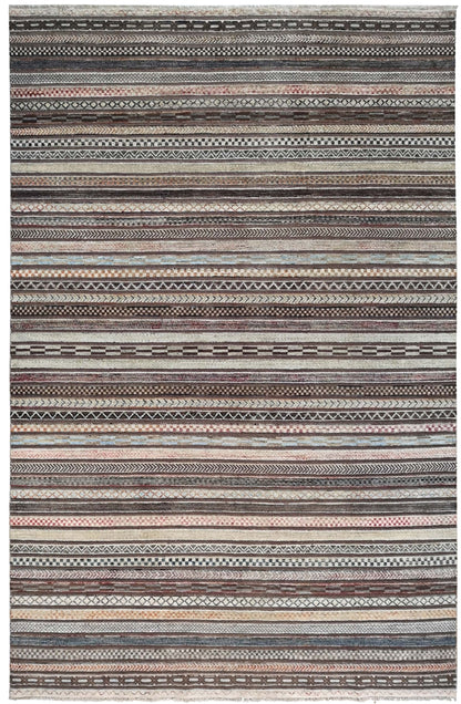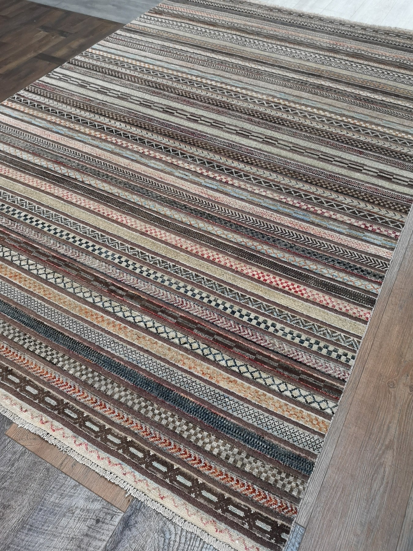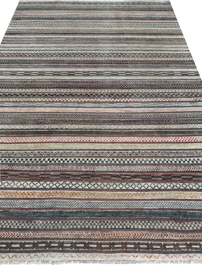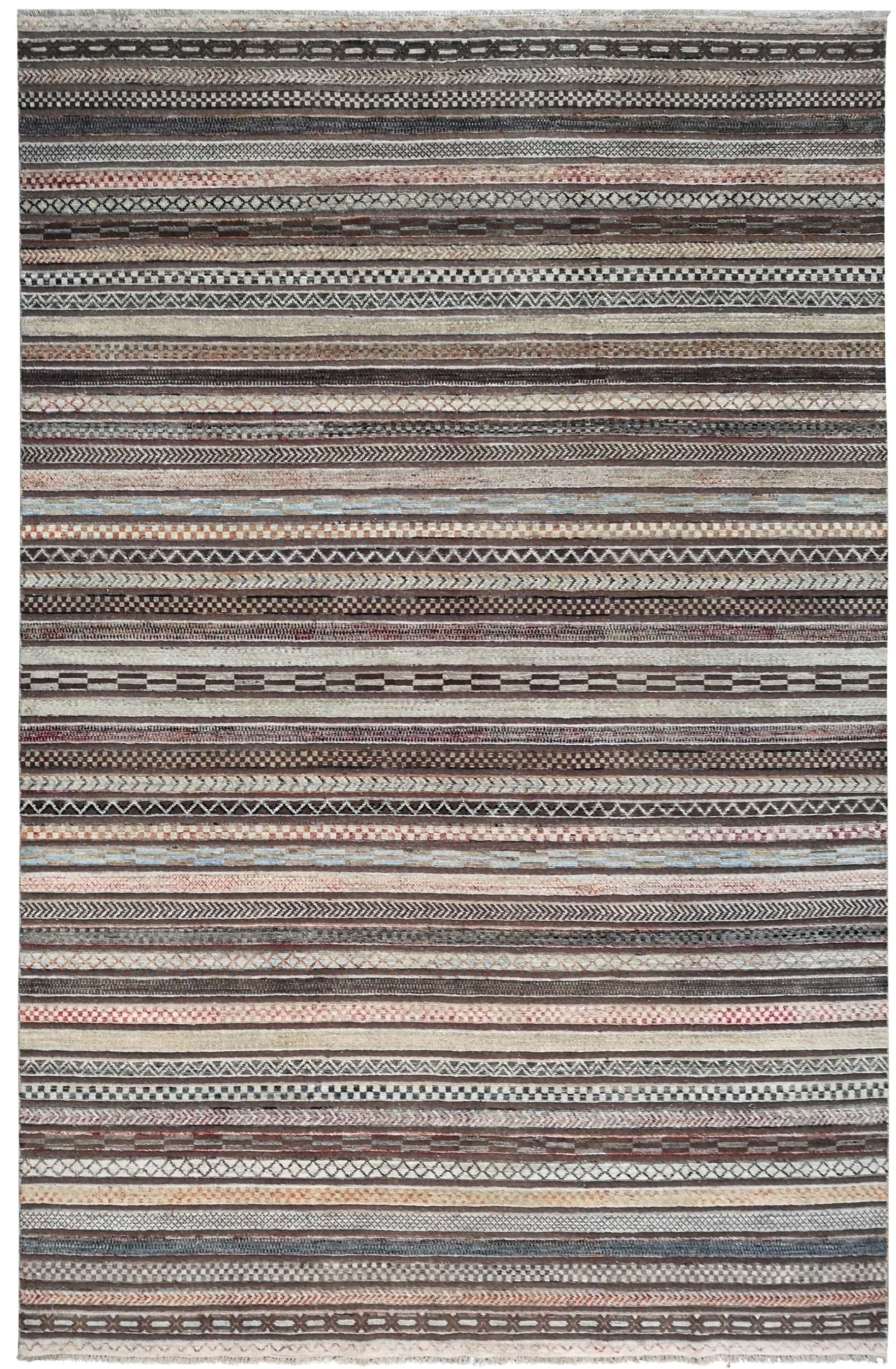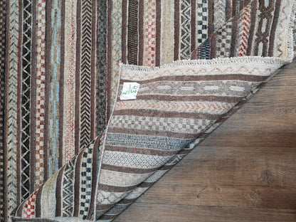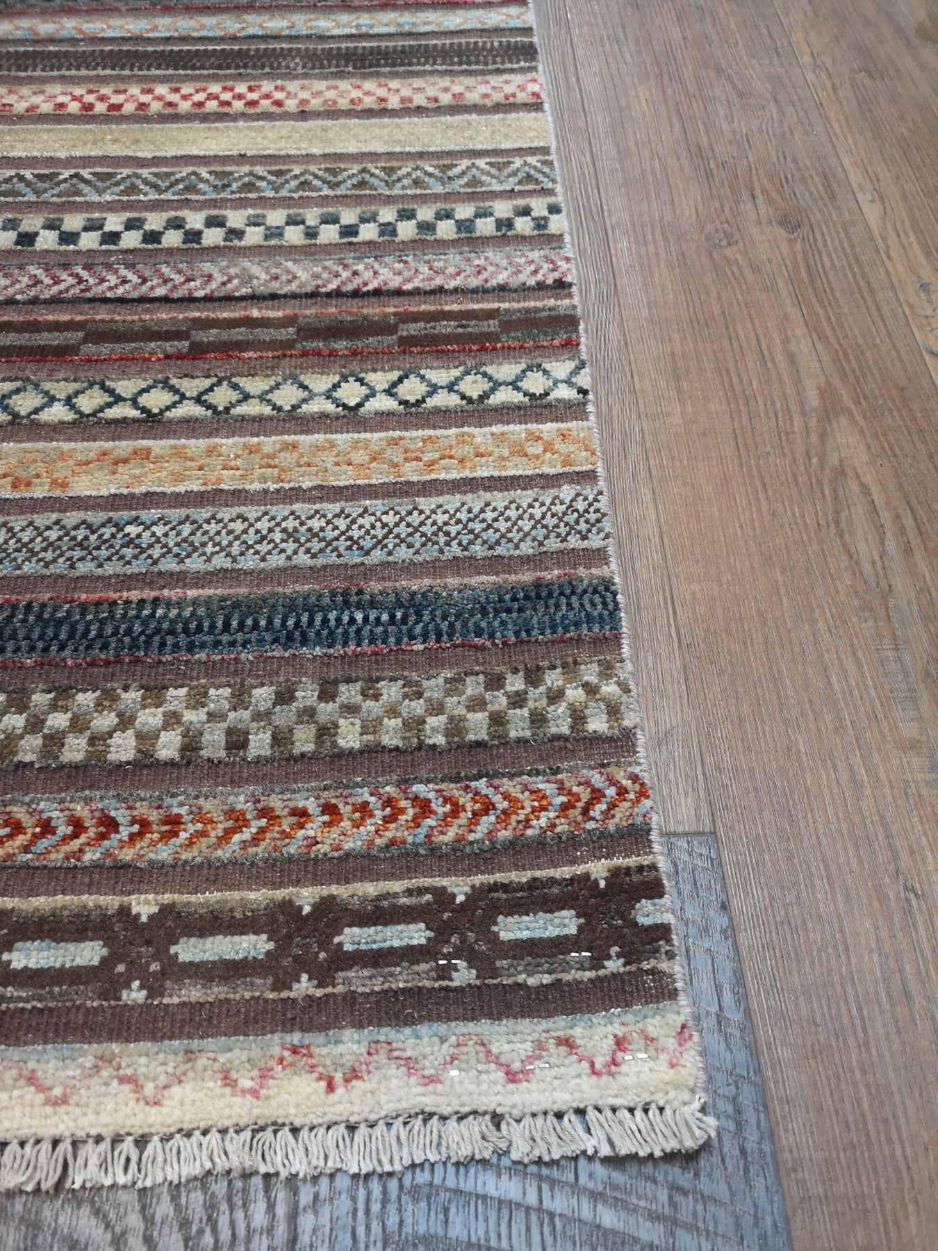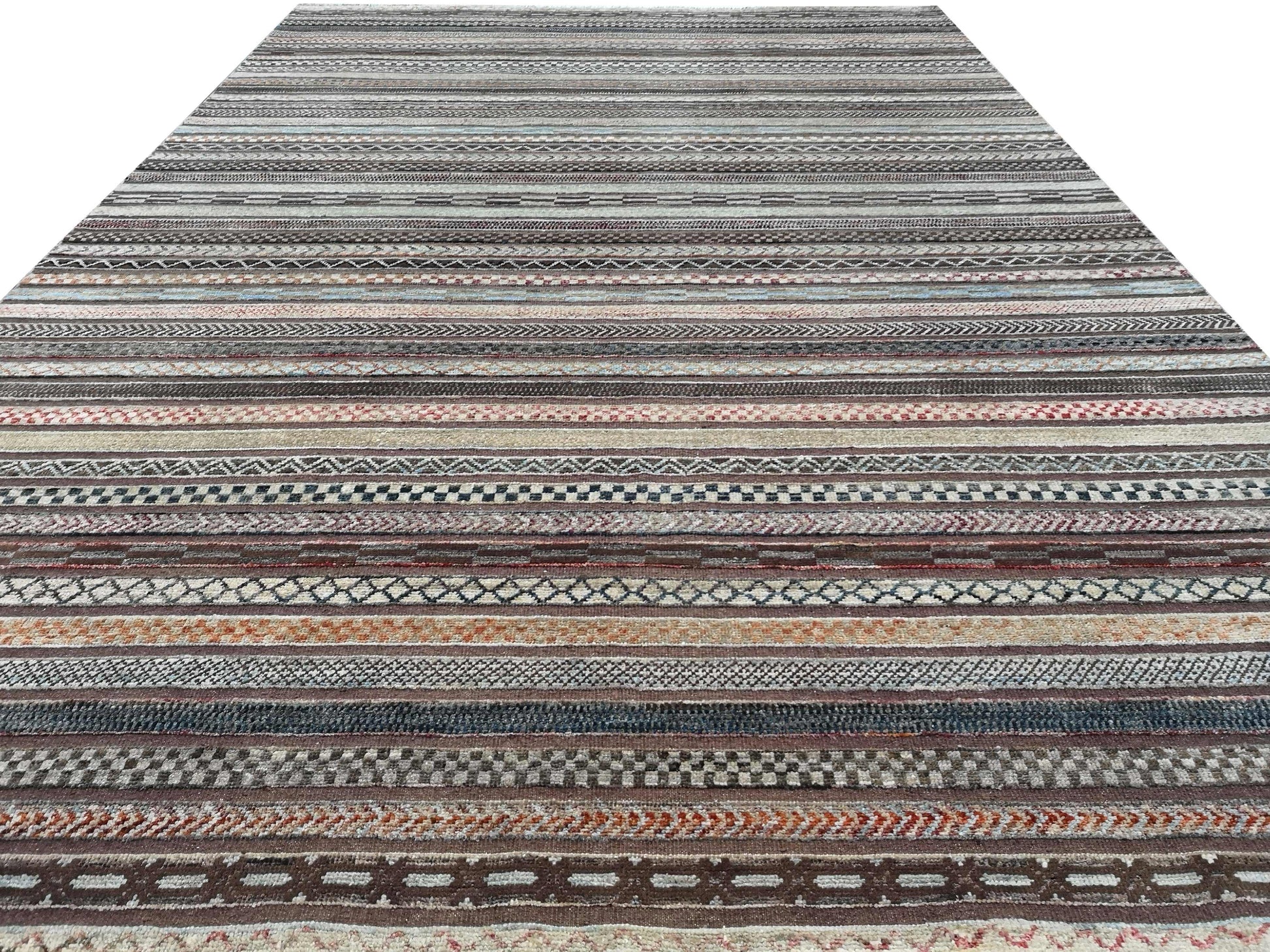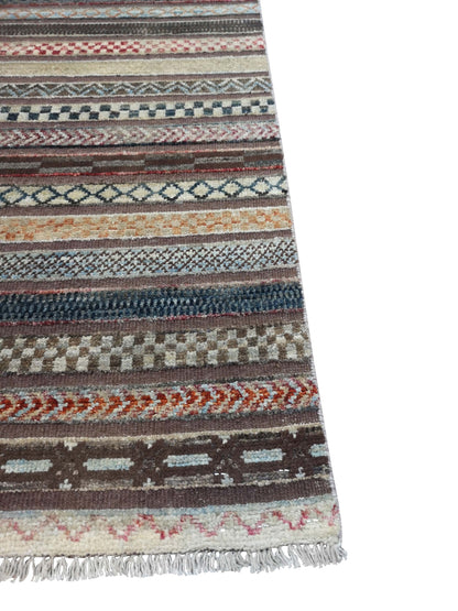 Hand-knotted in Barjasteh, Afghanistan, this tribal rug embodies the raw elegance of linear design. Its horizontal stripes carry motifs of zigzags, chevrons, and checkerboard patterns, arranged in a mirrored, geometric rhythm that speaks to the heart of tribal craftsmanship.