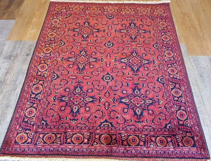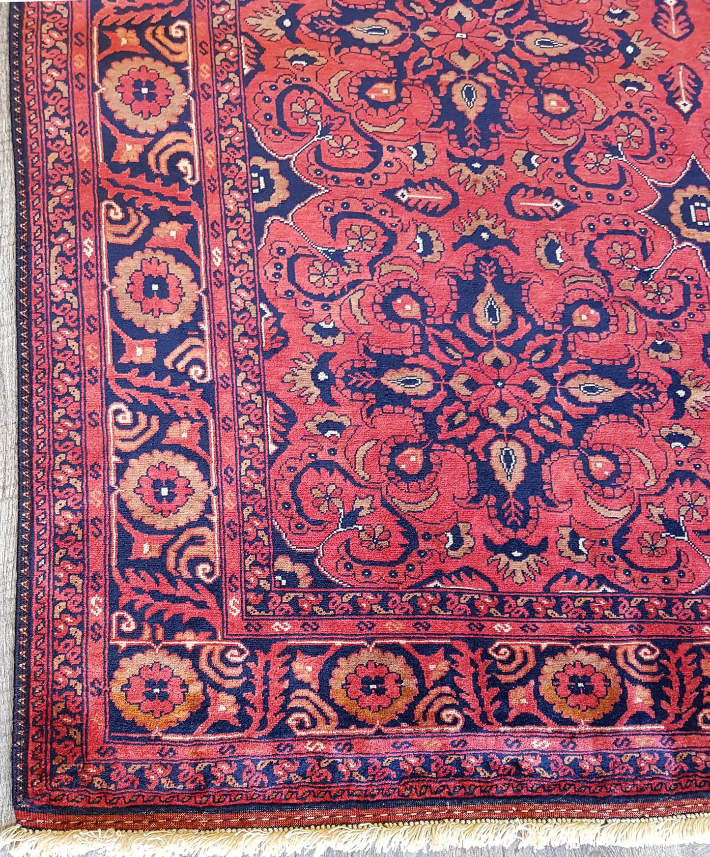 The coral red field is boldly contrasted by navy blue, beige, and soft accents of dark green and light blue. A navy border with scrolling vines and floral elements frames the piece, reinforced by delicately patterned guard bands.