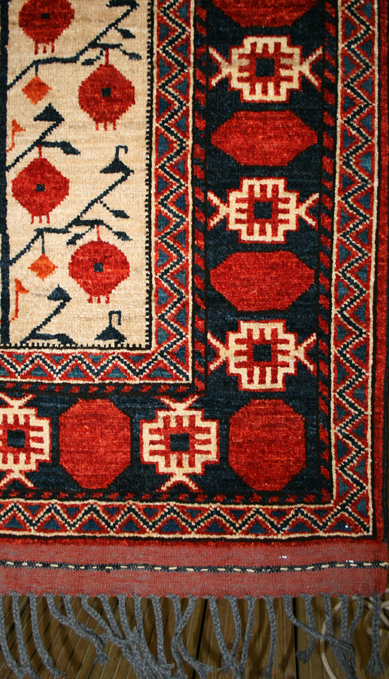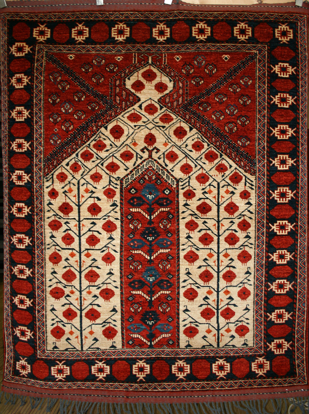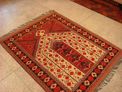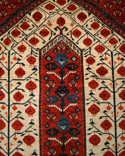 Hand-knotted by Ersari weavers in Afghanistan, this rug is a striking example of tribal symbolism and practical spirituality. Its prayer niche (mihrab) – framed by stylised pomegranates, vines, and geometric spandrels – creates a sense of structure and devotion, while the mirrored layout enhances its balance and clarity.