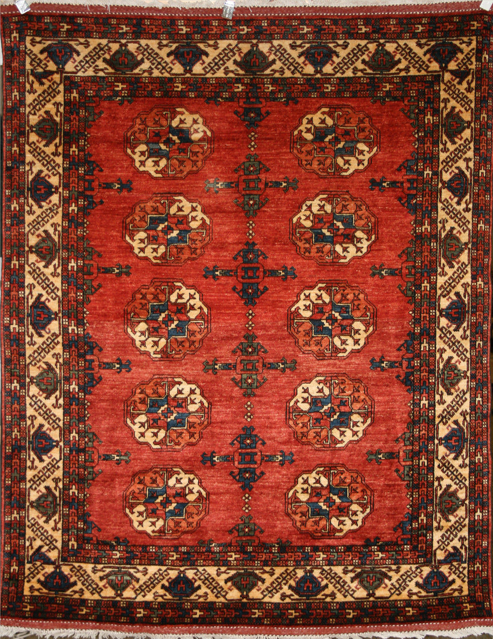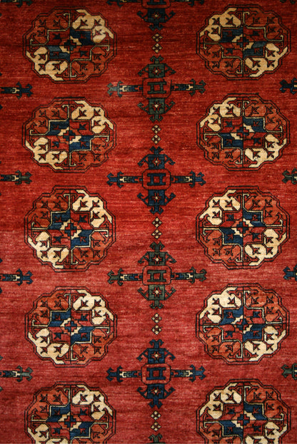 Hand-knotted by Ersari weavers in Afghanistan, this rug embodies the strength and symmetry of tribal design. A series of octagonal medallions, enriched with floral and geometric details, form a bold, repeating layout that speaks to the Ersari tradition of balance and symbolism. Stylised crosses and connecting motifs add layers of structure and meaning.