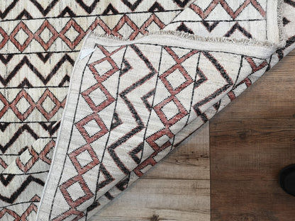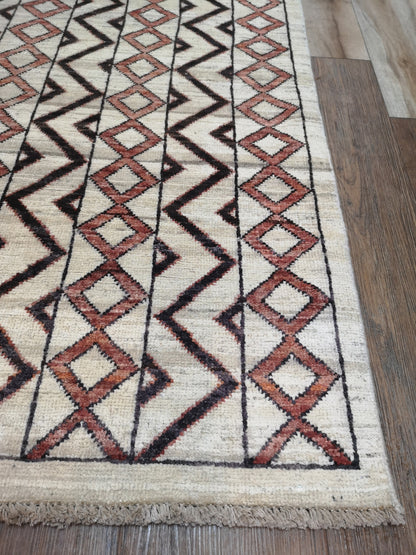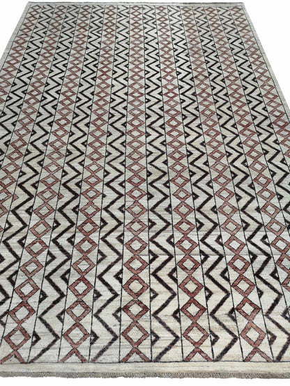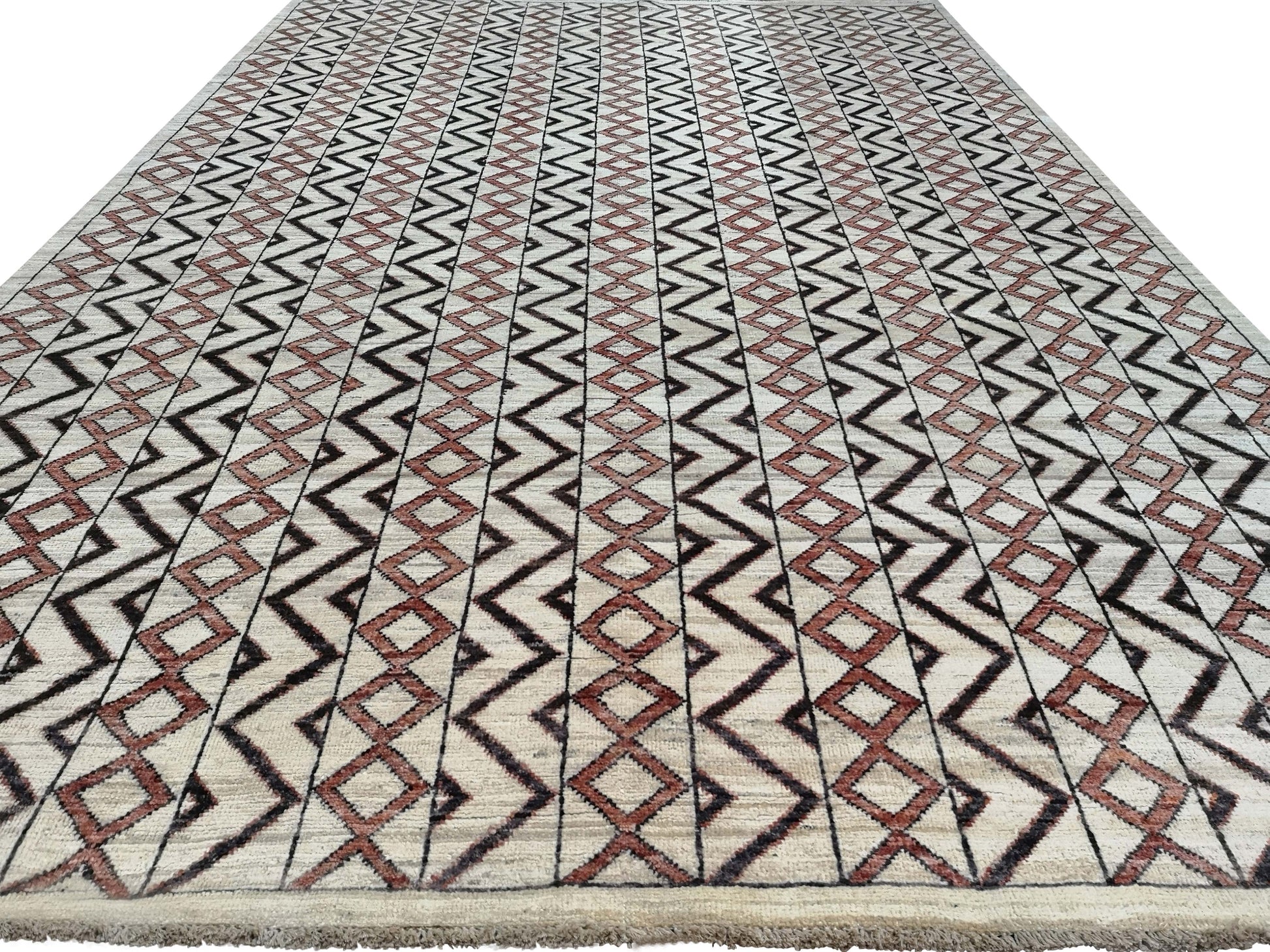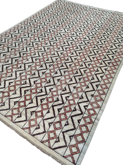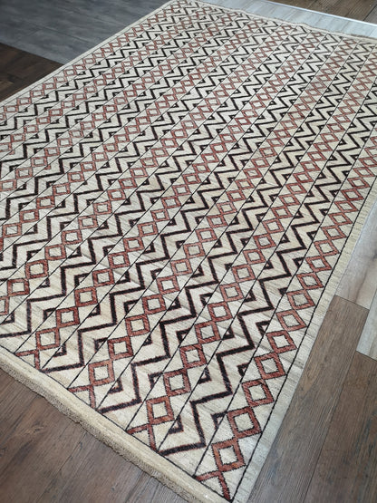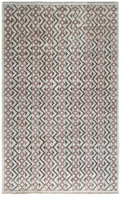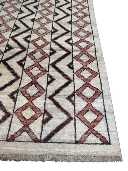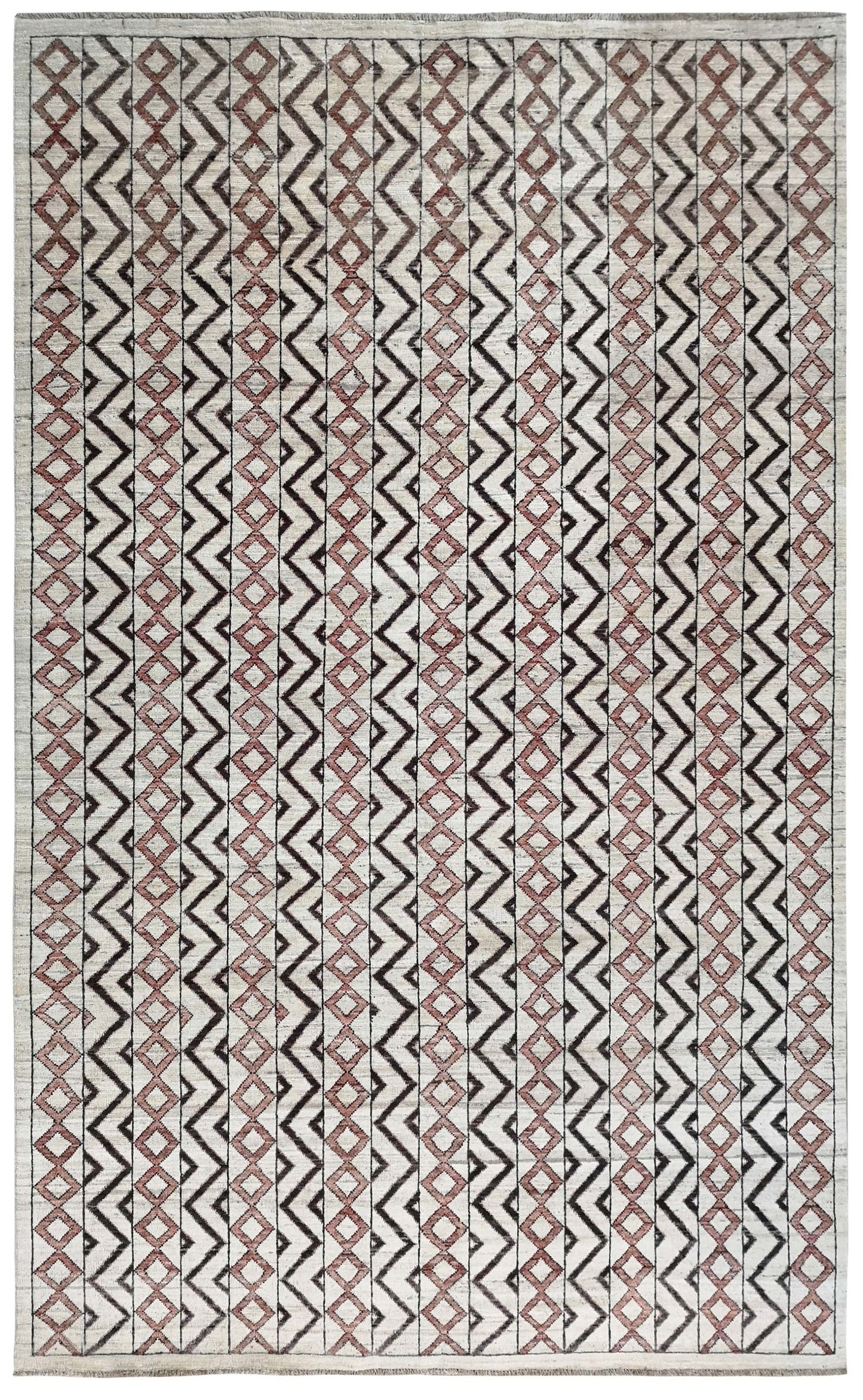 The design is structured yet organic, featuring vertical columns of zigzag lines and diamond shapes. This arrangement gives the rug a mirrored symmetry, creating a sense of continuity and flow. The muted cream and brown tones, accented with subtle reddish-brown, form an earthy palette that blends seamlessly into a variety of interiors, from minimalist to rustic.