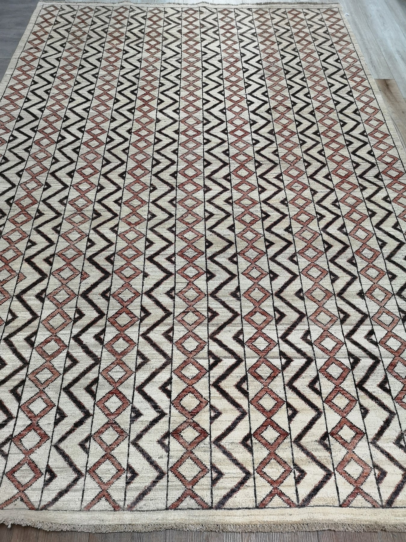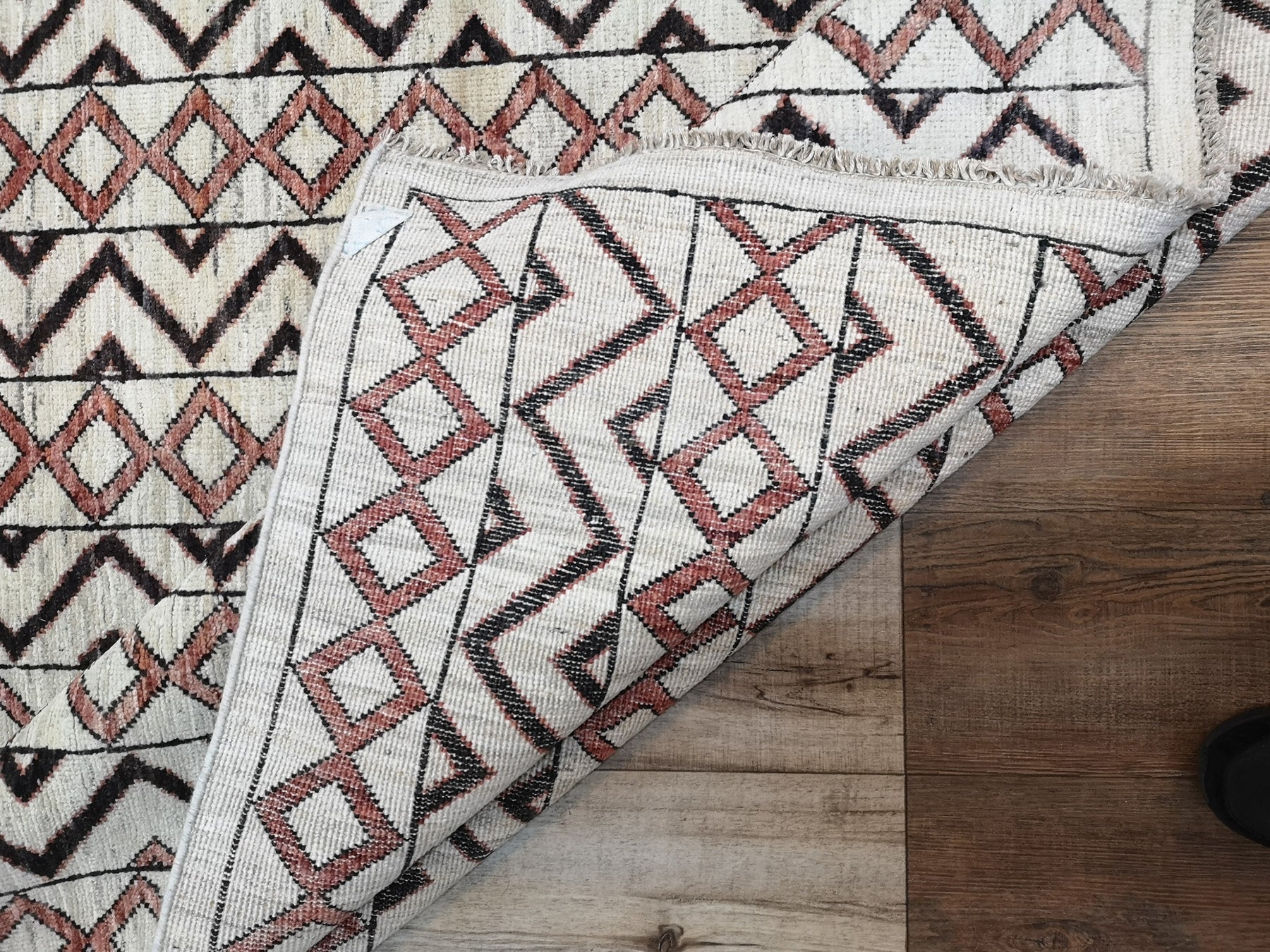 Handwoven from wool on a cotton foundation, this rug offers a soft texture and natural warmth. Its durability makes it well-suited for everyday use, whether as a statement piece in a living area or a grounding element in a bedroom.