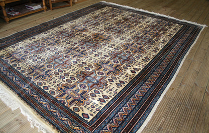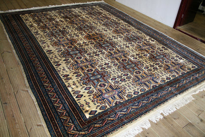 Framed by a dark, motif-rich border and flanked by finely detailed guard bands, the rug’s structure is both practical and decorative. Its earthy palette and geometric clarity make it a versatile choice for traditional or characterful interiors, grounding spaces with texture and heritage.