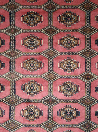 The salmon-pink field is contrasted by walnut brown, cream, and navy blue accents, creating a bold yet balanced aesthetic. A dark brown border, adorned with angular forms and framed by finely detailed guard bands, reinforces the rug’s symmetry and structure.