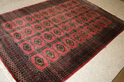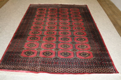 Hand-knotted in Jaldar, Afghanistan, this rug exemplifies the enduring appeal of tribal design. Its repeat medallion layout features octagonal guls—each enclosing a star-like motif—arranged in a mirrored, geometric formation that speaks to the region’s weaving traditions.