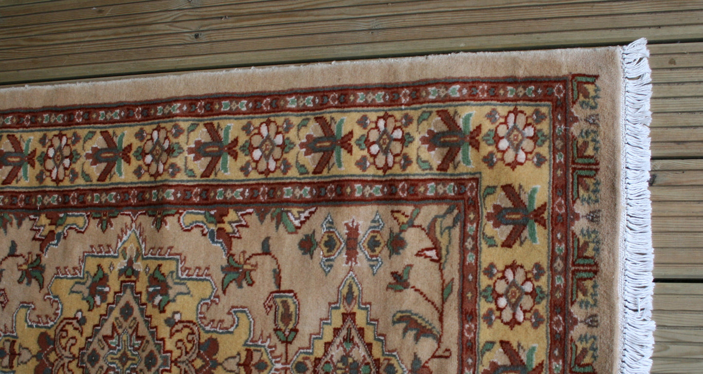 The warm palette of beige and golden yellow is enriched with rust red, sage green, and soft blue accents. A golden-toned border adorned with rosette and vine motifs provides a structured frame, enhanced by finely detailed guard bands.