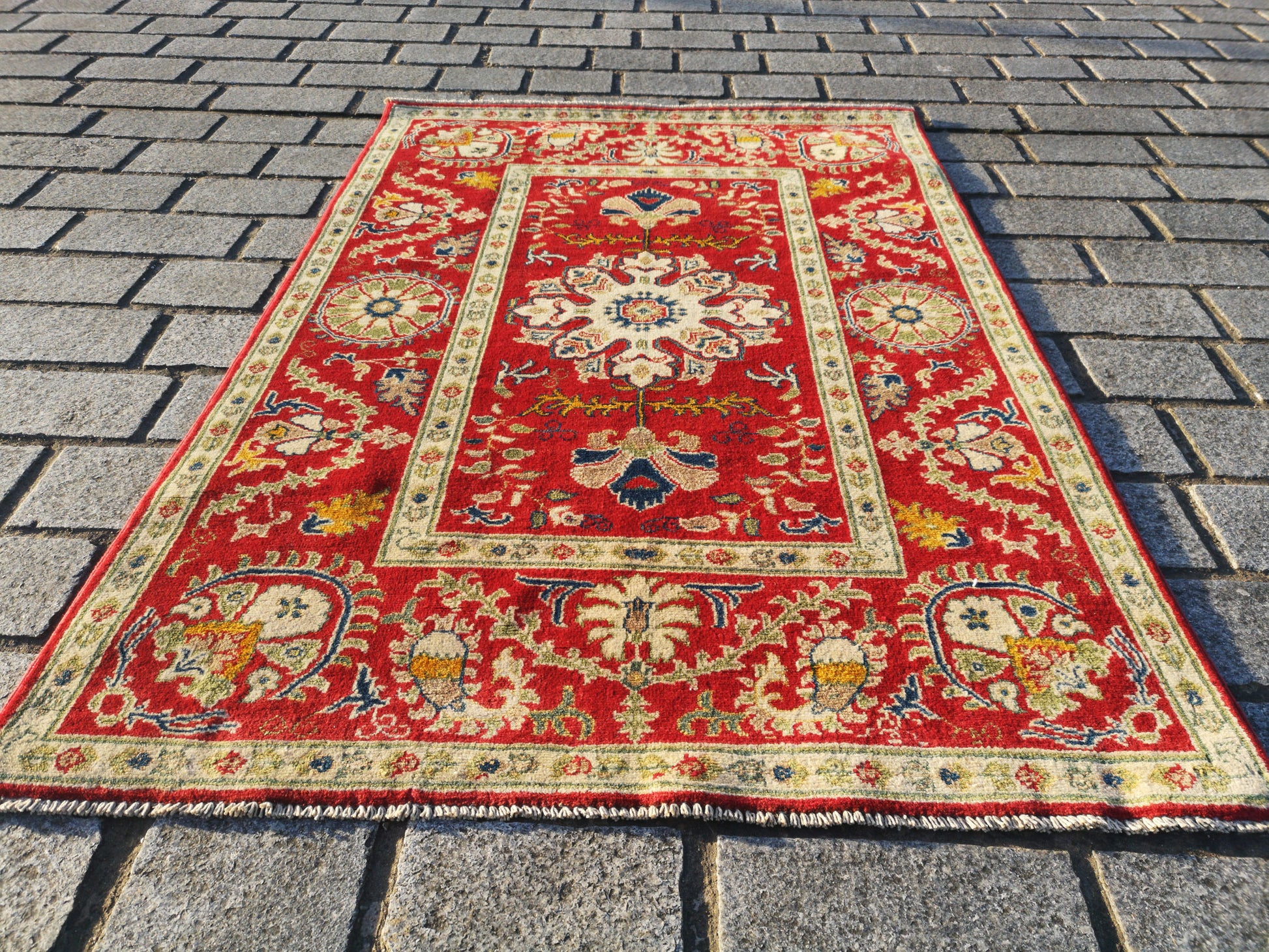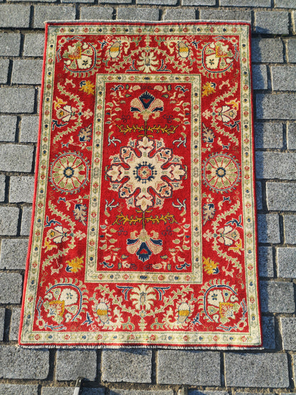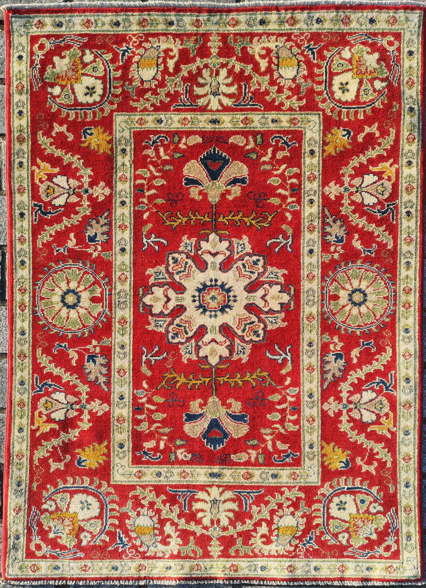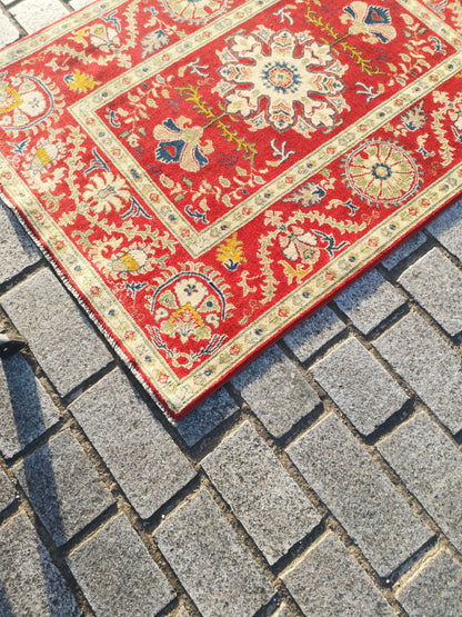 This hand-knotted Afghan Kazak rug captures the bold symmetry and rich symbolism of tribal design. At its centre lies a lobed medallion, surrounded by stylised palmettes, rosettes, and flowing floral elements that echo along both axes in perfect symmetry.
