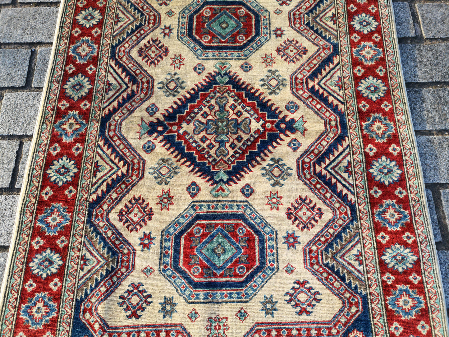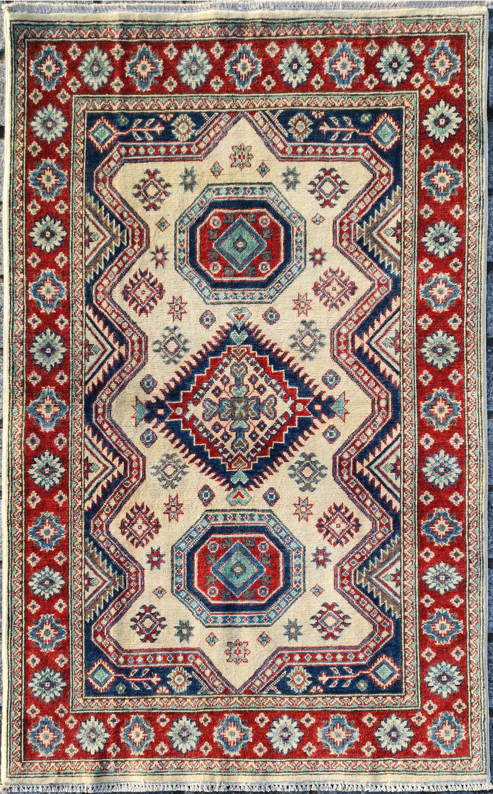 Hand-knotted in Afghanistan, this Kazak rug embodies the bold geometry and tribal spirit of its origins. A stepped octagonal medallion anchors the ivory field, surrounded by hooked diamonds, octagrams, and star-like motifs arranged in mirrored symmetry.