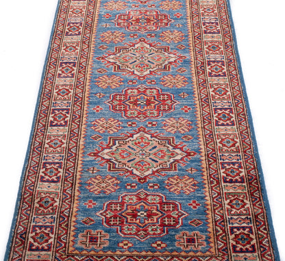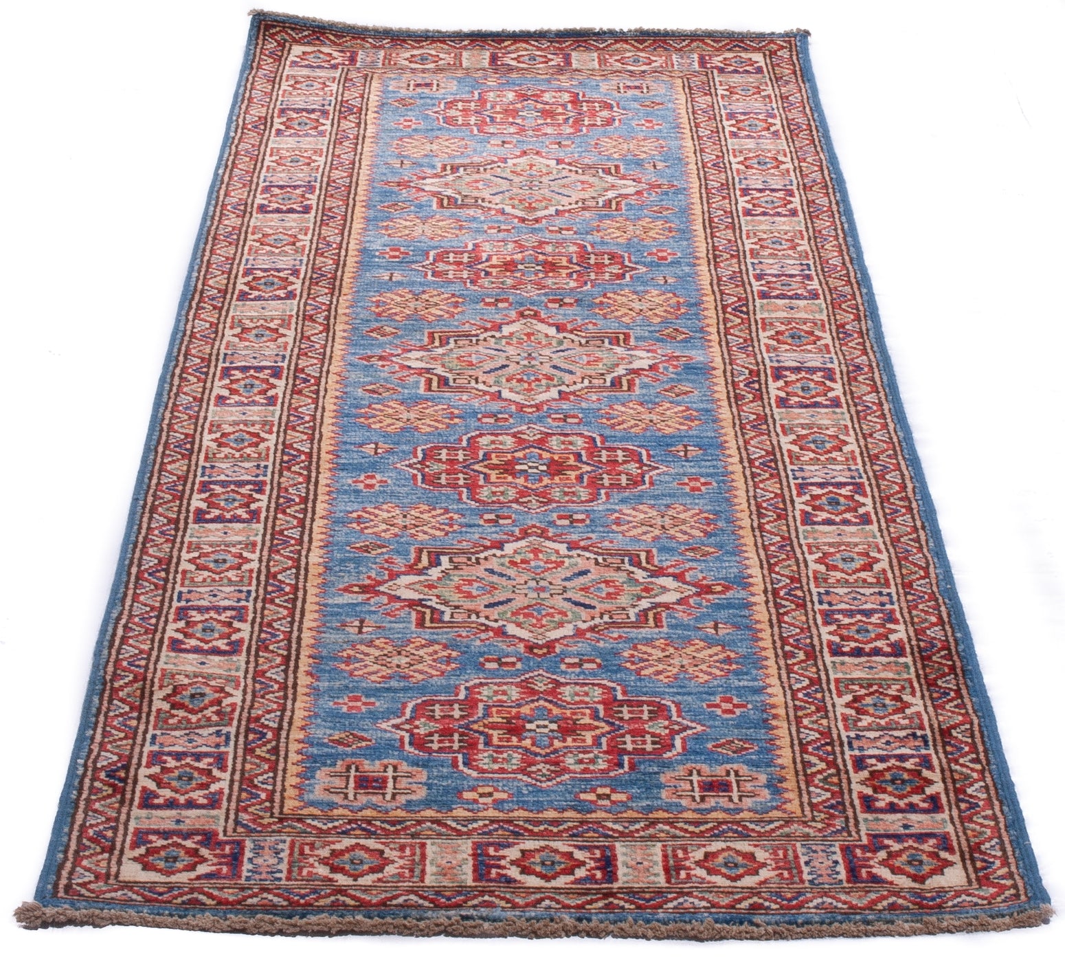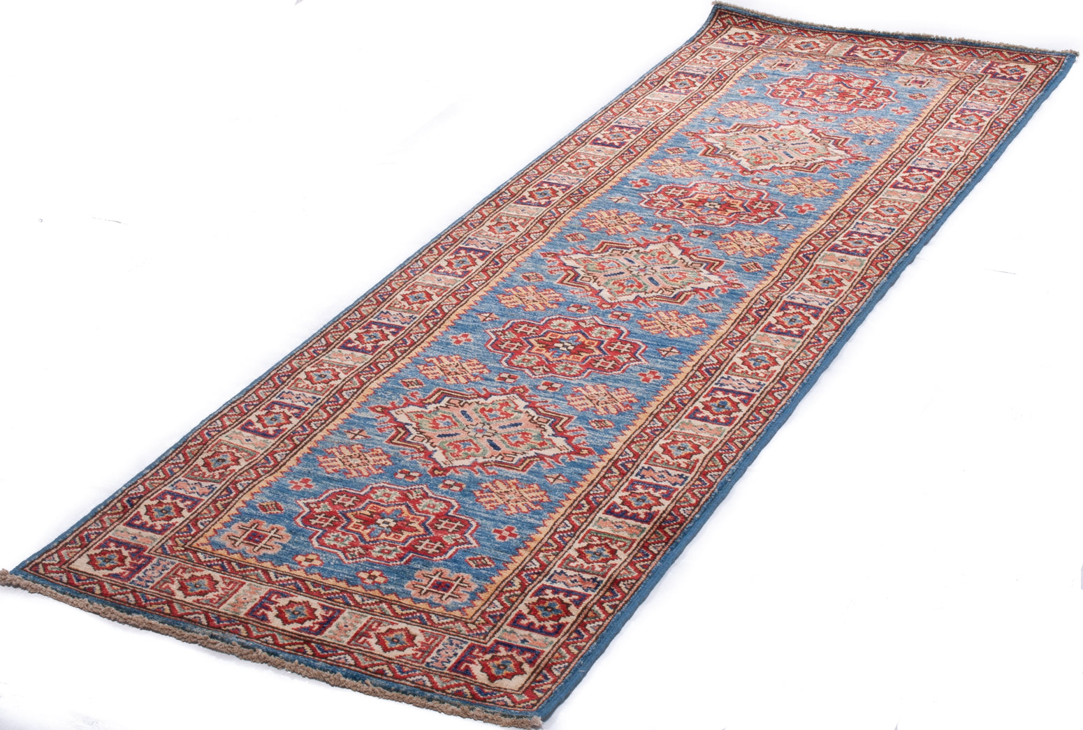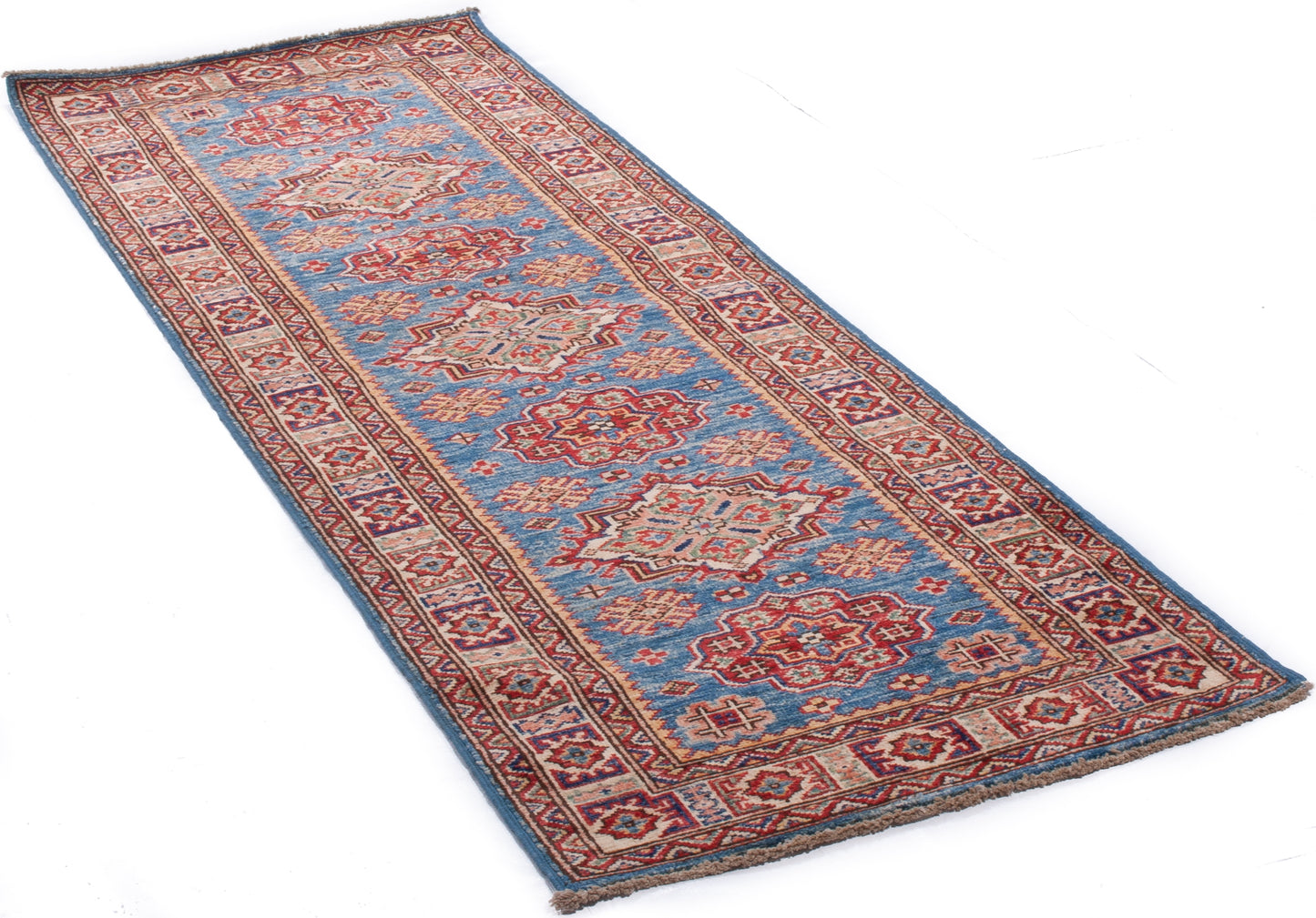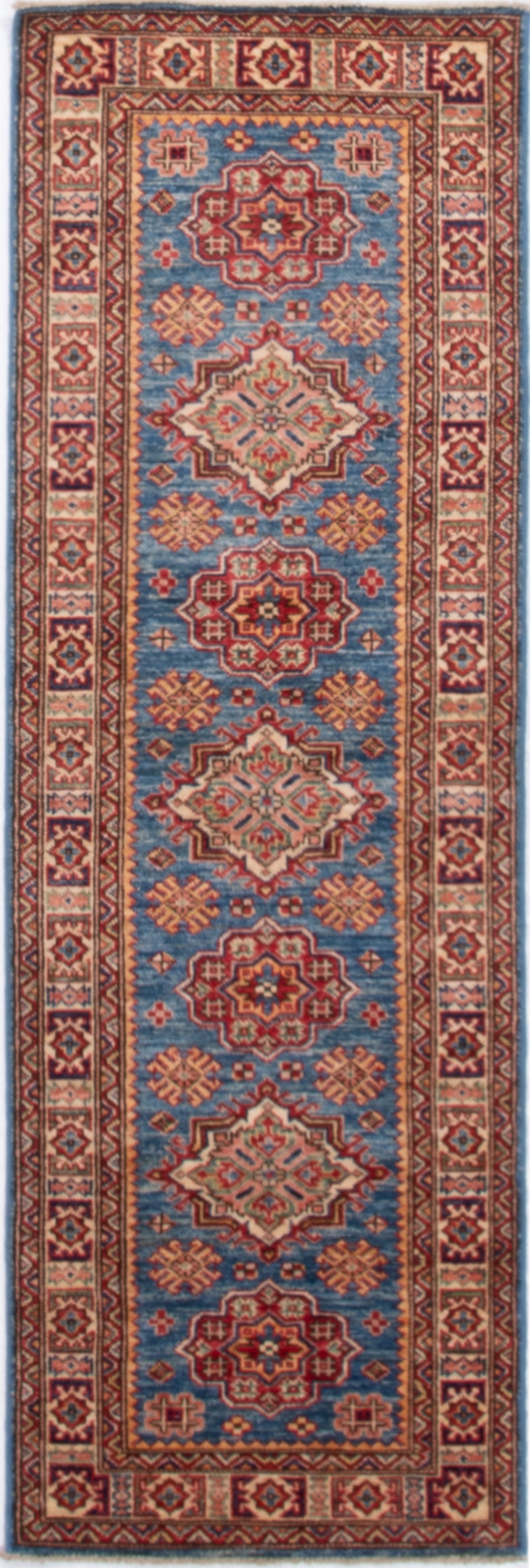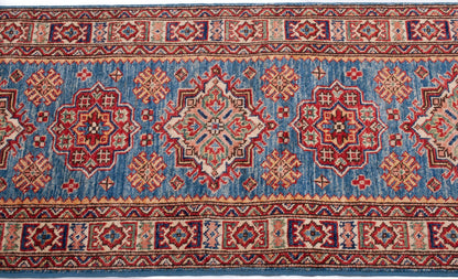 Hand-knotted in Afghanistan, this Kazak rug reflects the bold geometry and rhythmic repetition of tribal design. A series of star-shaped medallions runs through the slate blue field, framed by octagrams, crosses, and hooked forms that echo age-old symbolism. The earthy palette of brick red, ivory, mustard yellow, and sage green lends the piece a grounded character, while the ivory-accented border reinforces its structure with repeating star motifs.