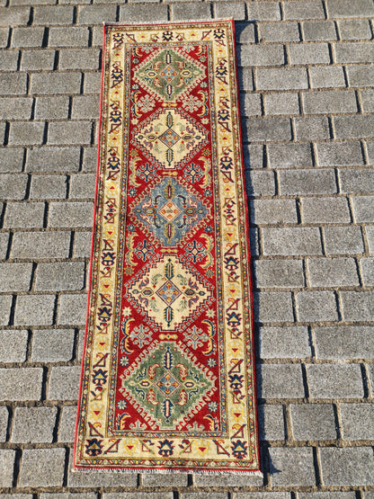 This Afghan Kazak runner channels the bold geometry and tribal spirit of Caucasian rug design, reimagined through Afghan craftsmanship. A series of diamond-shaped medallions, adorned with stylised floral forms and star motifs, march along the central axis in a striking display of symmetry and repetition.