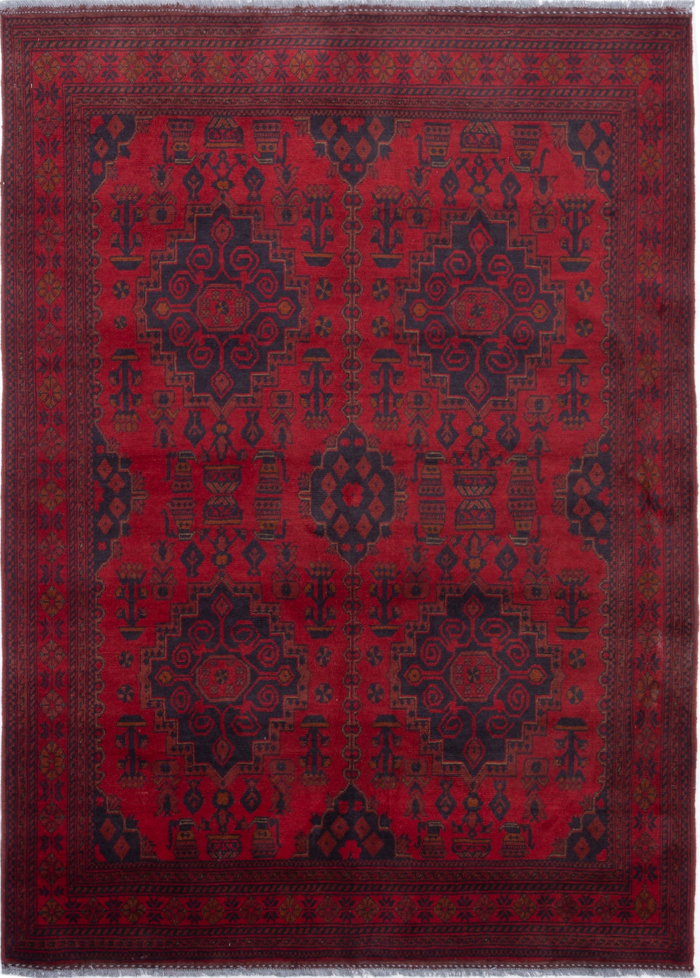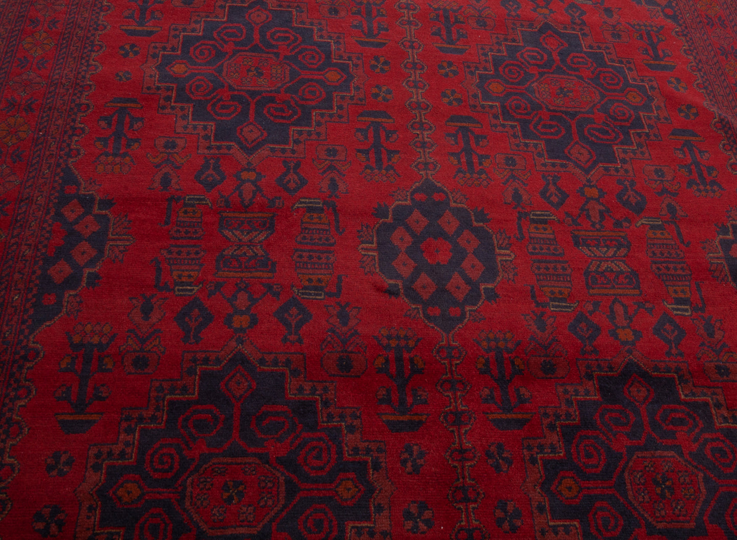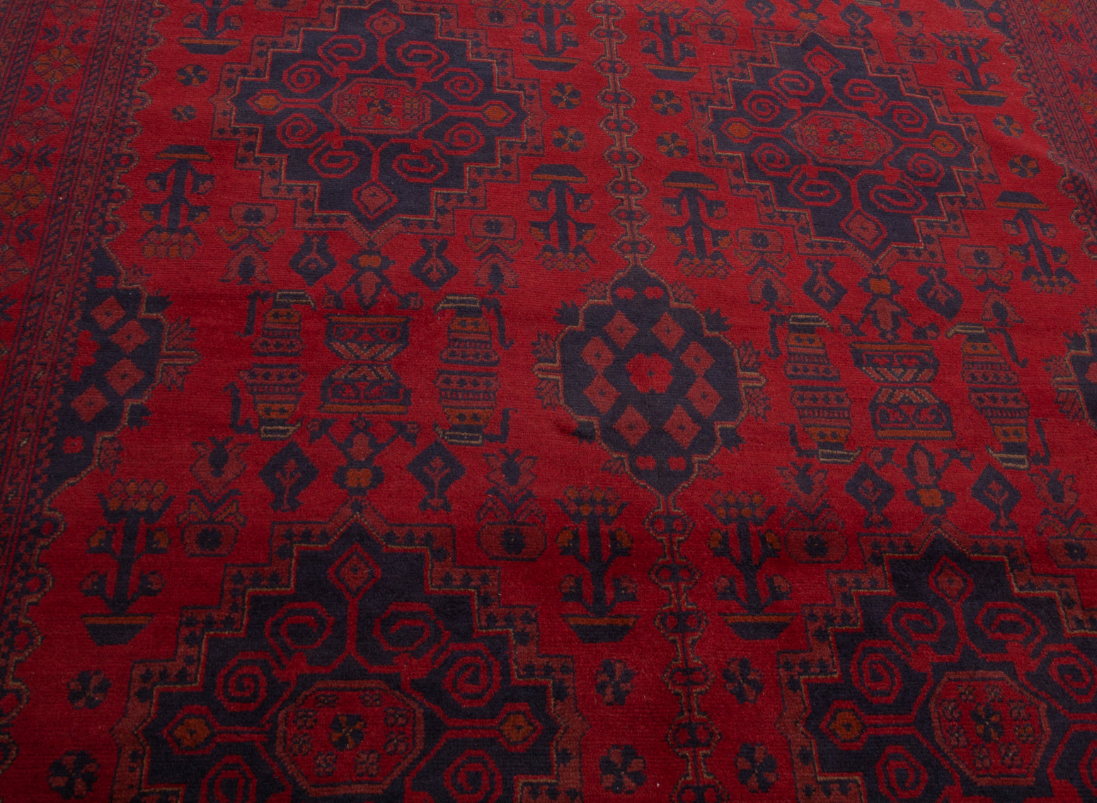 This hand-knotted Khal Mohammadi rug from Afghanistan captures the bold elegance of tribal design, rooted in the weaving traditions of northern Afghan Turkmen. Its repeat medallion layout blends geometric precision with floral symbolism, creating a striking sense of balance and rhythm.