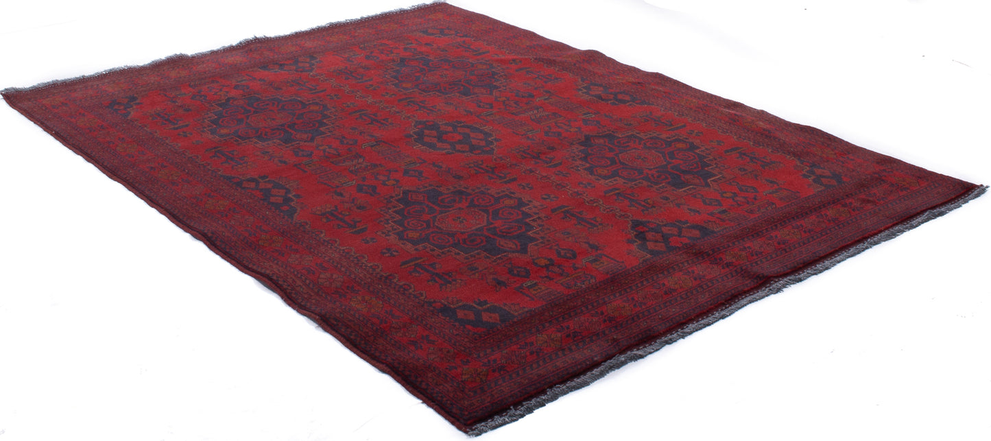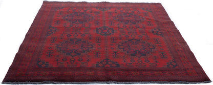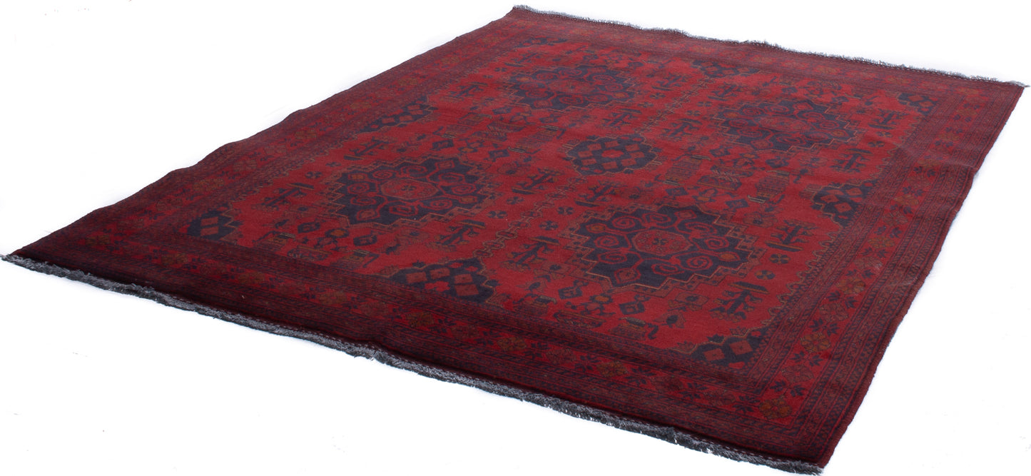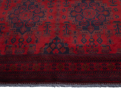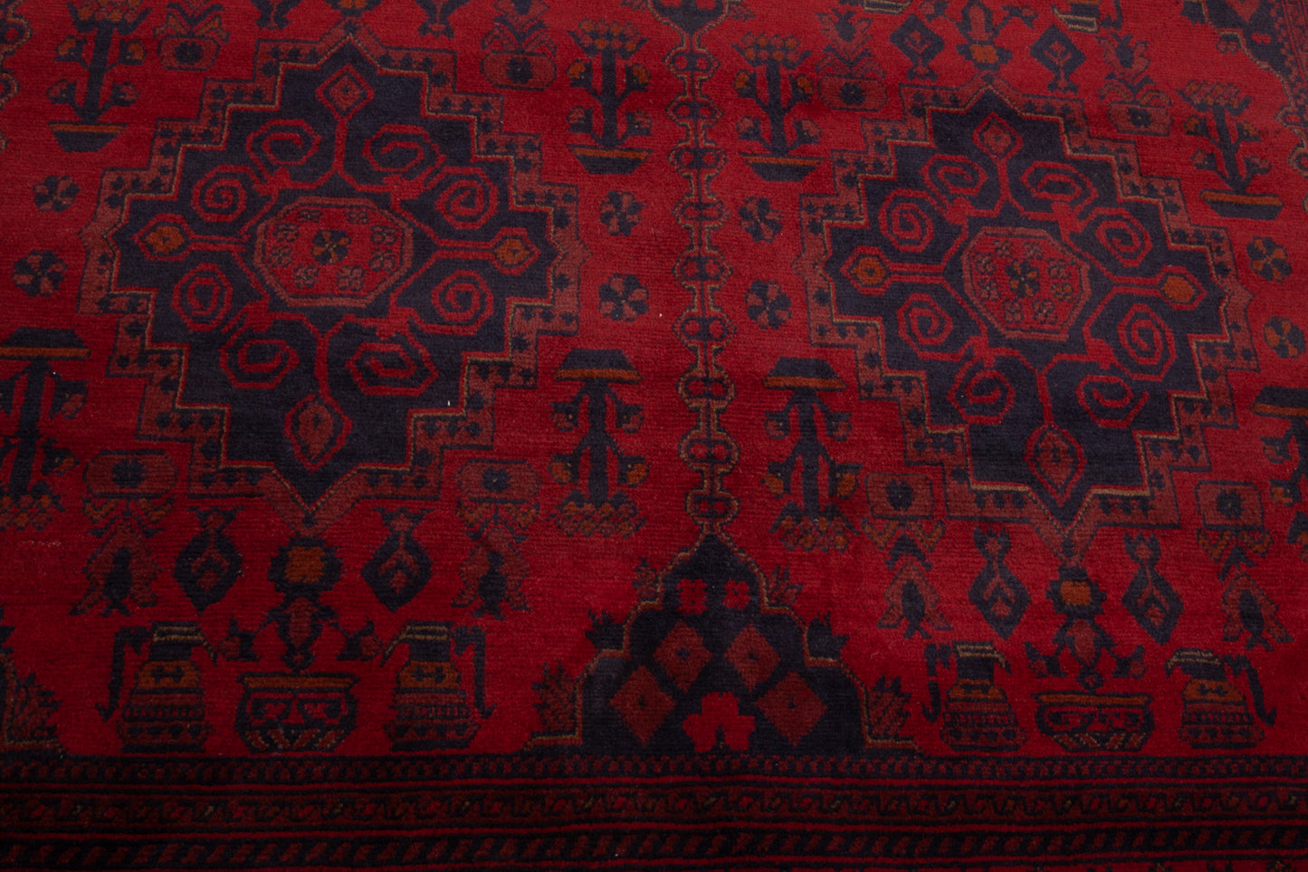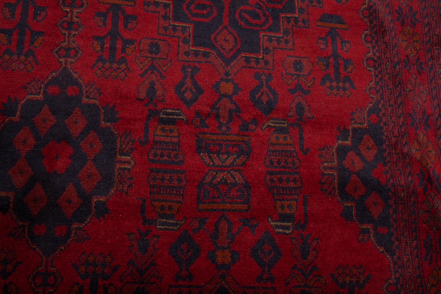 This hand-knotted Khal Mohammadi rug from Afghanistan captures the bold elegance of tribal design, rooted in the weaving traditions of northern Afghan Turkmen. Its repeat medallion layout blends geometric precision with floral symbolism, creating a striking sense of balance and rhythm.
