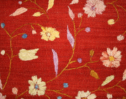 This Afghan Kilim cushion brings the artistry of traditional weaving into a compact, character-rich form. Handwoven in Afghanistan, it features a flowing arrangement of stylised blossoms and delicate stems, mirrored across a rich crimson field.