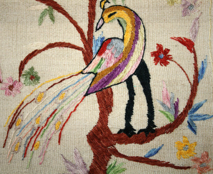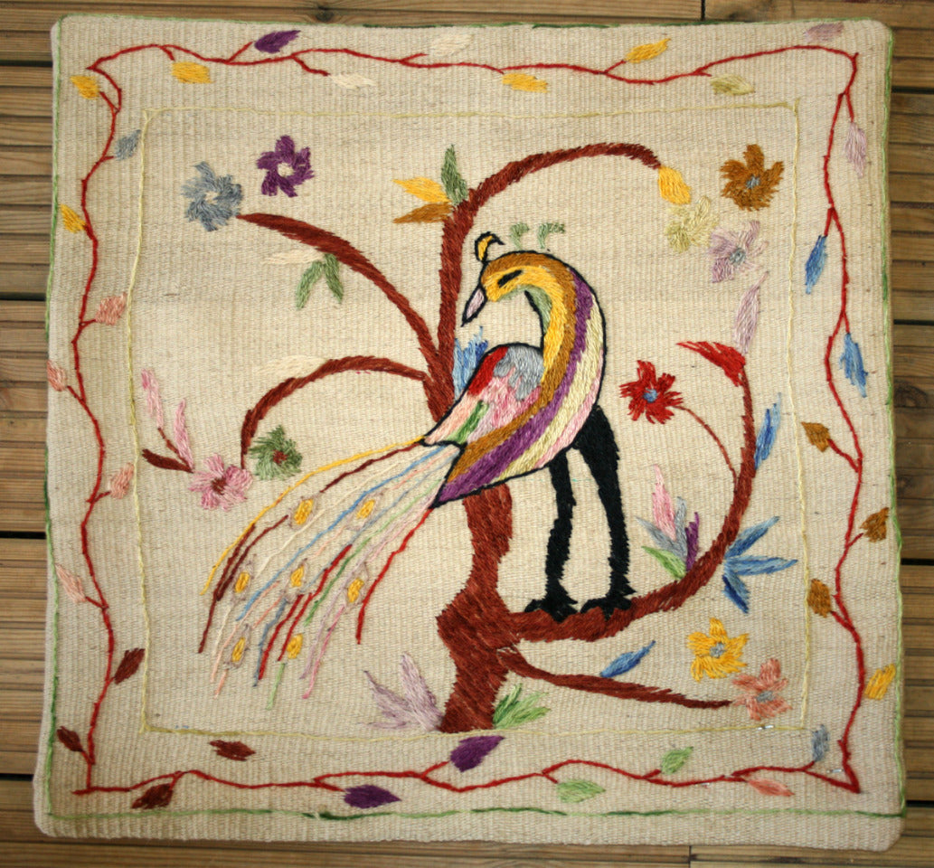 This Afghan Kilim cushion brings storytelling to life through weave, featuring a stylised bird—perhaps a phoenix—perched amidst flowing branches and delicate blossoms. The asymmetrical, pictorial design captures a sense of movement and myth, set against a cream field that amplifies the warmth of its mustard, lavender, and pink accents.