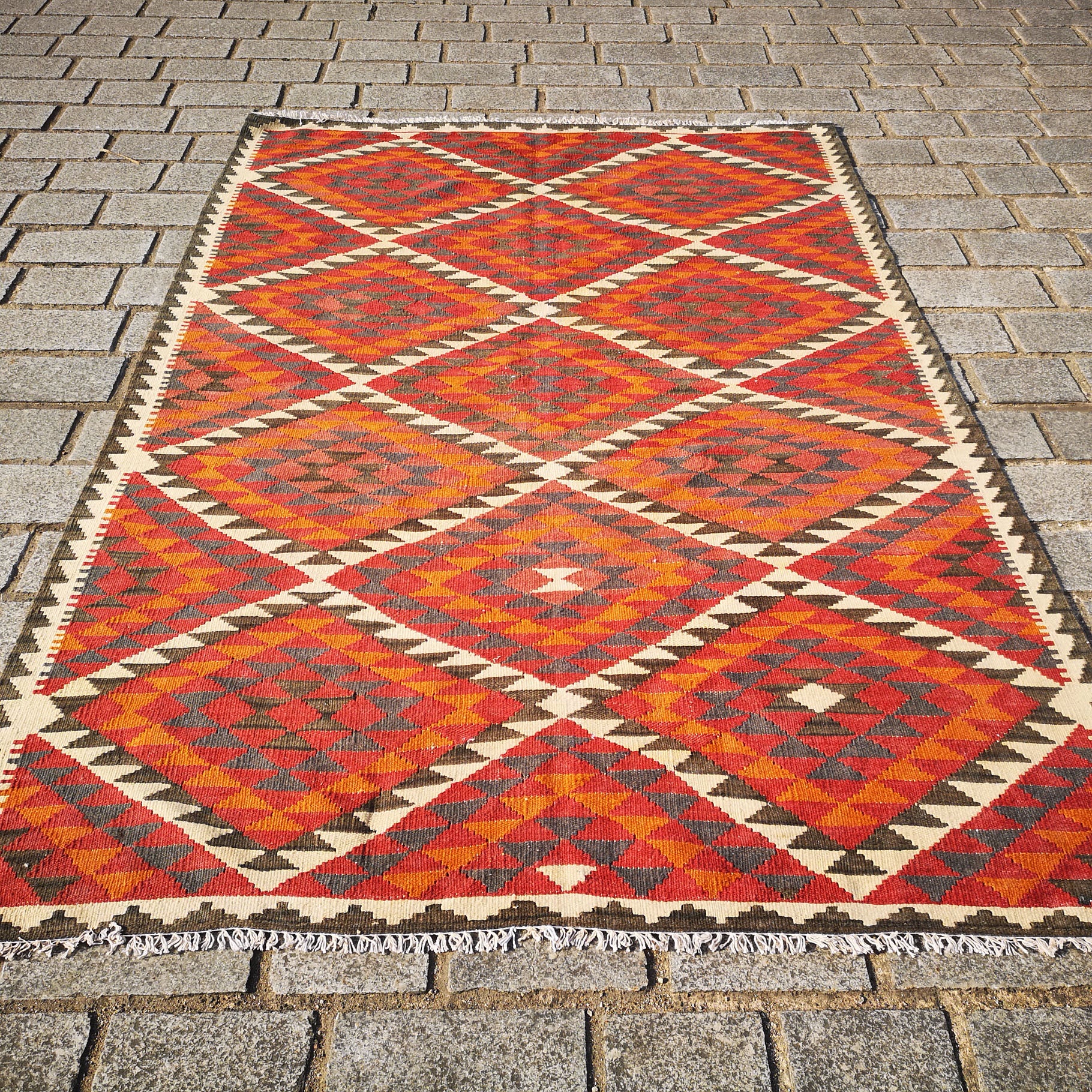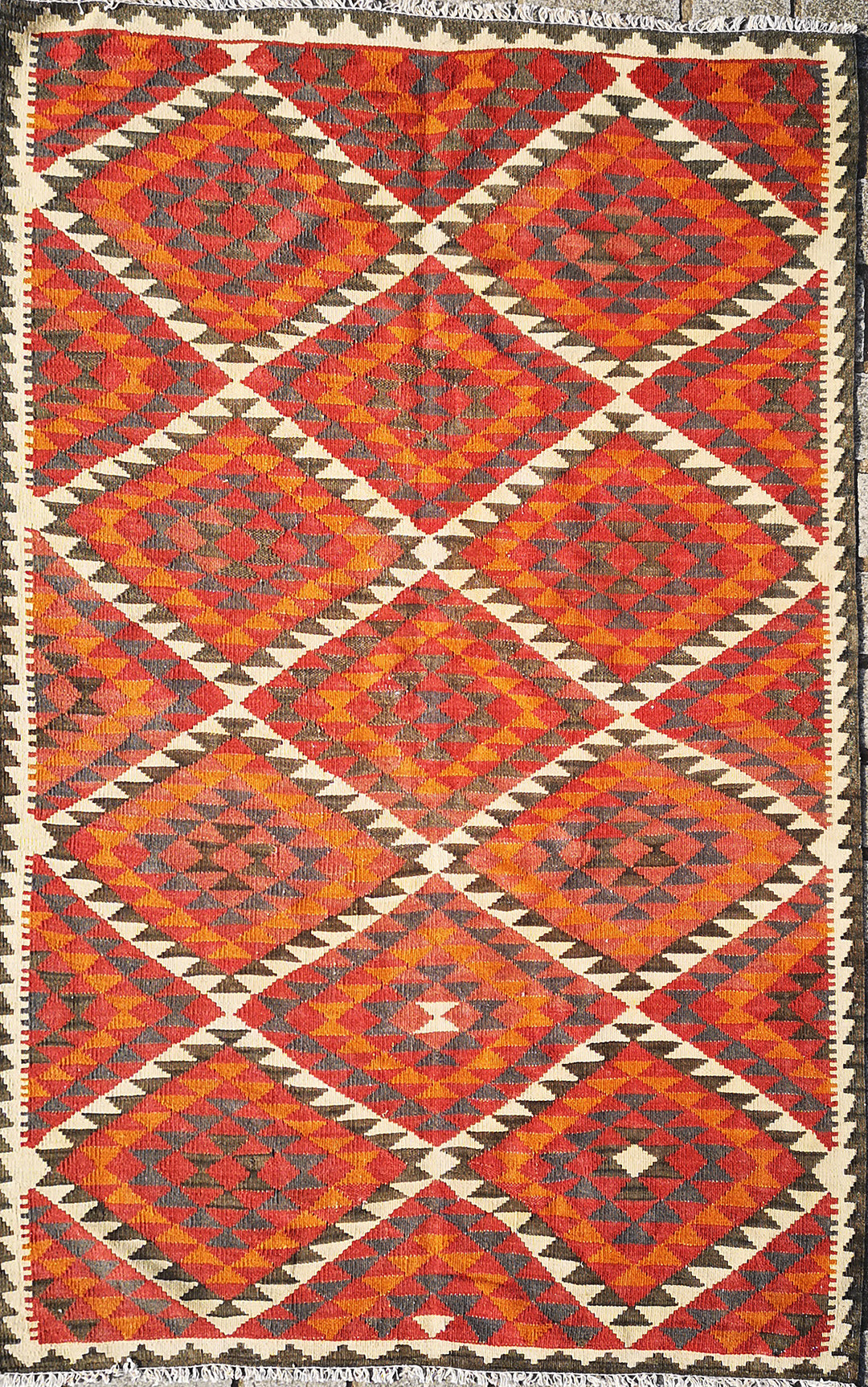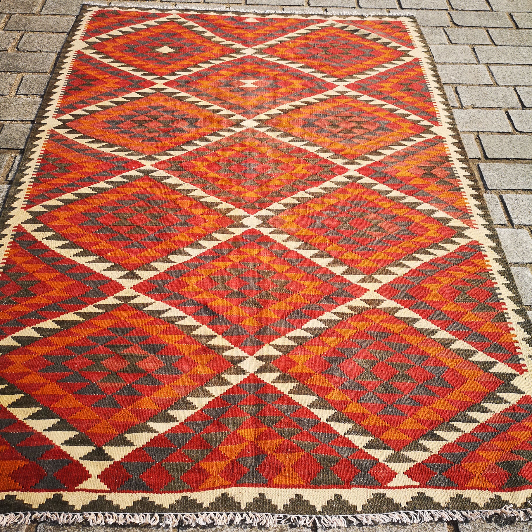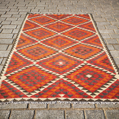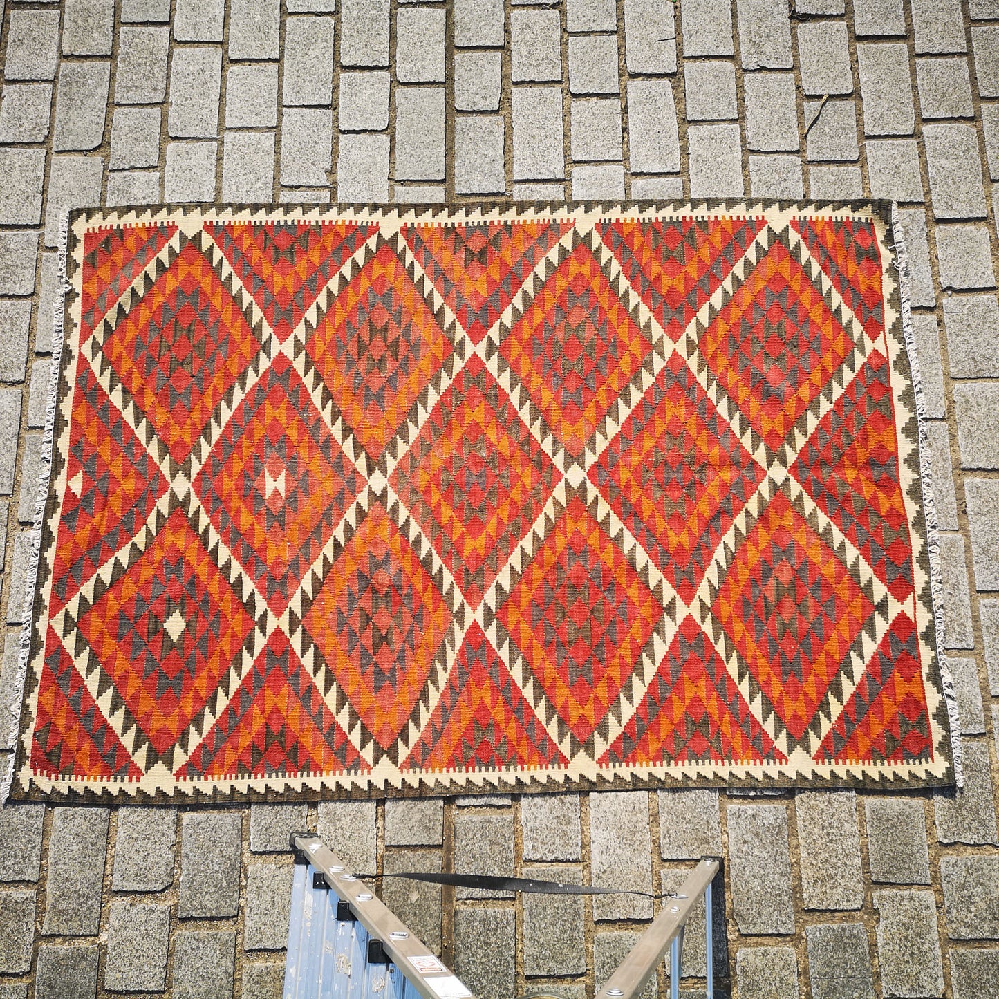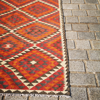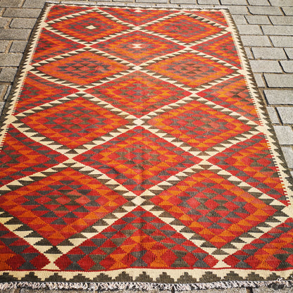 Handwoven in Afghanistan, this Kilim rug embodies the bold geometry and earthy warmth of tribal weaving. Its repeat medallion layout features nested diamond motifs arranged in a symmetrical grid, creating a rhythmic, structured aesthetic rooted in tradition.