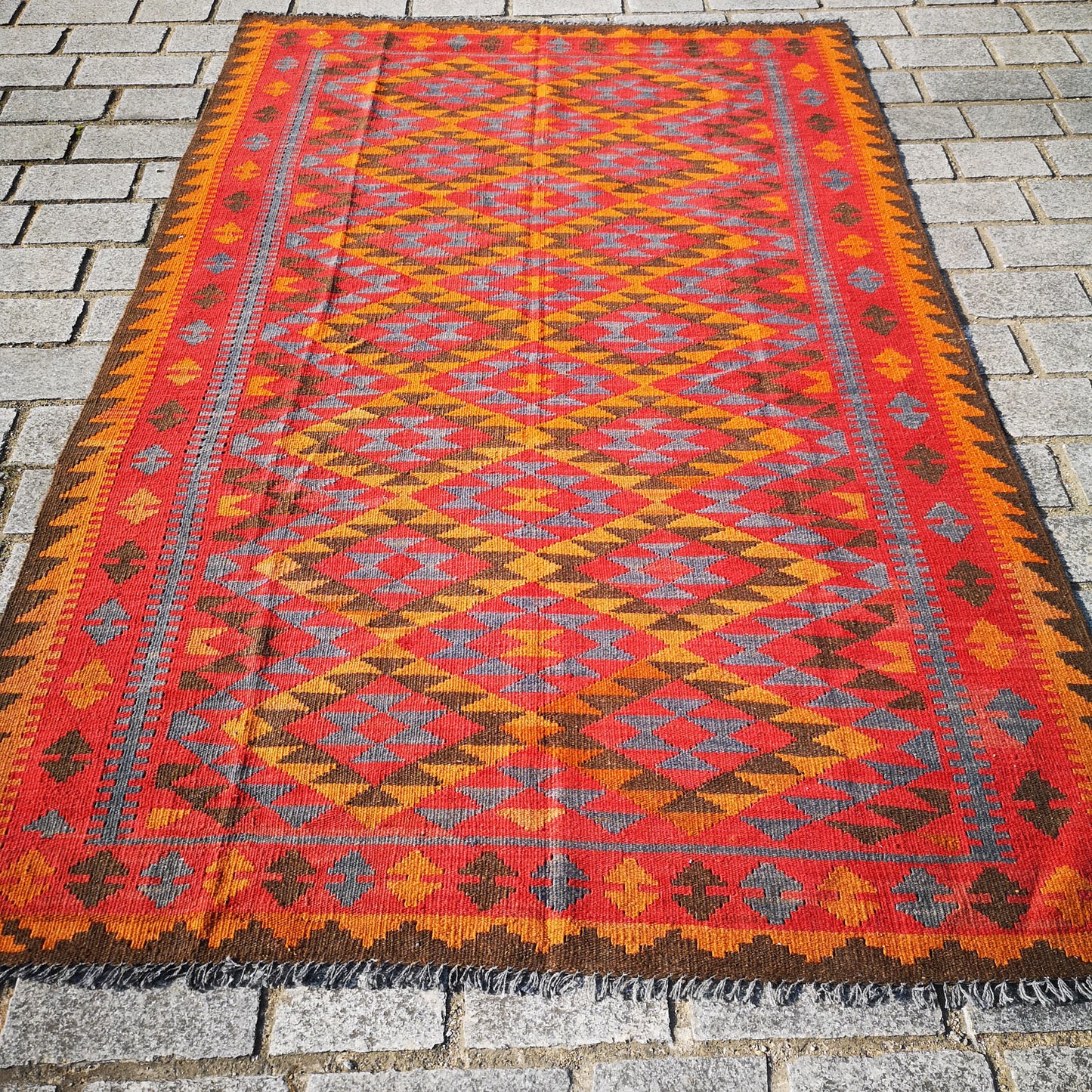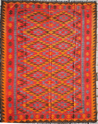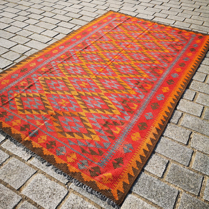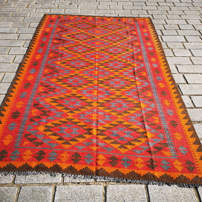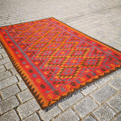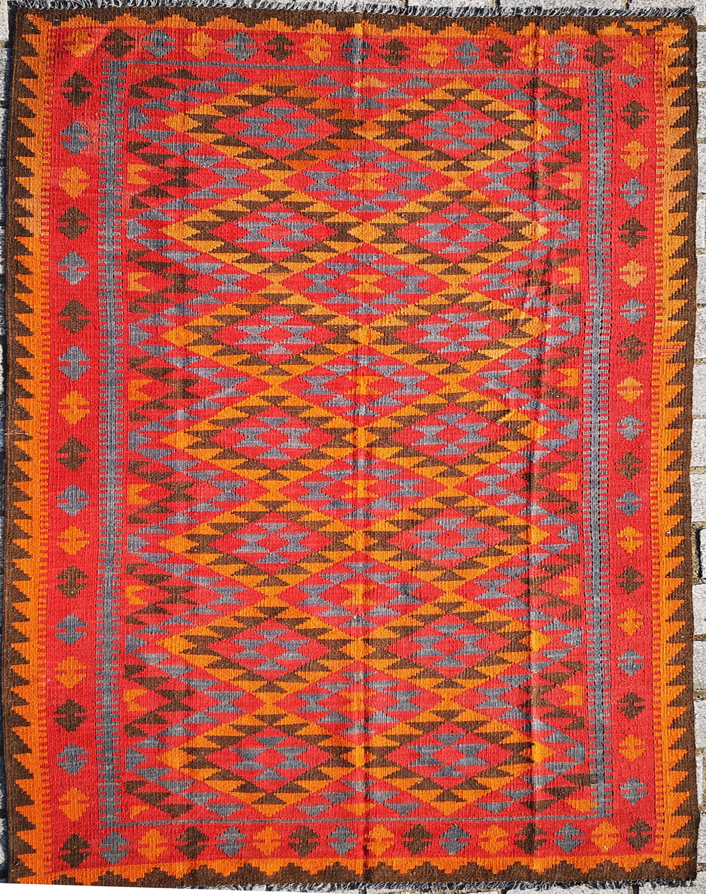 This Afghan Kilim is a striking example of tribal weaving, featuring a bold diamond lattice that repeats with rhythmic precision across its flatwoven surface. Interconnected diamonds and hooked motifs create a dynamic, mirrored layout that speaks to the Kilim tradition’s emphasis on symmetry and symbolism.