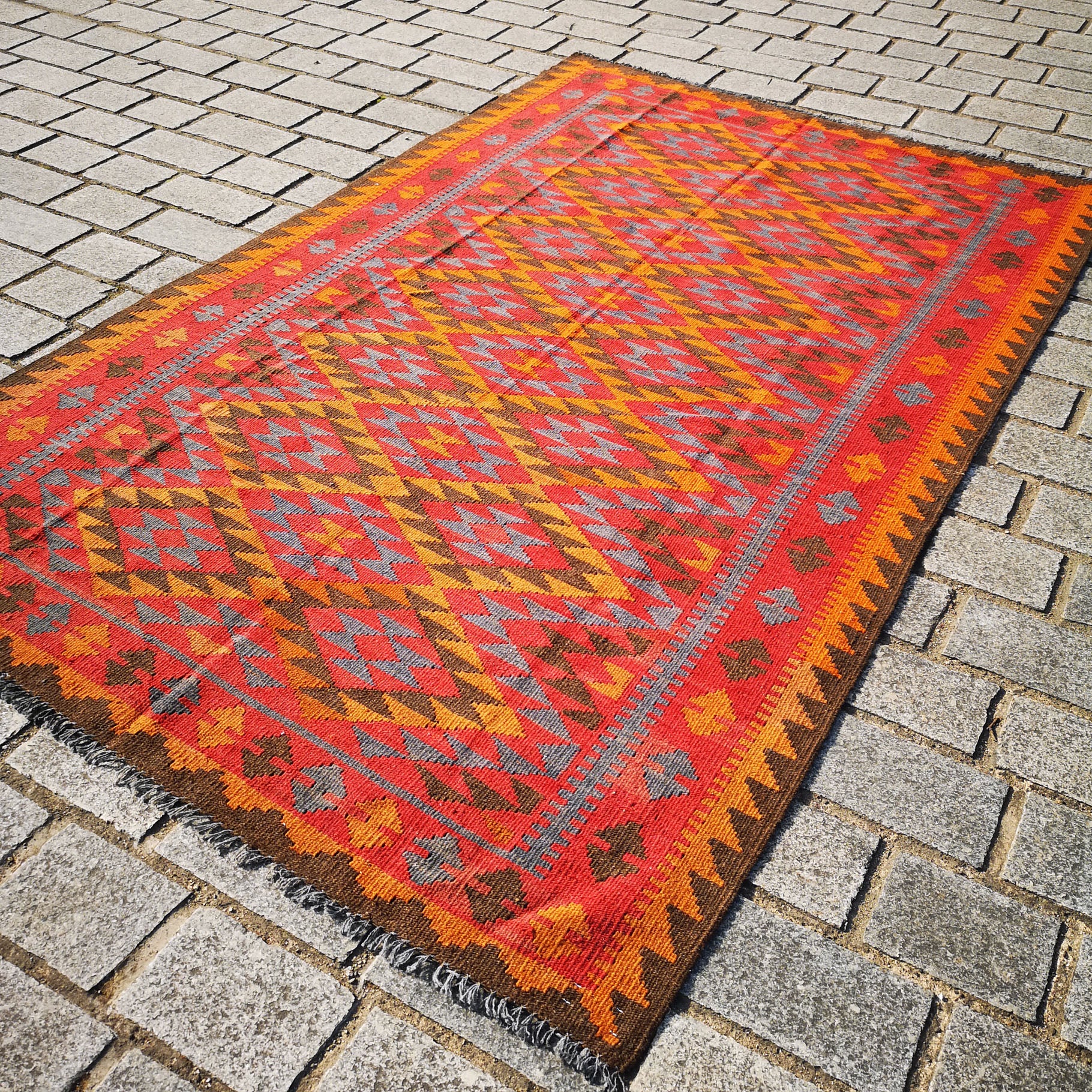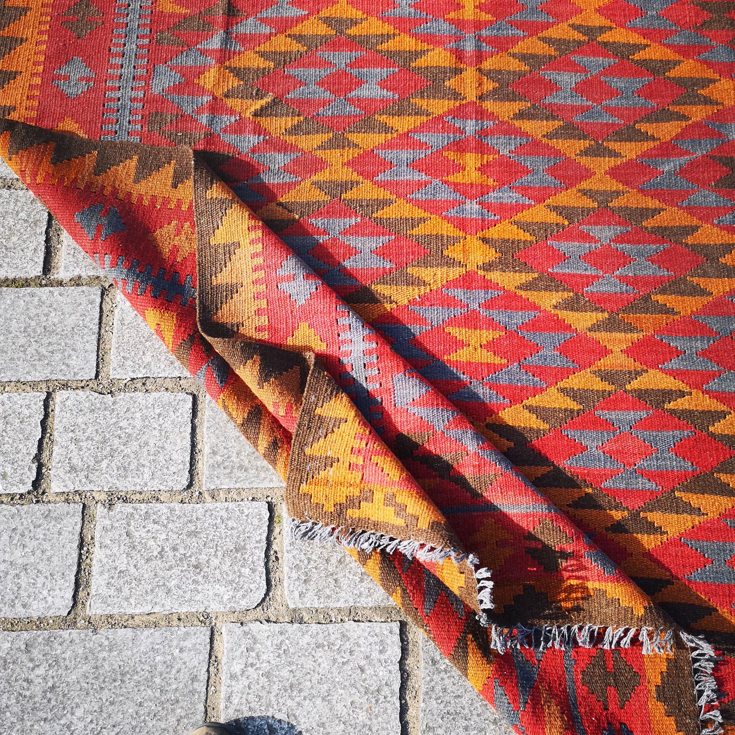 Woven from wool on a cotton foundation, this Kilim is lightweight yet durable, making it ideal for hallways, living spaces, or layered interiors. Its geometric clarity and bold colours lend themselves to eclectic, modern, or bohemian styles.
