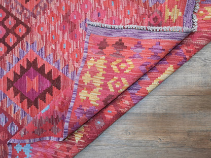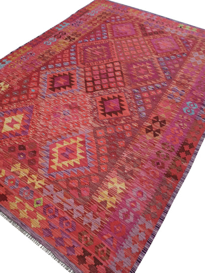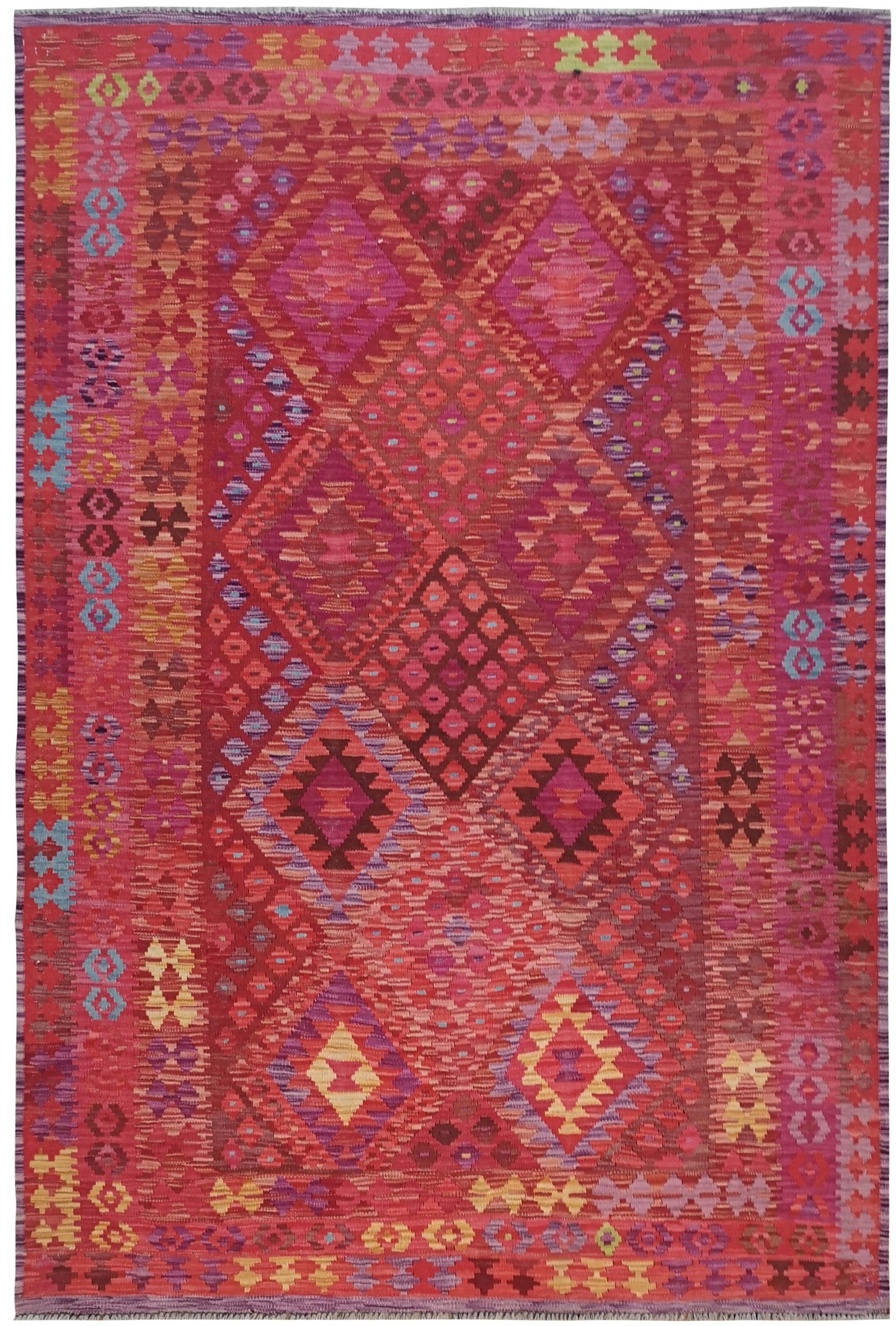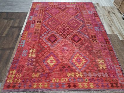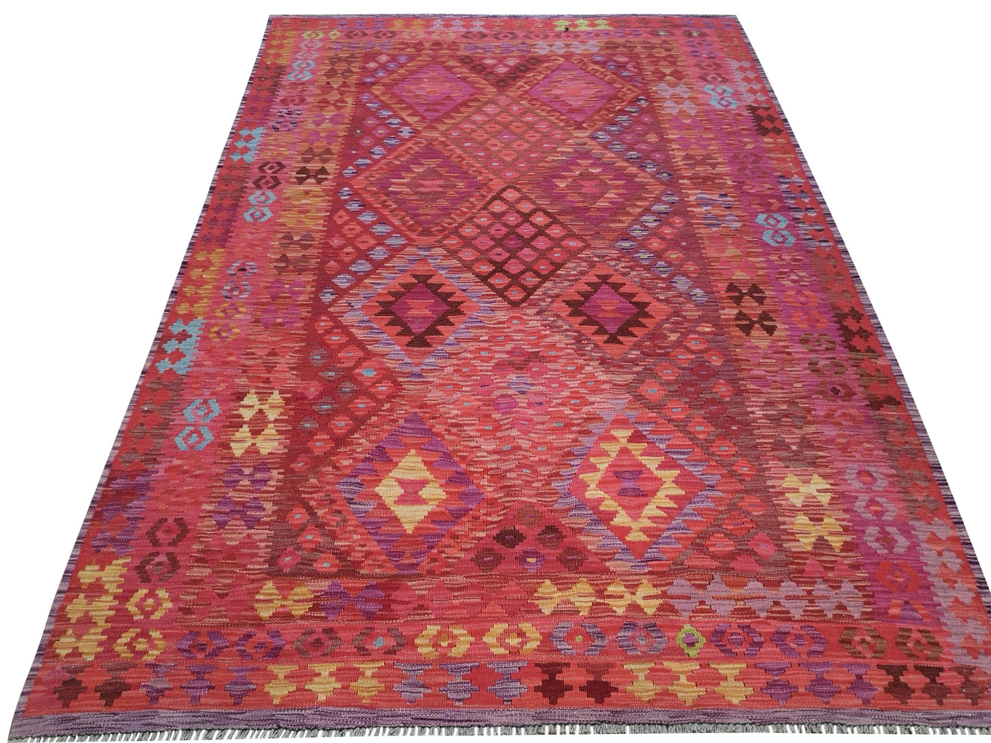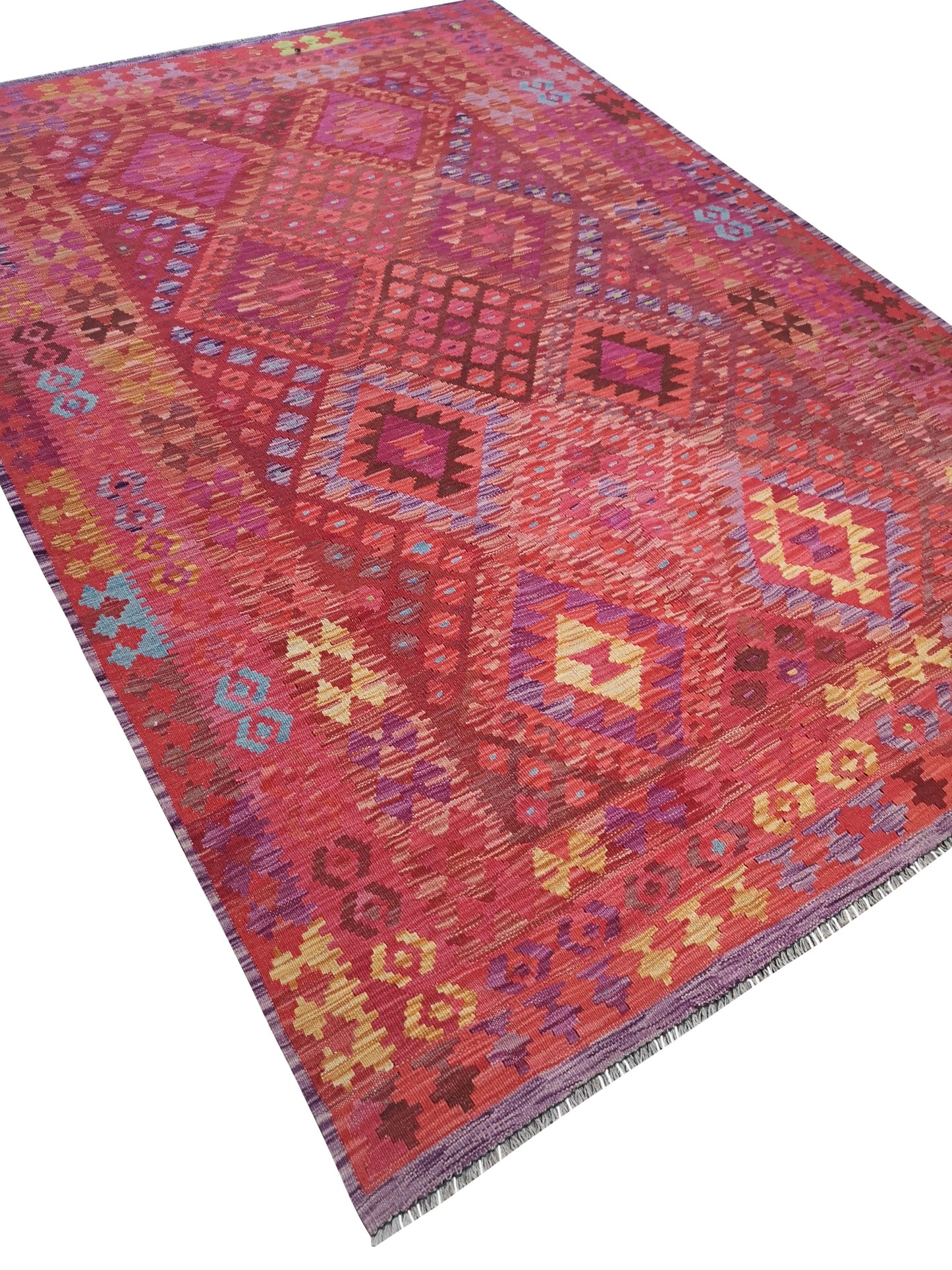 This Afghan Kilim rug embodies the bold rhythm and rich symbolism of tribal weaving. Its repeat medallion pattern, formed by diamond motifs and smaller geometric shapes, creates a striking vertical symmetry that speaks to balance and continuity.