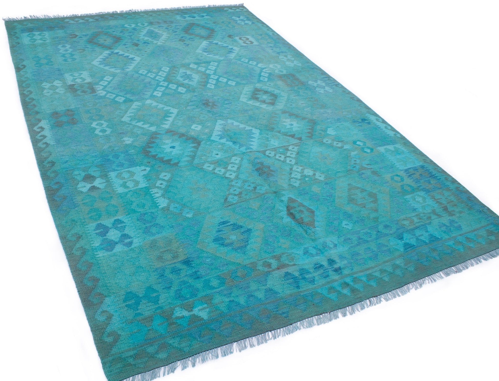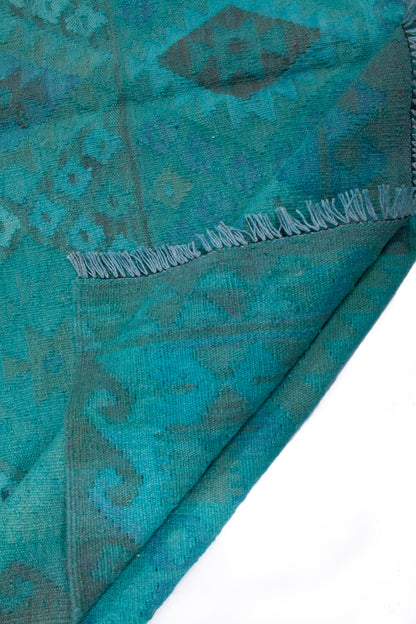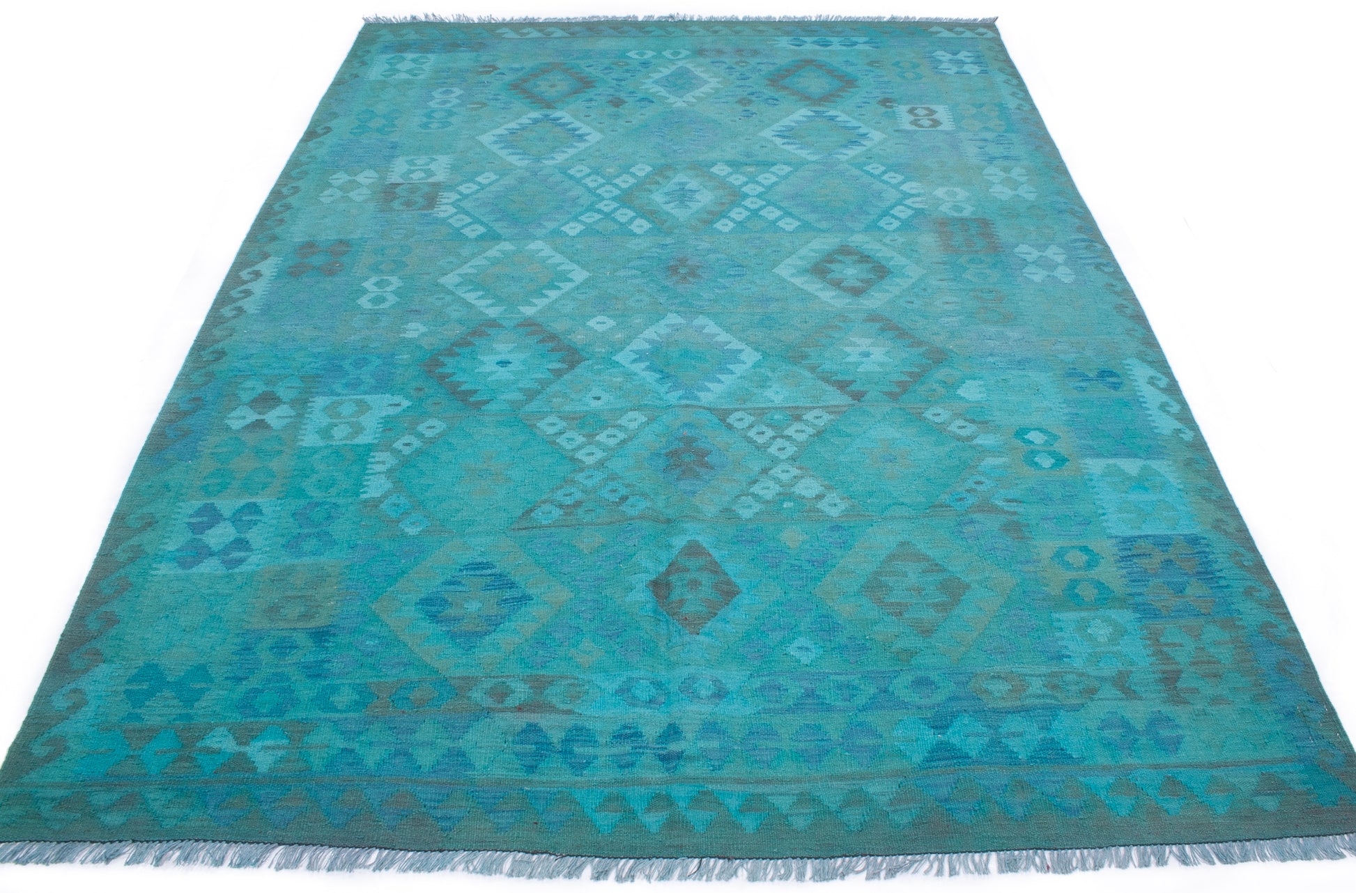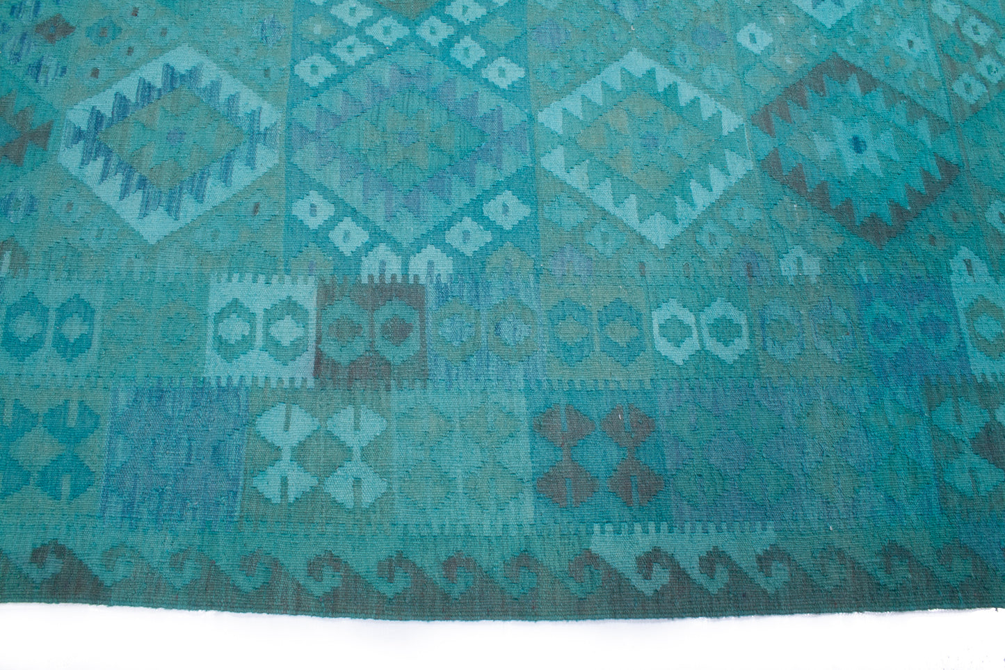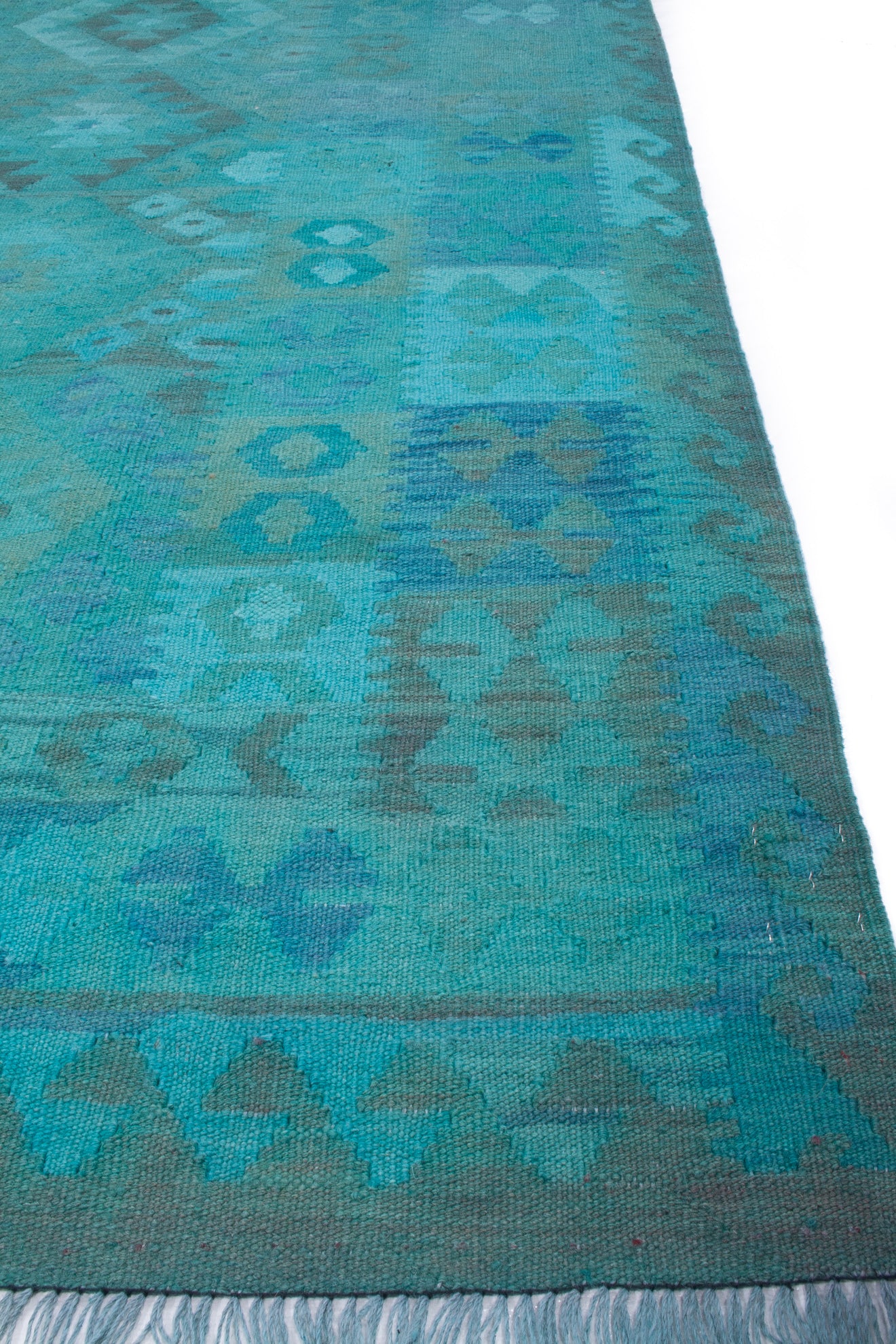 Handwoven in Afghanistan, this Kilim rug embodies the raw beauty of tribal design. Its all-over geometric pattern features diamond motifs and staggered forms, arranged with symmetry and balance, creating a rhythmic, grounded aesthetic.