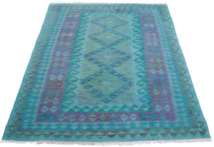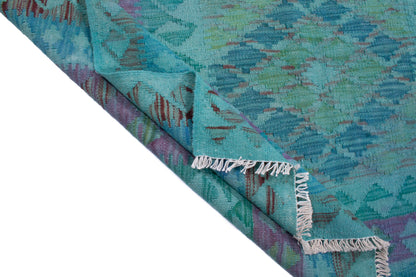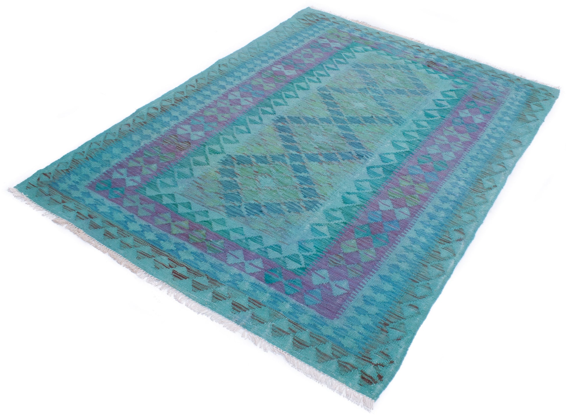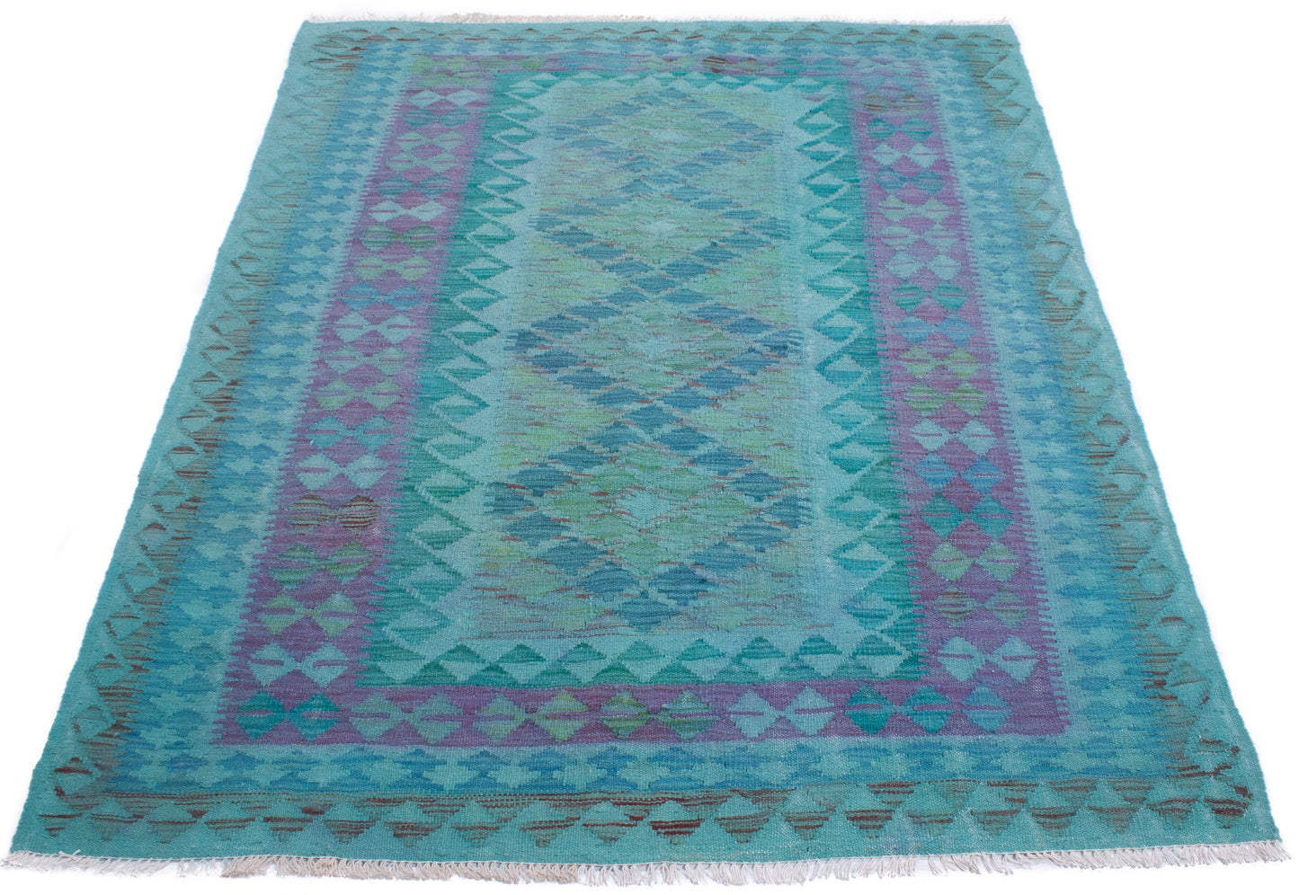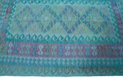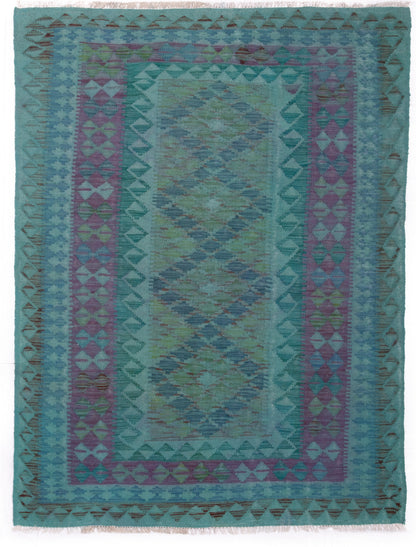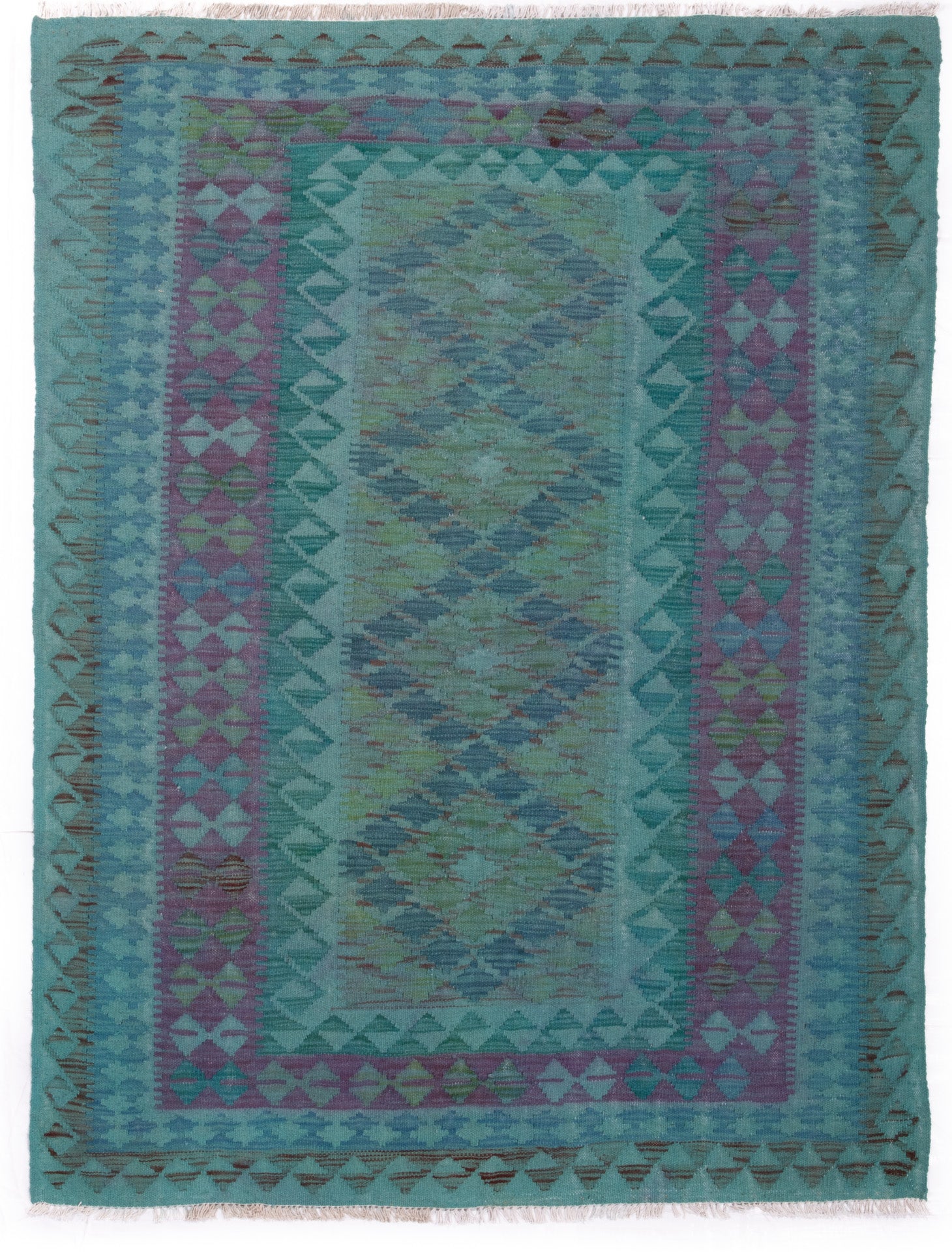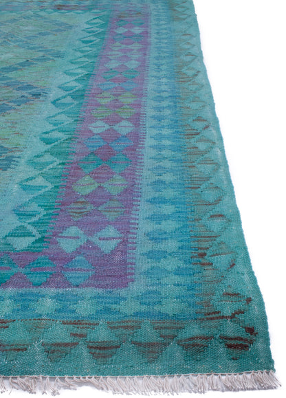 This Afghan Kilim rug captures the essence of tribal weaving, where bold geometry meets tonal subtlety. Its central panel of layered diamonds, filled with repeating shapes, creates a sense of rhythm and balance, framed by a border that echoes the field’s motifs in soft aqua, lavender, and teal.