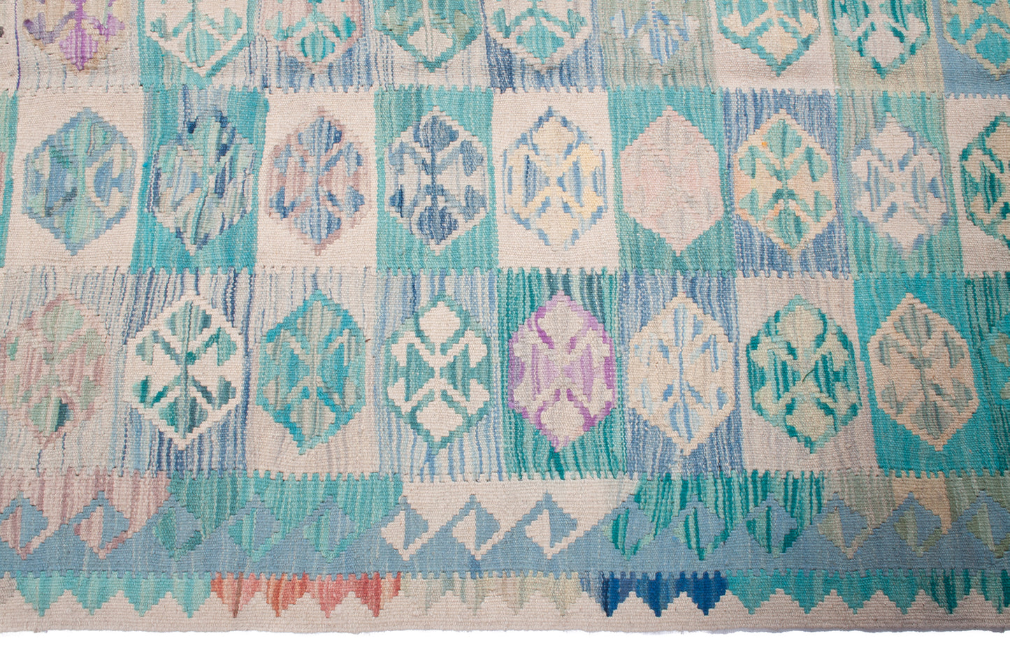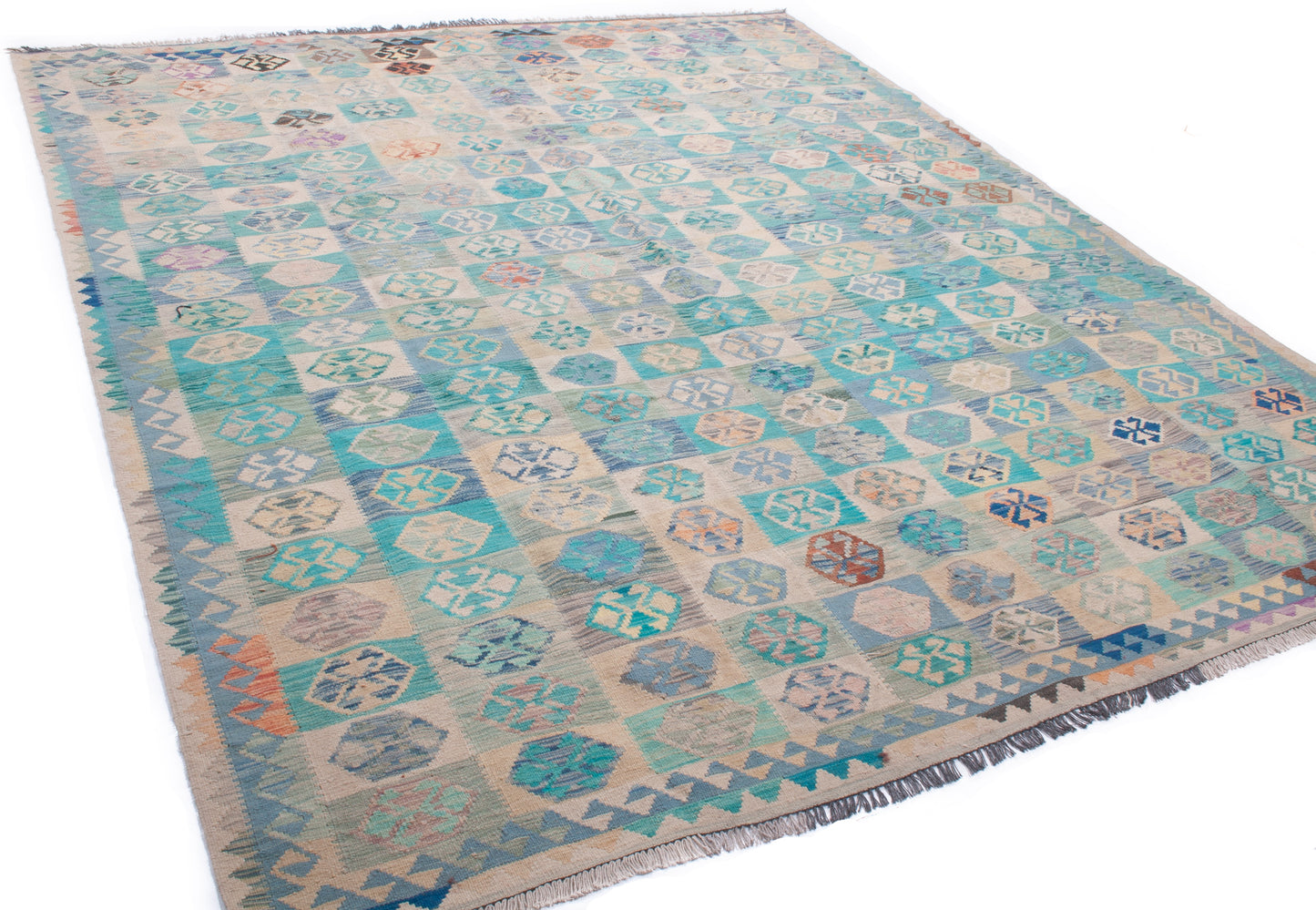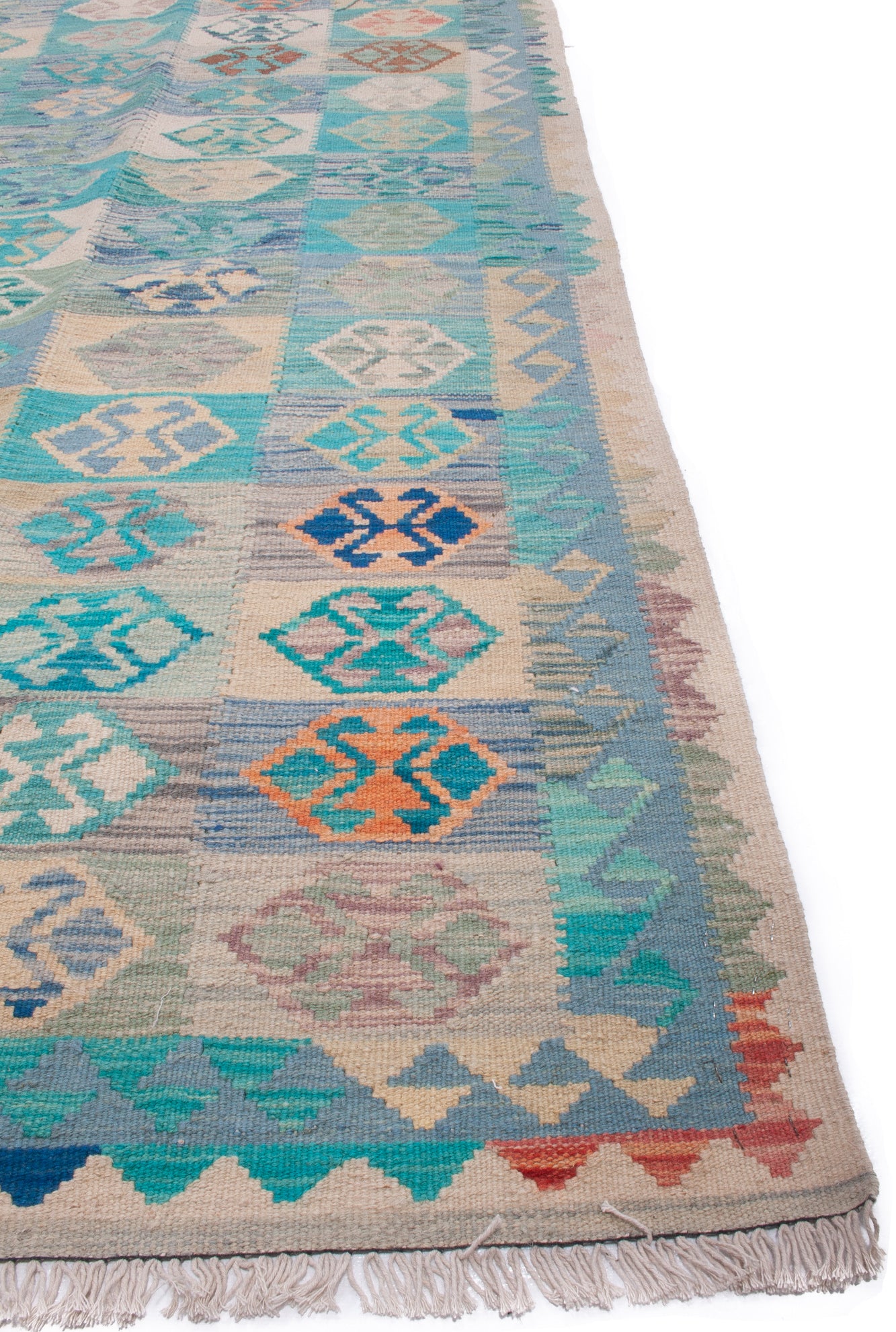 The muted palette of turquoise, light teal, and beige is softened by tones of pale blue, coral, and lavender, offering a gentle contrast that feels both grounded and serene. A zigzag border in beige and blue frames the design, seamlessly integrated without separating guard bands, reinforcing the rug’s cohesive aesthetic.