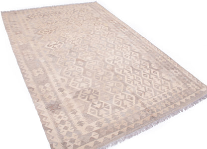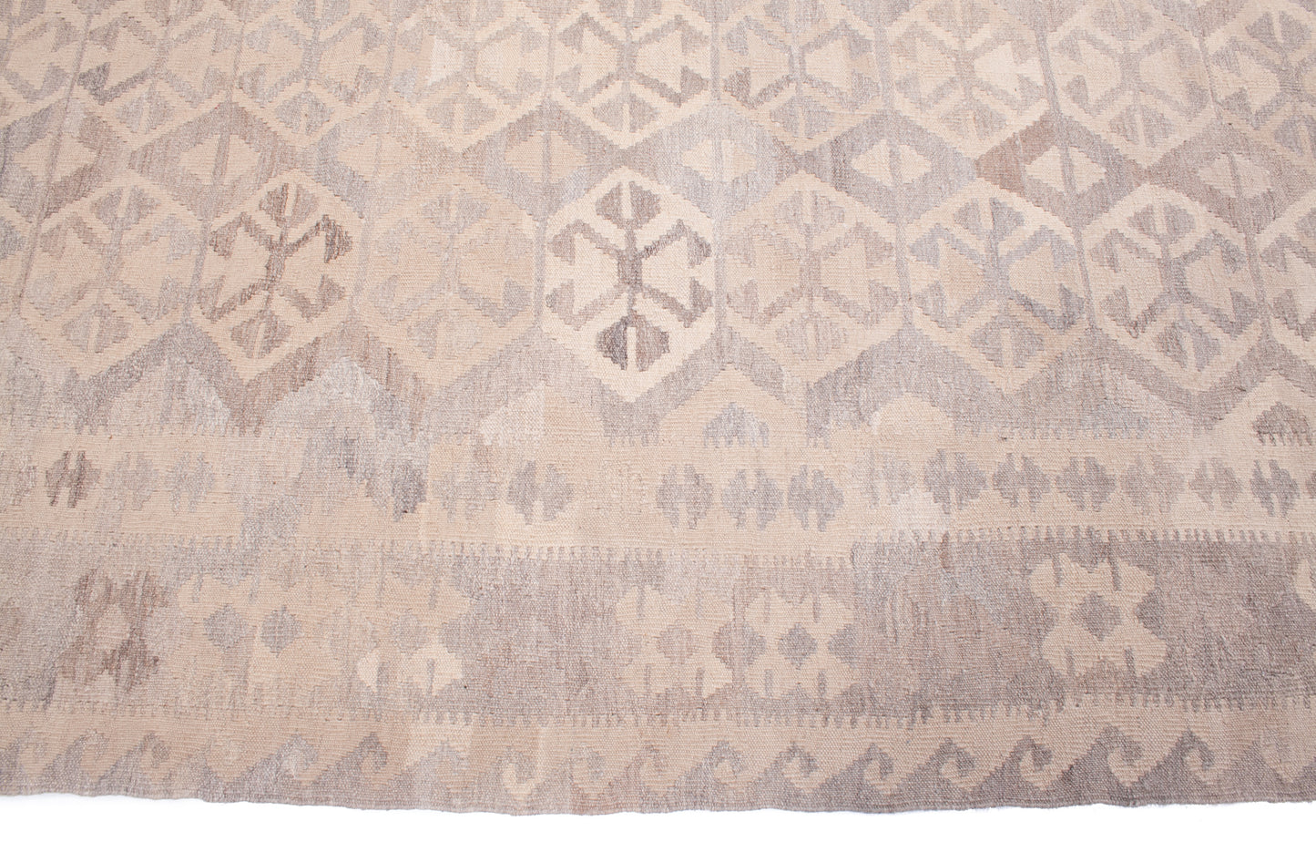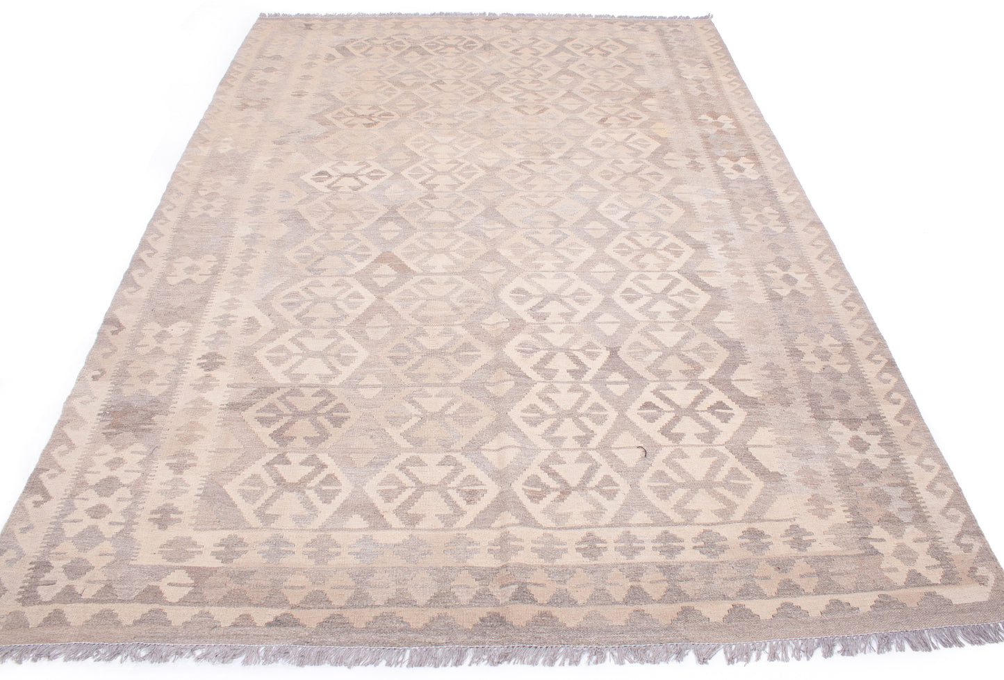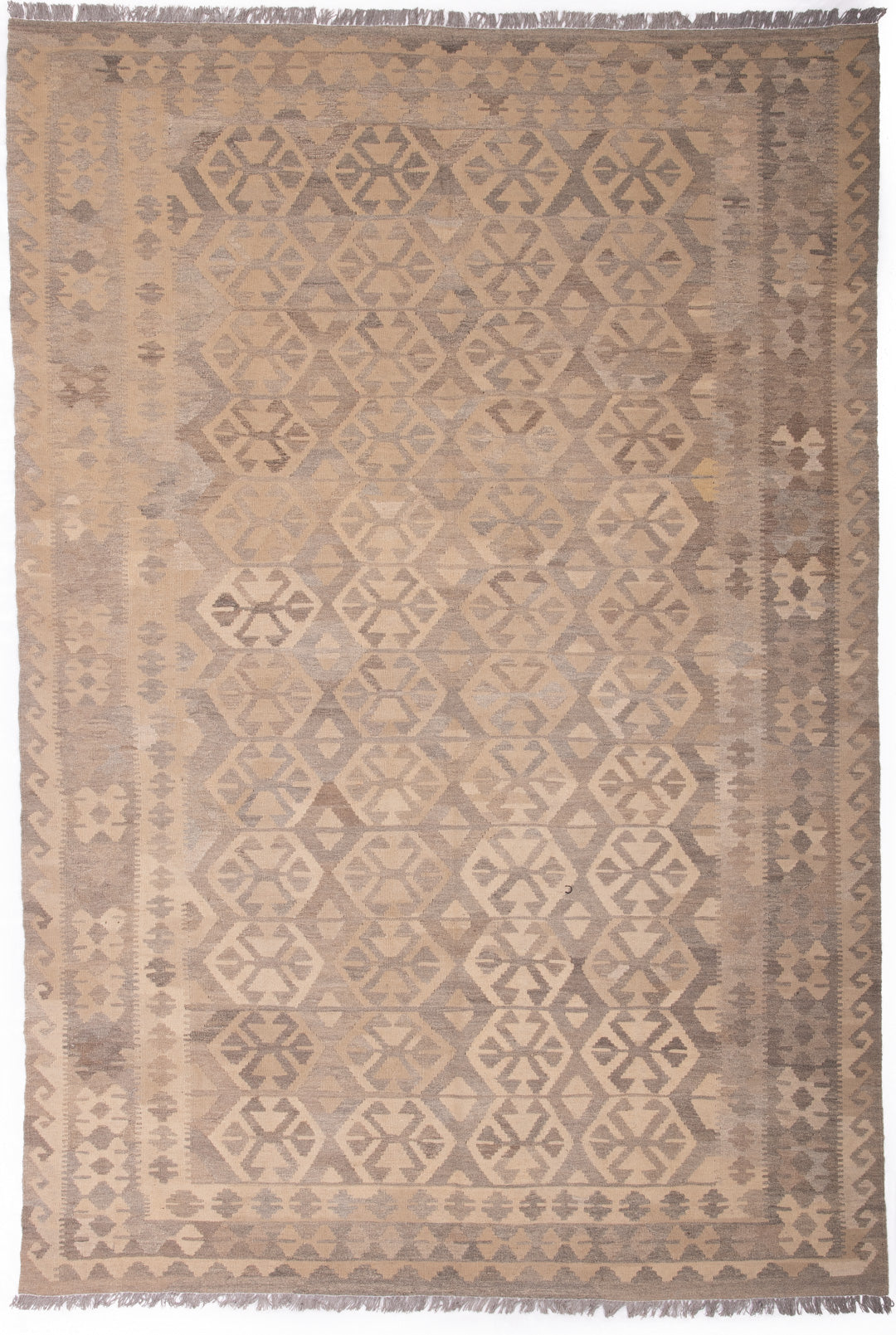 Handwoven in Afghanistan, this Kilim rug embodies the timeless appeal of tribal weaving, blending symmetry with symbolism. Its all-over geometric pattern features hexagonal forms filled with stylised Koçboynuzu (Ram's Horn) motifs—emblems of strength and protection—arranged in a mirrored, rhythmic layout.