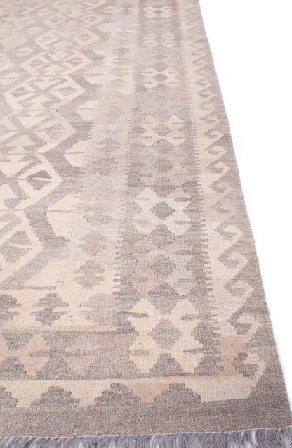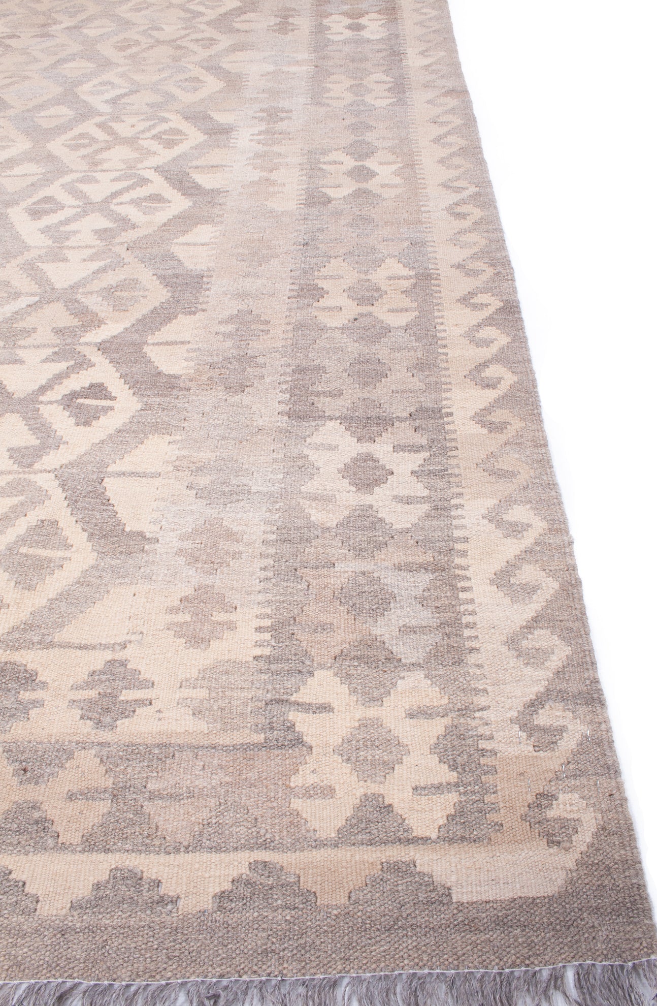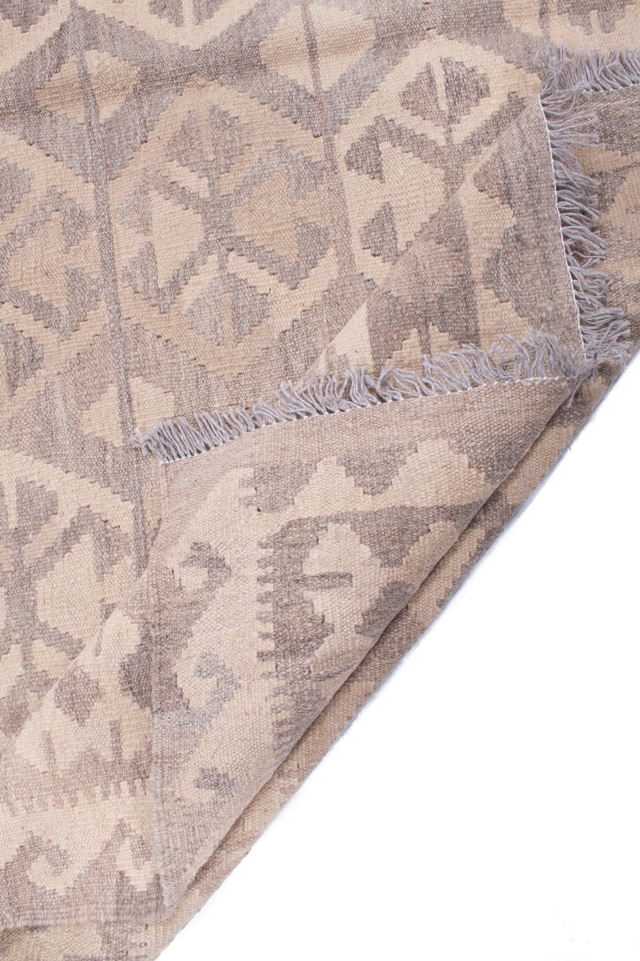 Woven from wool on a cotton foundation, this Kilim is both lightweight and durable, making it ideal for living spaces, hallways, or layered interiors. Its earthy tones and bold repetition lend character to minimalist and modern homes, grounding a space without overwhelming it.