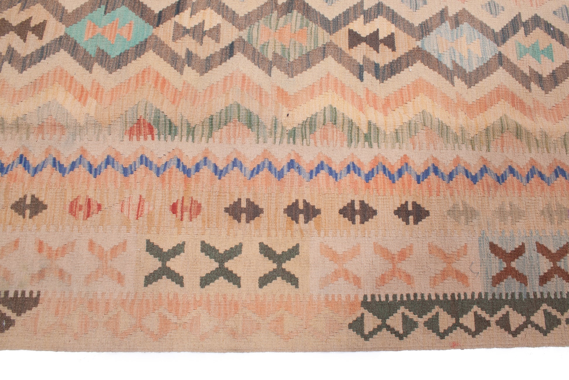 Bring heritage and subtle character into your space with this Afghan Kilim rug—order online or visit our showroom to explore similar pieces.