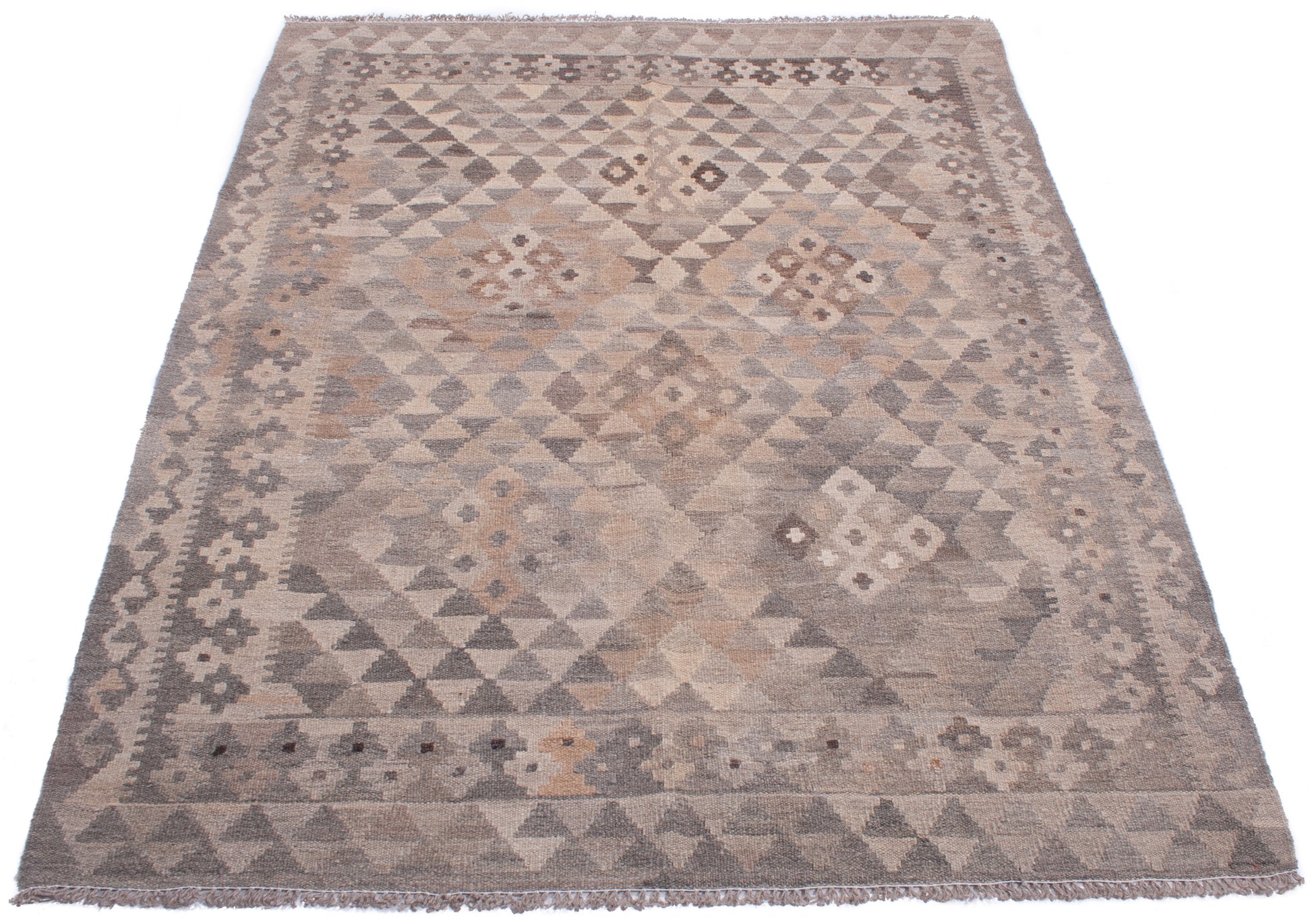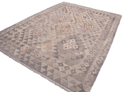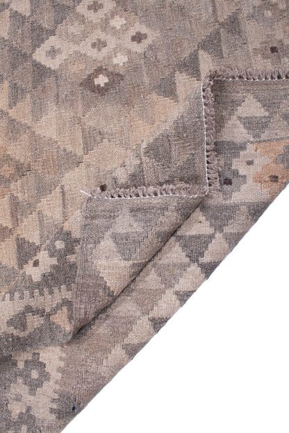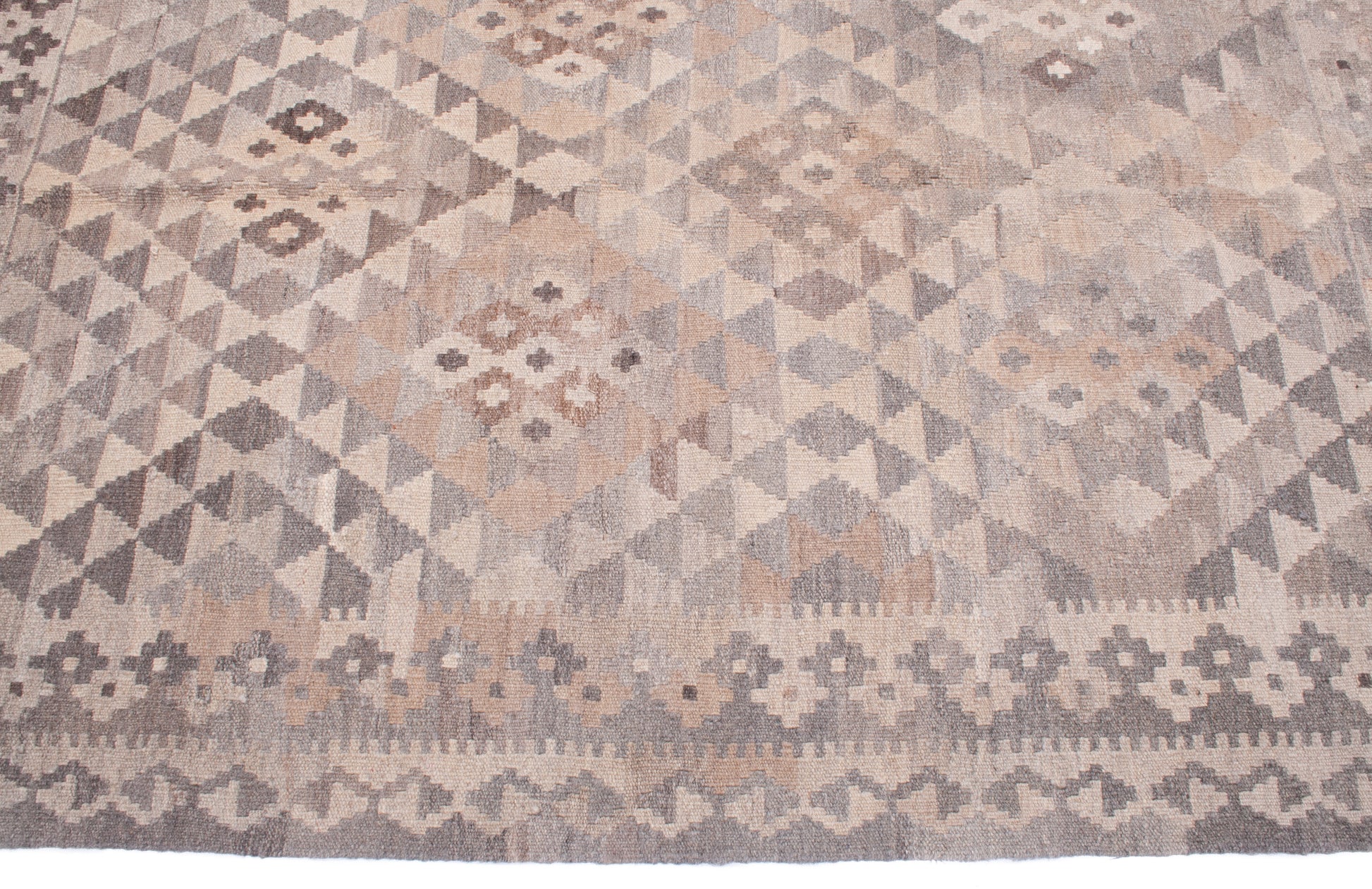 This handmade Afghan Kilim rug reflects the enduring artistry of tribal weaving, offering a timeless blend of form and function. Its all-over diamond pattern, composed of tessellated triangles and subtle cross motifs, creates a sense of balance and structure that speaks to the heart of Kilim design.