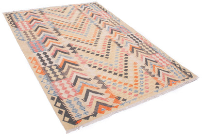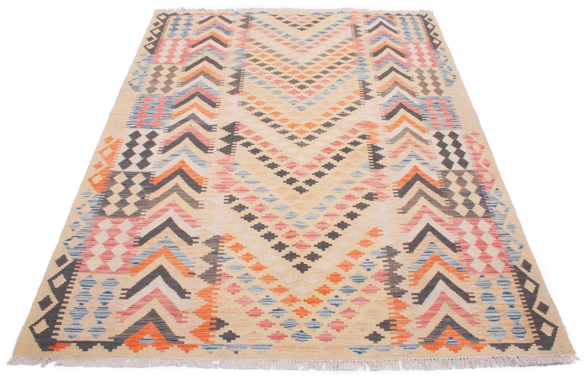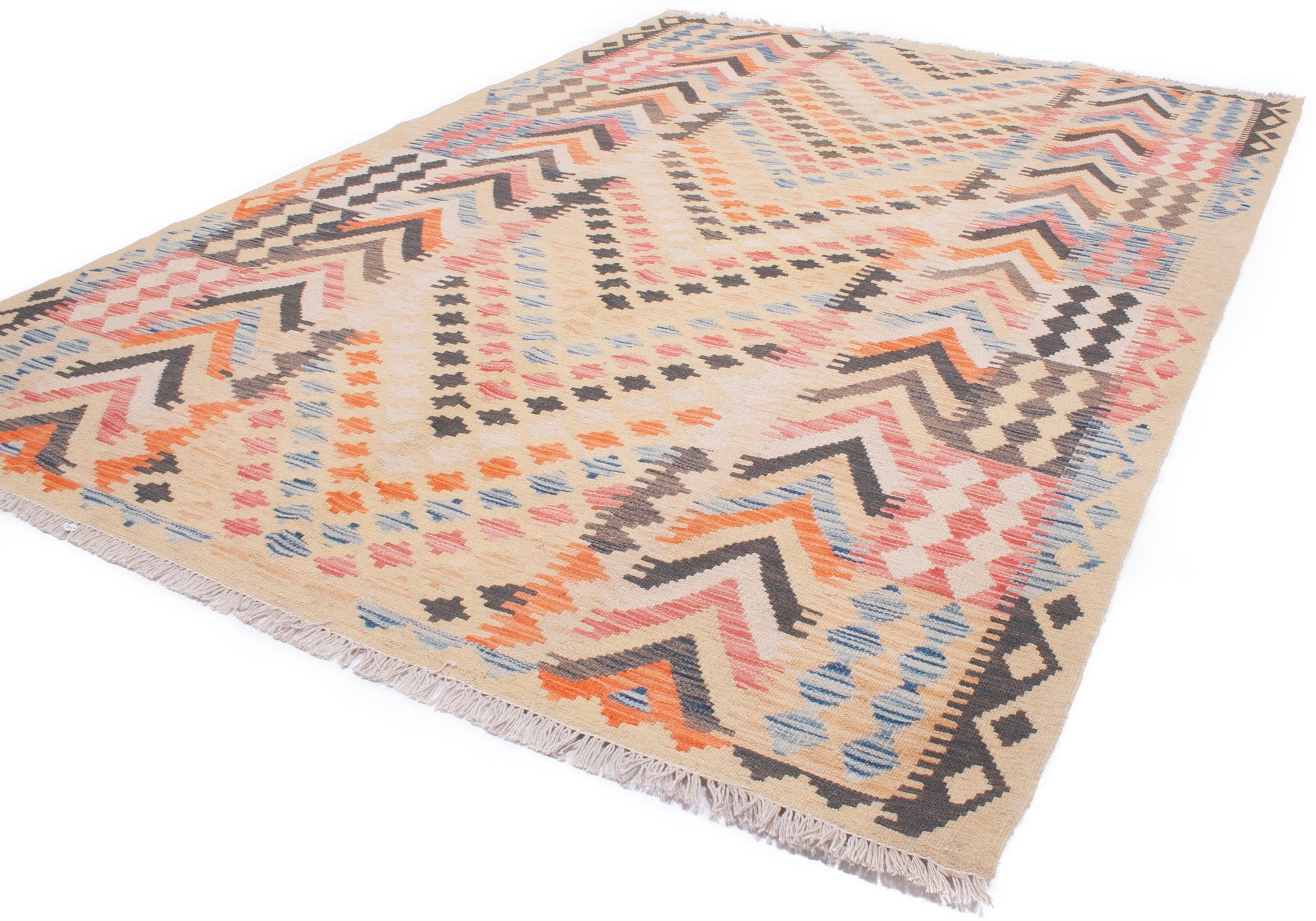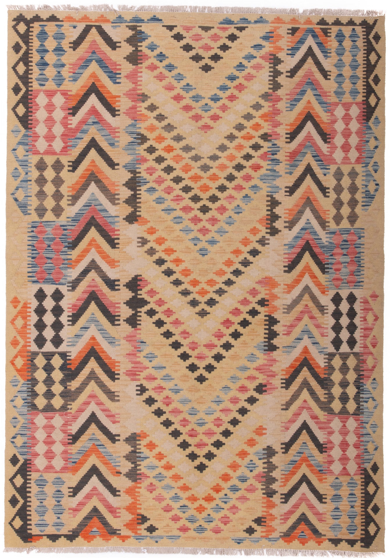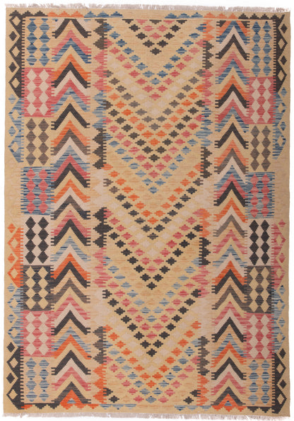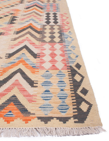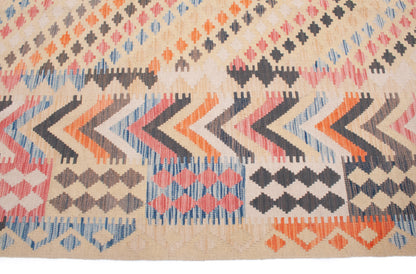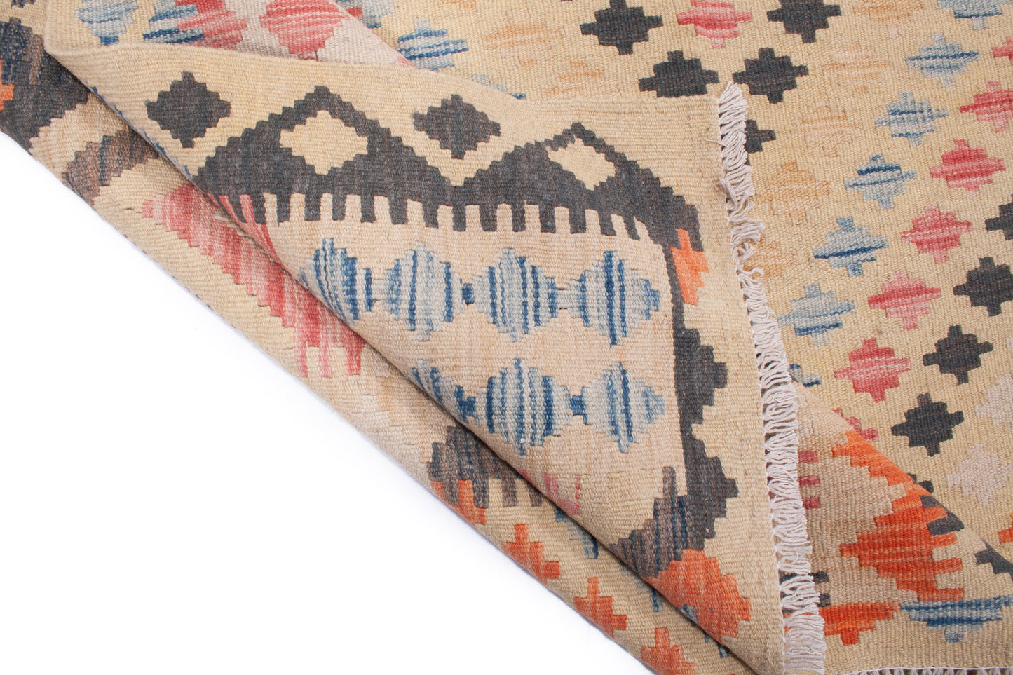 Handwoven in Afghanistan, this kilim rug embodies the tribal artistry and practical elegance of flatweave design. Its symmetrical arrangement of chevron and diamond motifs creates a rhythmic, grounded aesthetic, rich in tradition and visual balance.