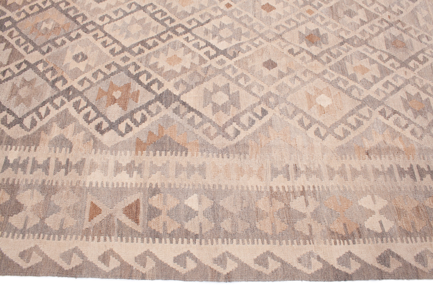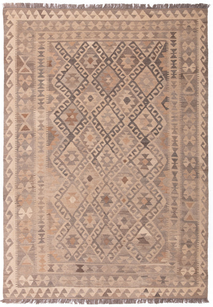 Handwoven in Afghanistan, this Kilim rug embodies the timeless beauty of tribal design. Its lattice of interconnected diamonds and star-like motifs creates a rhythmic, symmetrical structure that speaks to generations of weaving tradition.