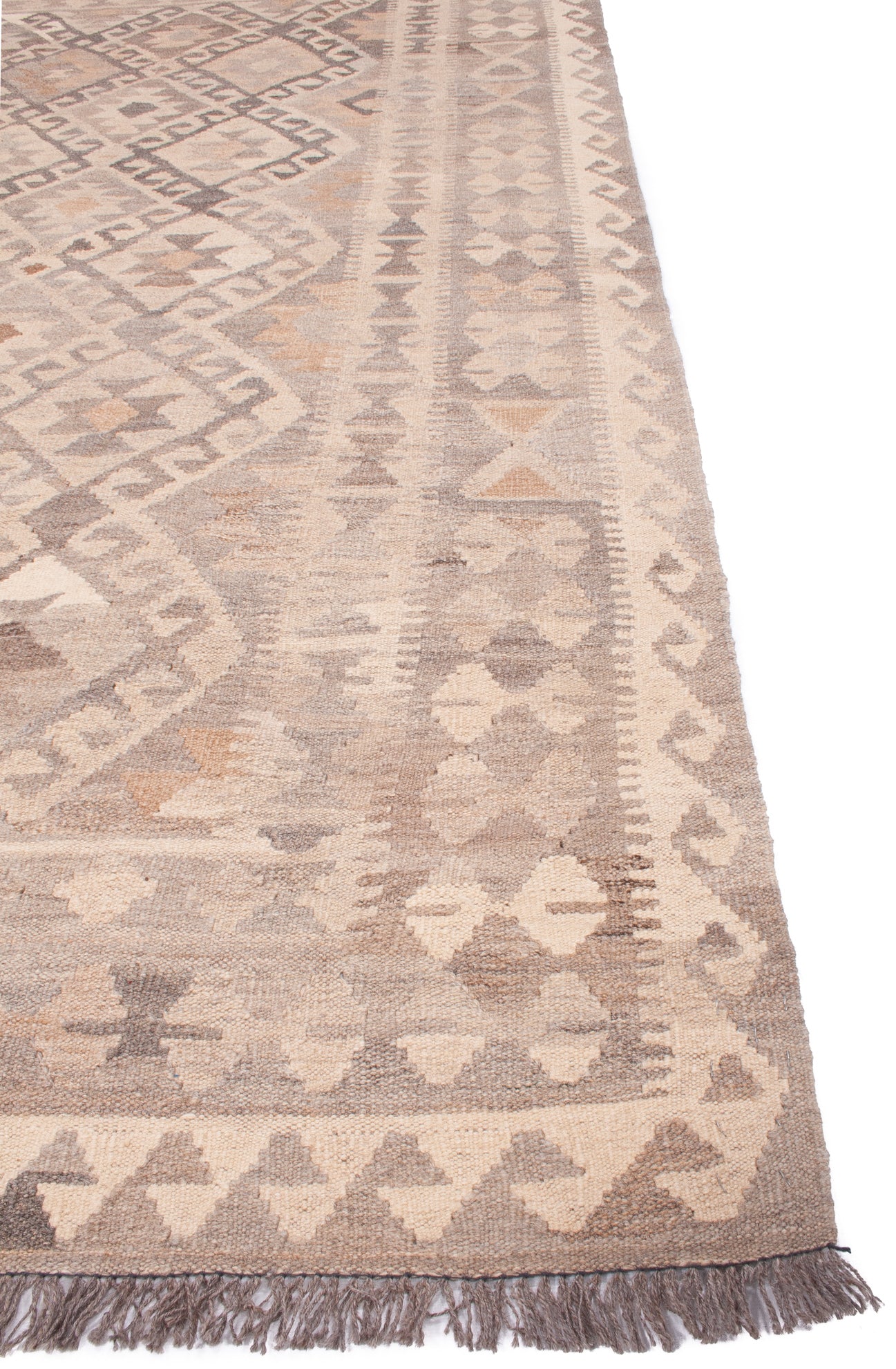 The earthy palette of beige, taupe, and muted grey offers subtle contrast, lending the piece a soft, grounded presence. A geometric border with triangular and diamond shapes frames the design, reinforced by delicate guard bands that add balance and refinement.
