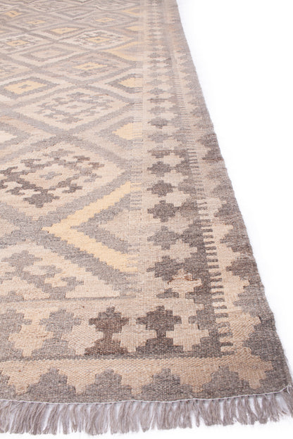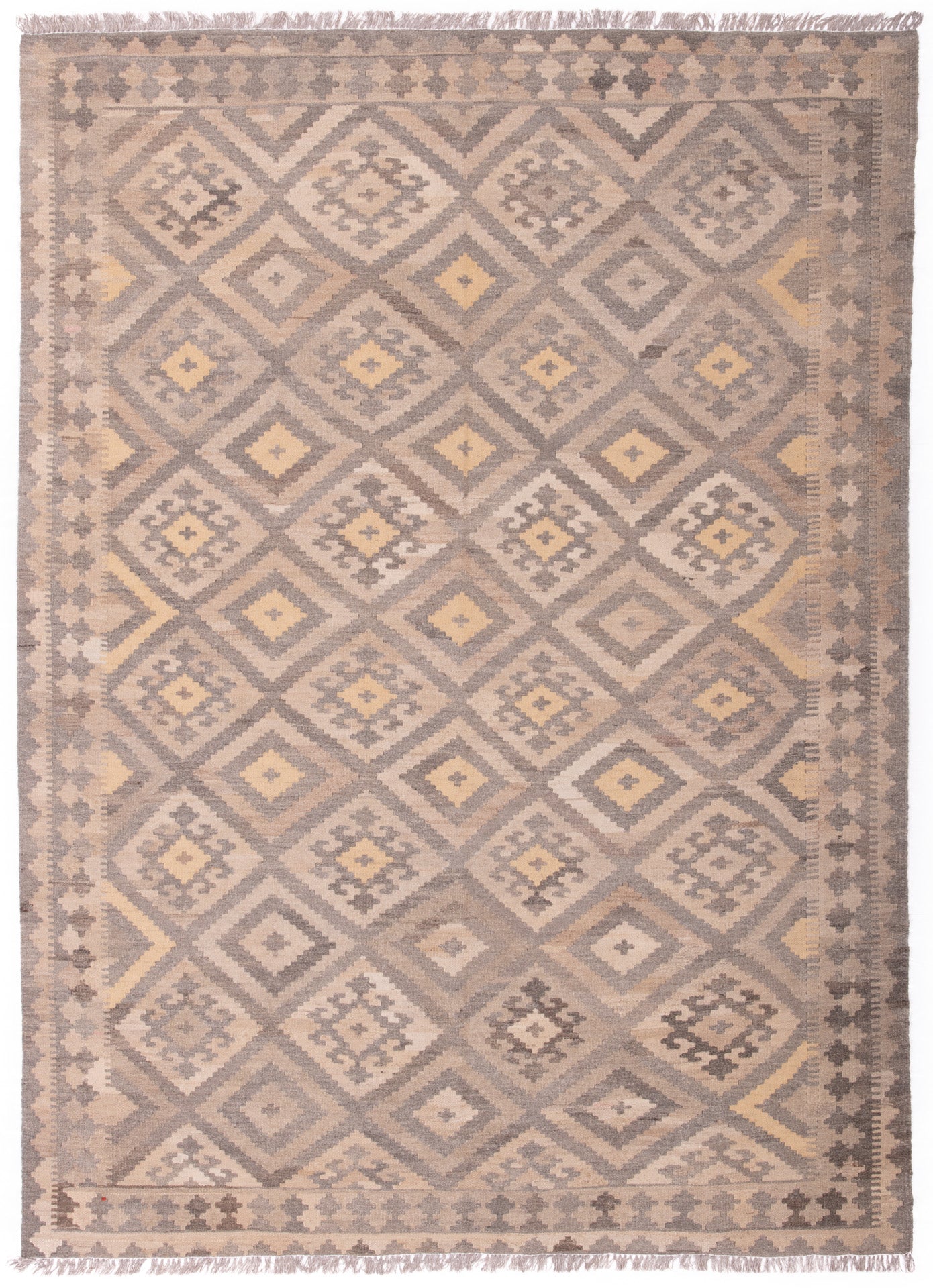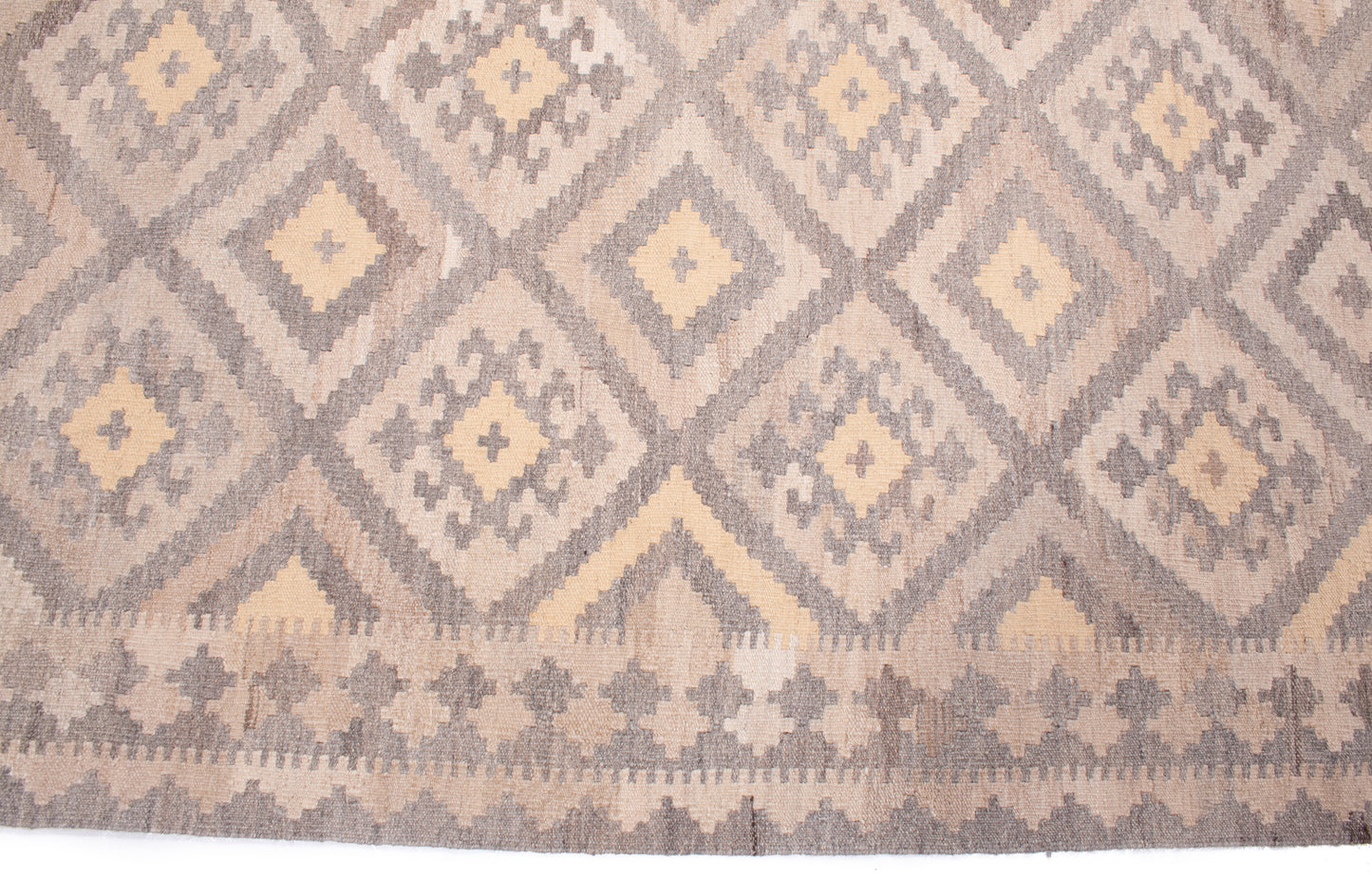 The muted palette of taupe, beige, and soft yellow creates a gentle interplay of tones, lending the piece a quiet, earthy elegance. A series of small geometric motifs form the main border, echoing the field’s structure and providing a seamless transition between elements. Narrow guard bands add a final touch of refinement.