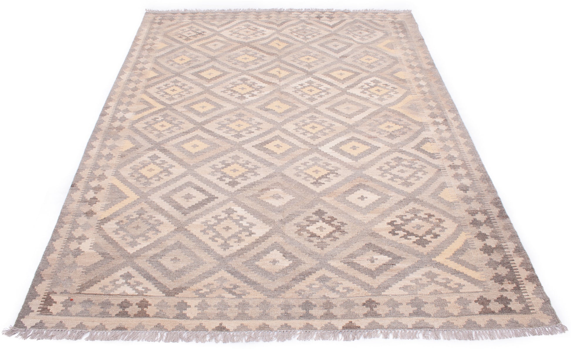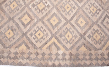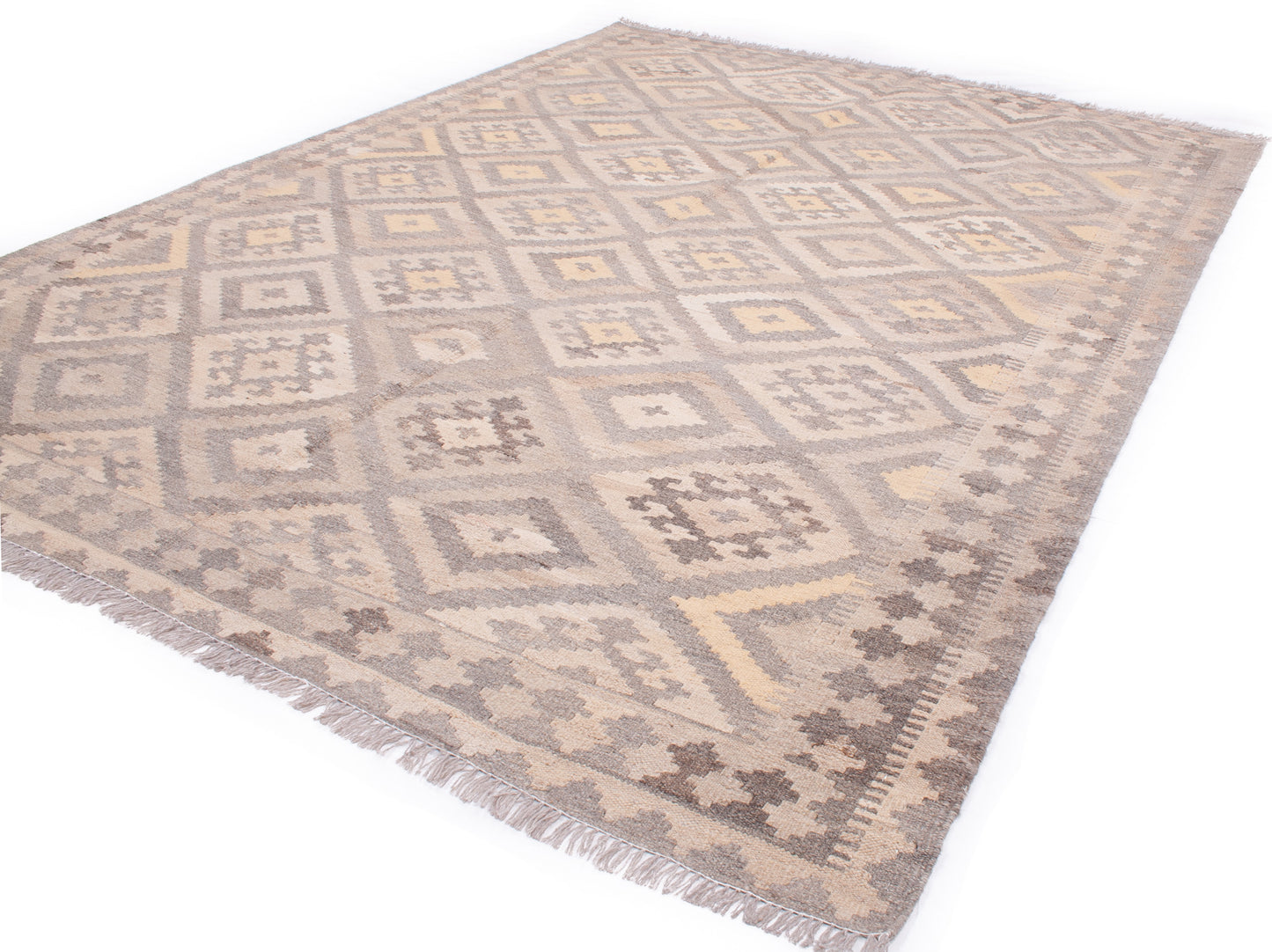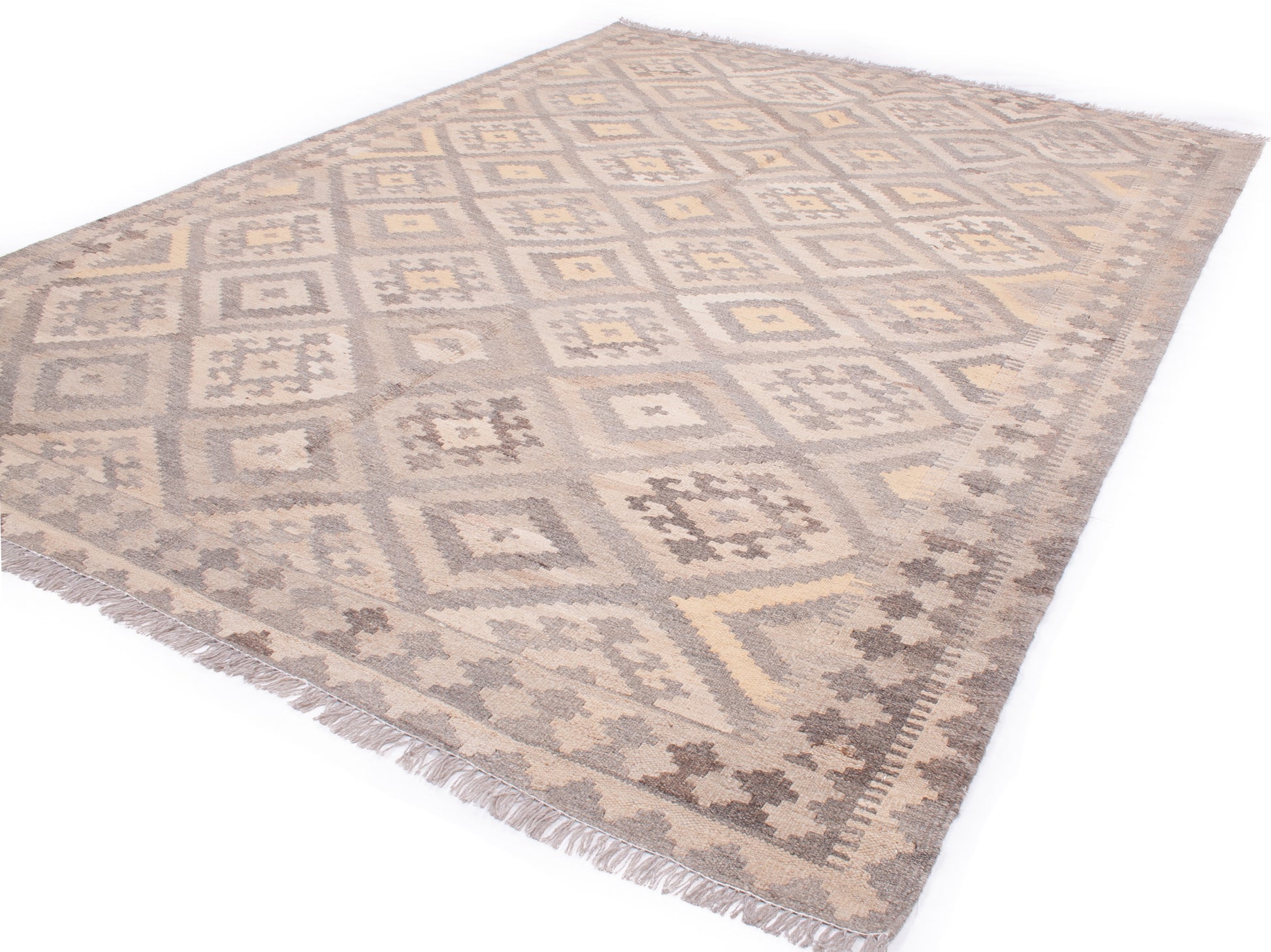The muted palette of taupe, beige, and soft yellow creates a gentle interplay of tones, lending the piece a quiet, earthy elegance. A series of small geometric motifs form the main border, echoing the field’s structure and providing a seamless transition between elements. Narrow guard bands add a final touch of refinement.