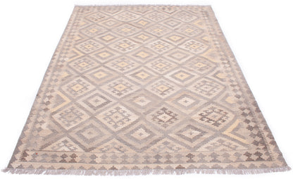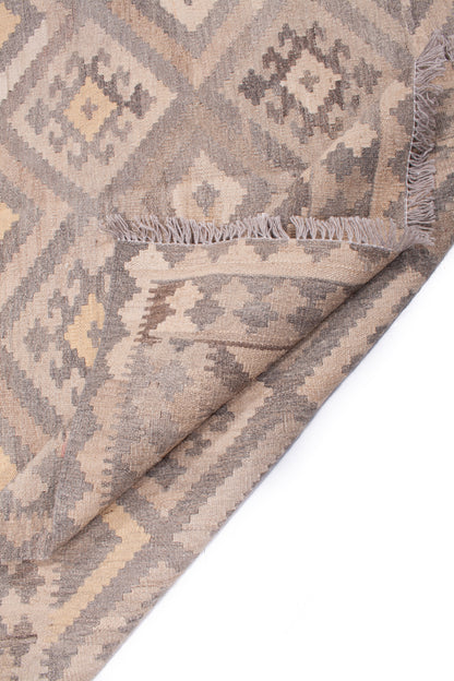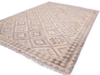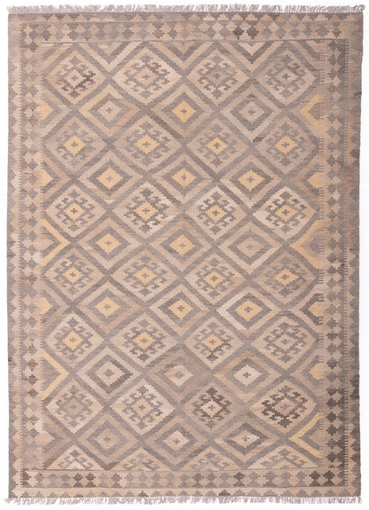 This Afghan Kilim rug embodies the understated beauty of tribal weaving, where form and function meet in perfect balance. Handwoven in Afghanistan, it features a repeat medallion layout of nested diamonds, arranged in a mirrored, geometric grid that reflects the Kilim tradition’s emphasis on symmetry and rhythm.