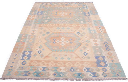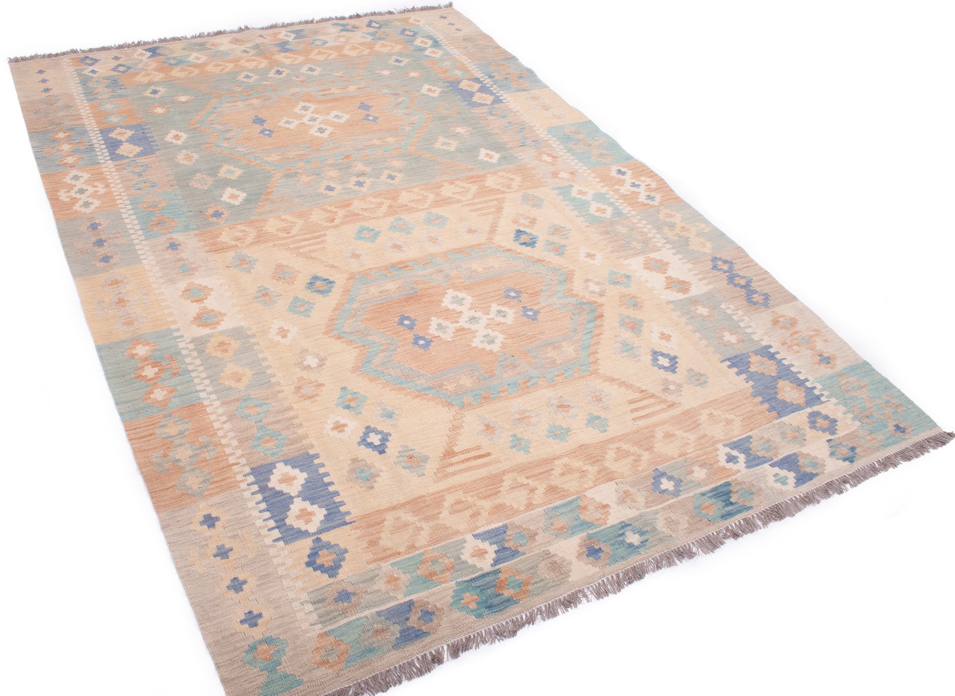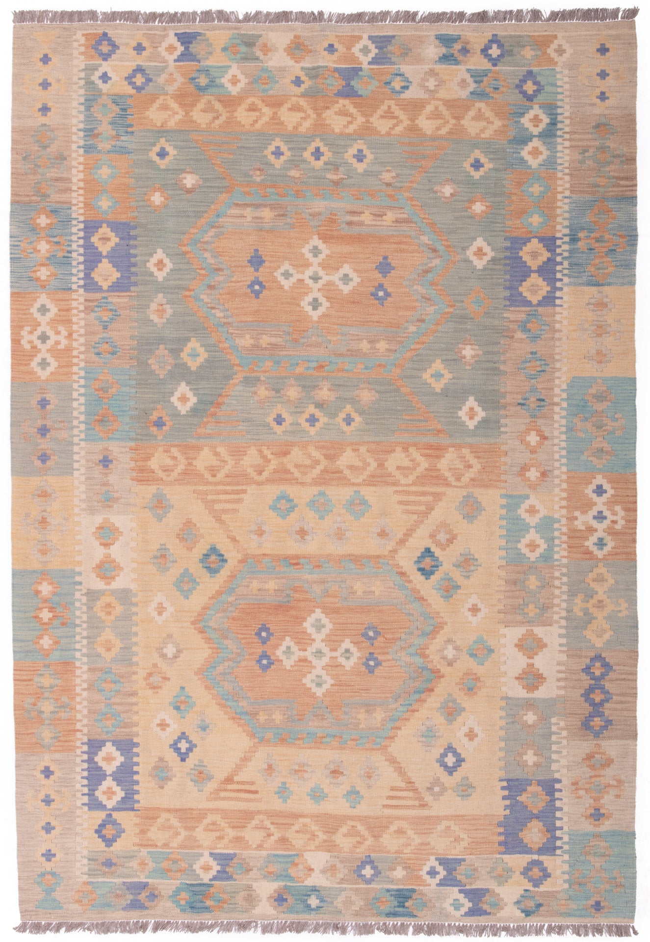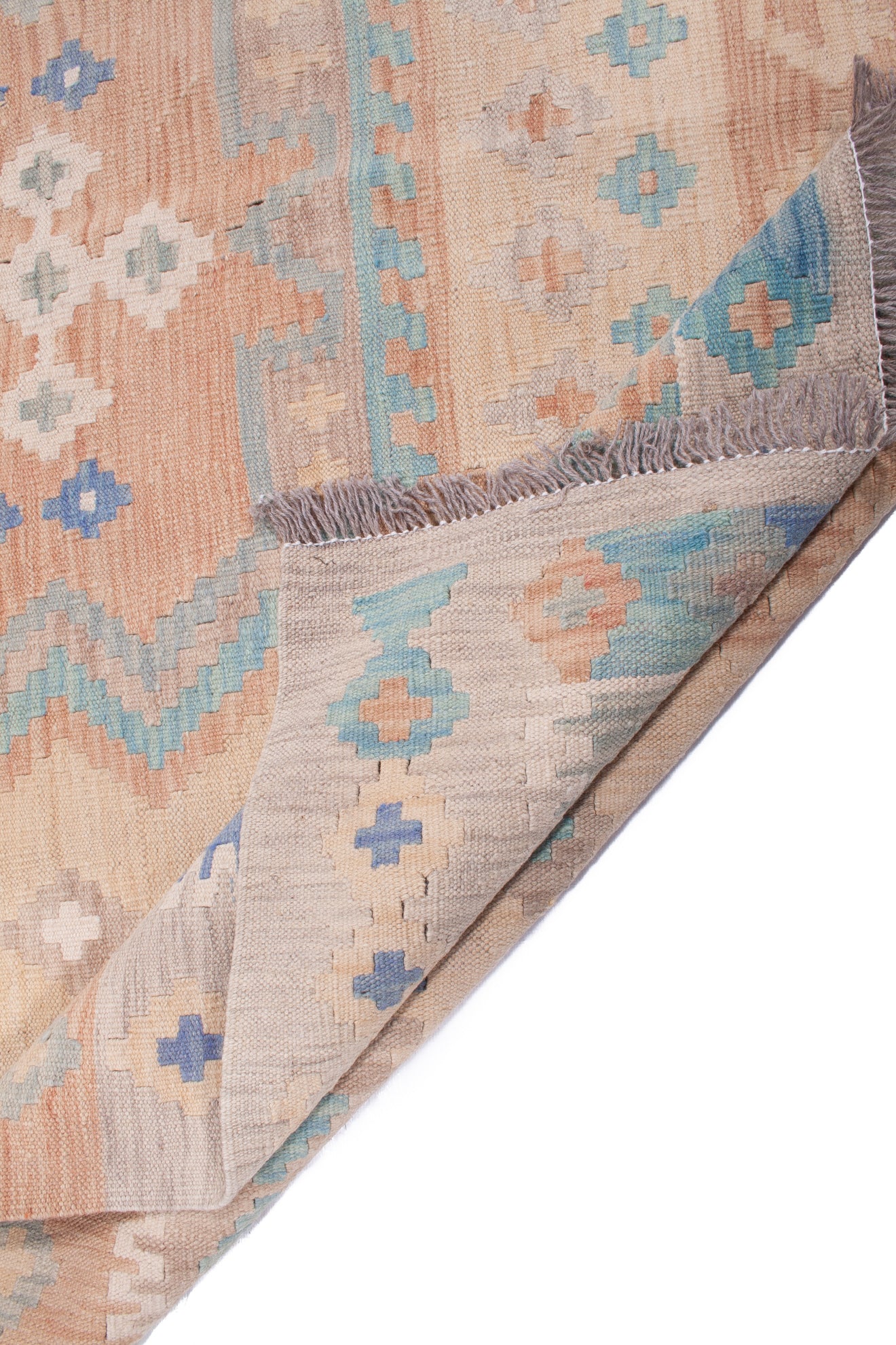 Handwoven in Afghanistan, this Kilim rug reflects the enduring traditions of tribal weaving, blending practicality with bold geometric expression. Its stepped hexagonal medallion sits within a mirrored field of diamonds and hexagons, creating a sense of structure and balance.