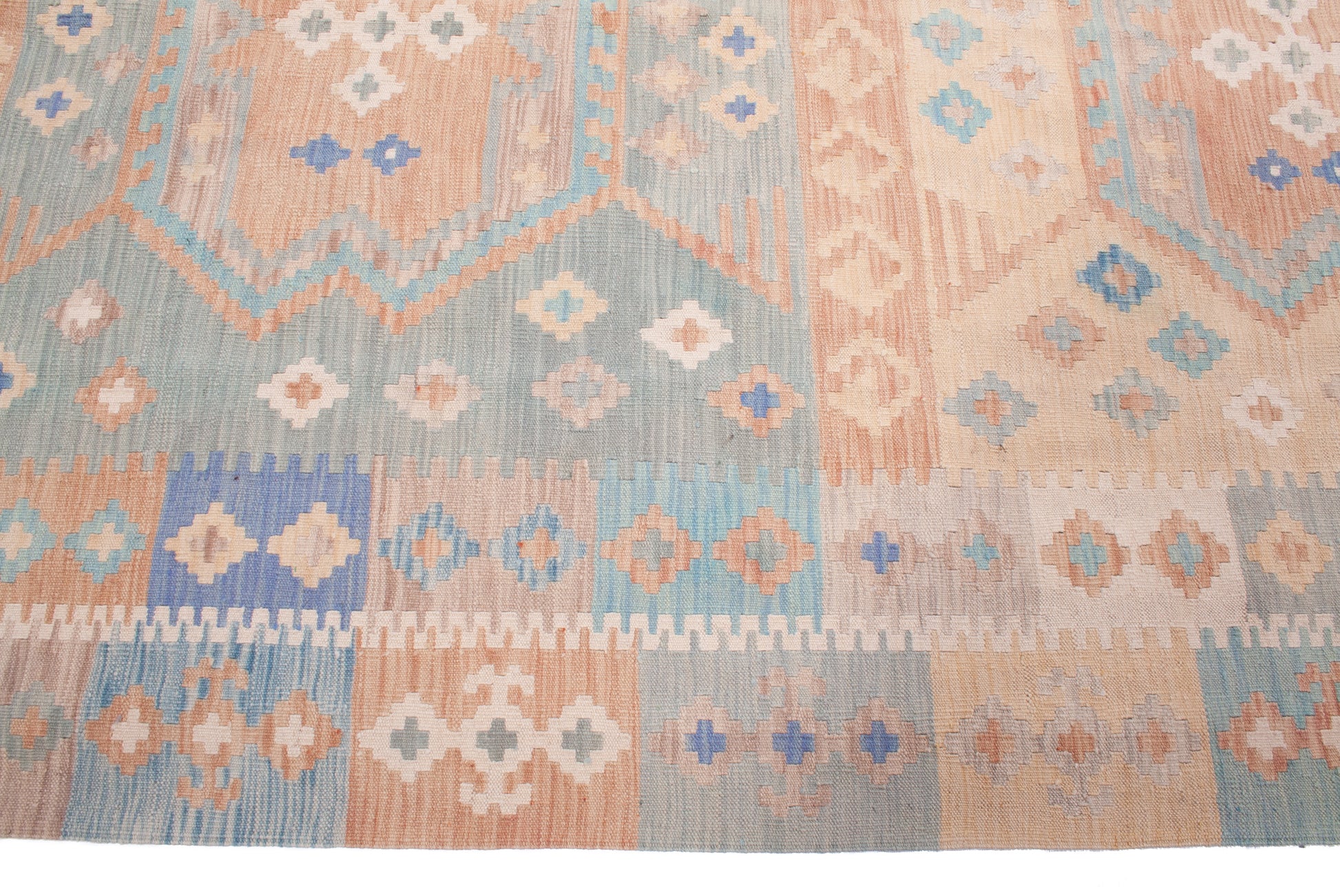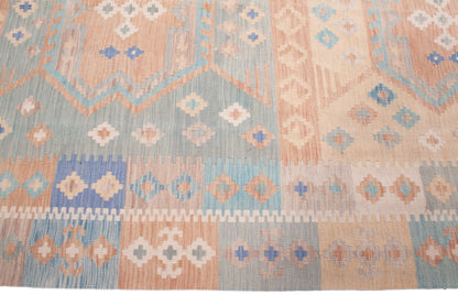 The muted palette of sage green, peach, and cream is accented by soft tones of lavender and light blue, offering a gentle contrast that feels earthy and grounded. The peach-bordered frame, flanked by light blue and cream guard bands, reinforces the rug’s symmetry and cohesion.