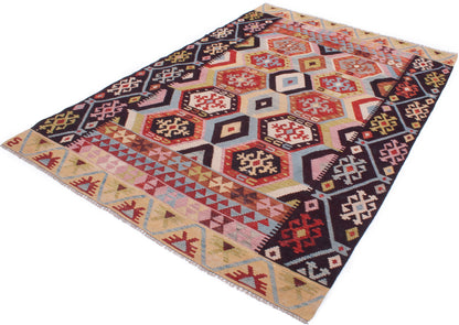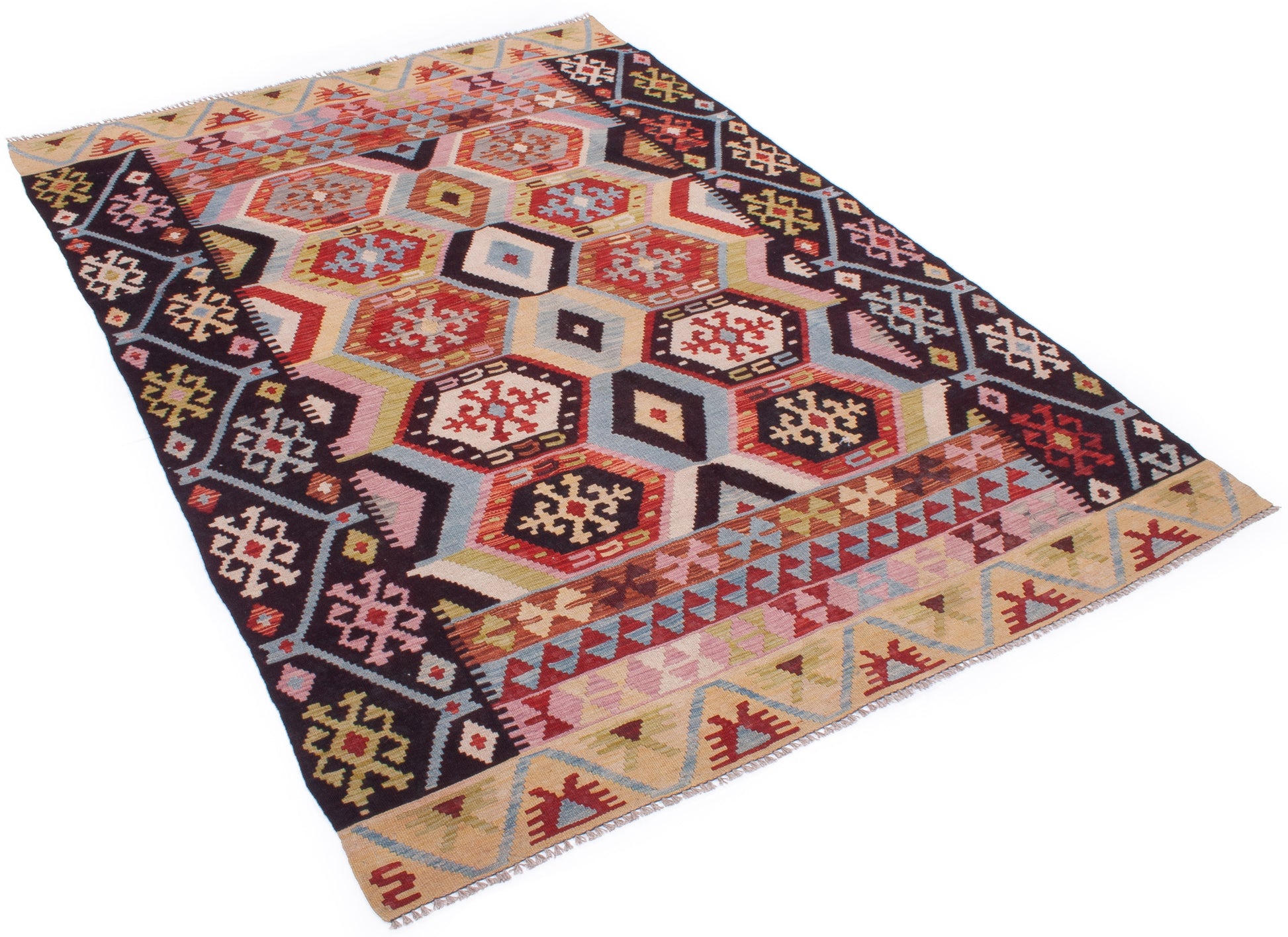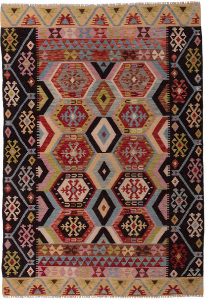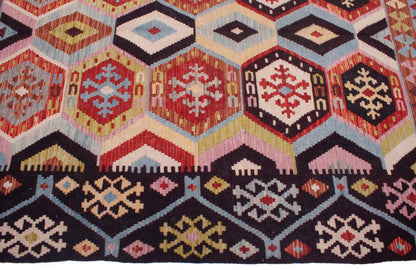 This Afghan Kilim rug embodies the raw beauty of tribal weaving, featuring a repeat medallion layout of interlocking hexagons that form a bold, symmetrical rhythm across the field. Each medallion encloses star-like motifs, arranged in a grid-like structure that speaks to the Kilim tradition’s emphasis on geometry and repetition.