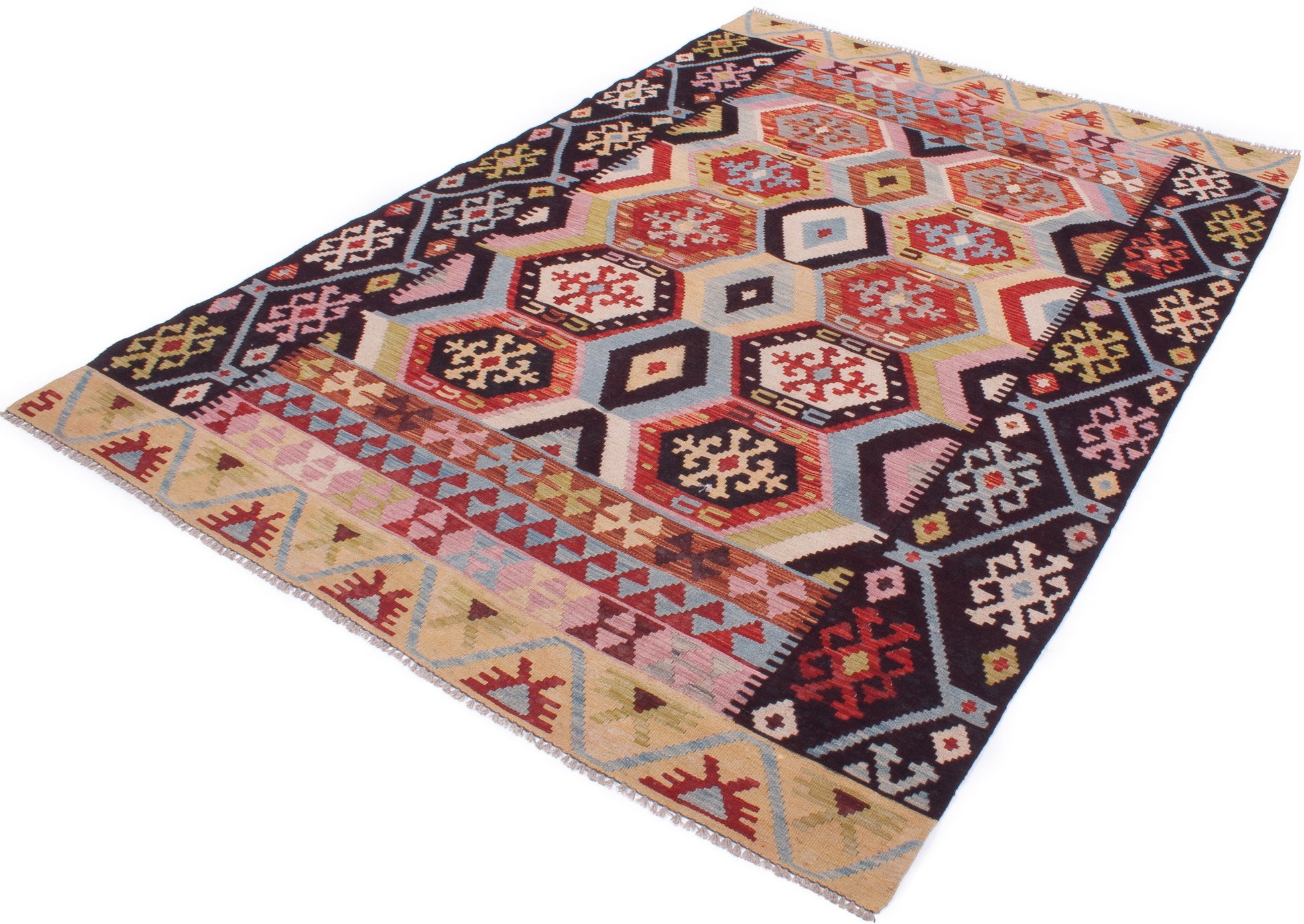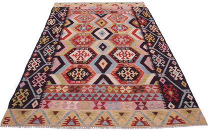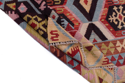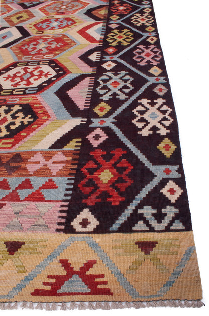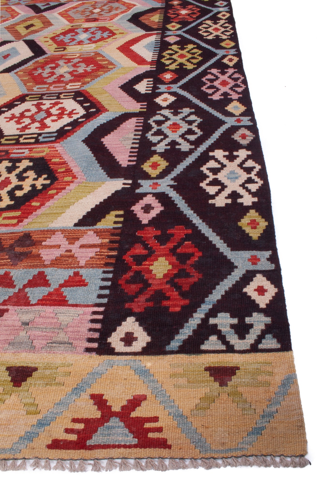 Handwoven from wool on a cotton foundation, this Kilim is both durable and lightweight, making it ideal for layered interiors or high-traffic spaces. Its tribal character and versatile proportions lend themselves beautifully to eclectic, bohemian, or rustic settings.