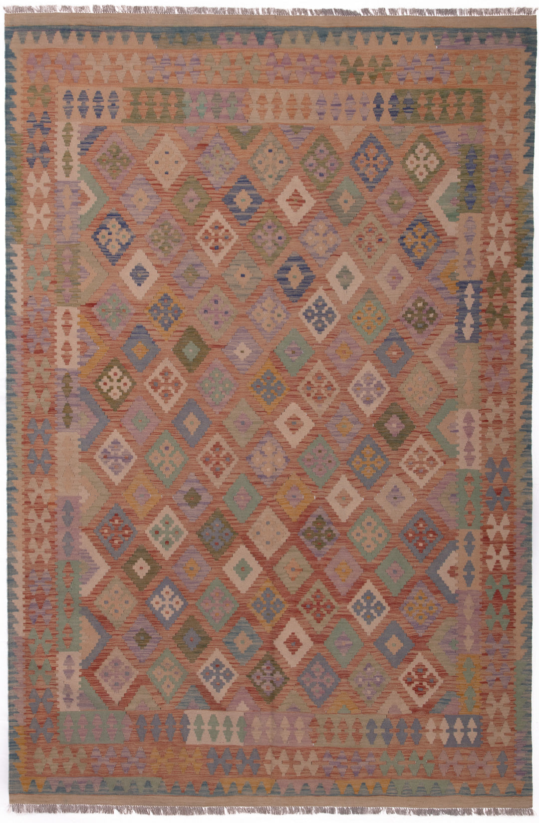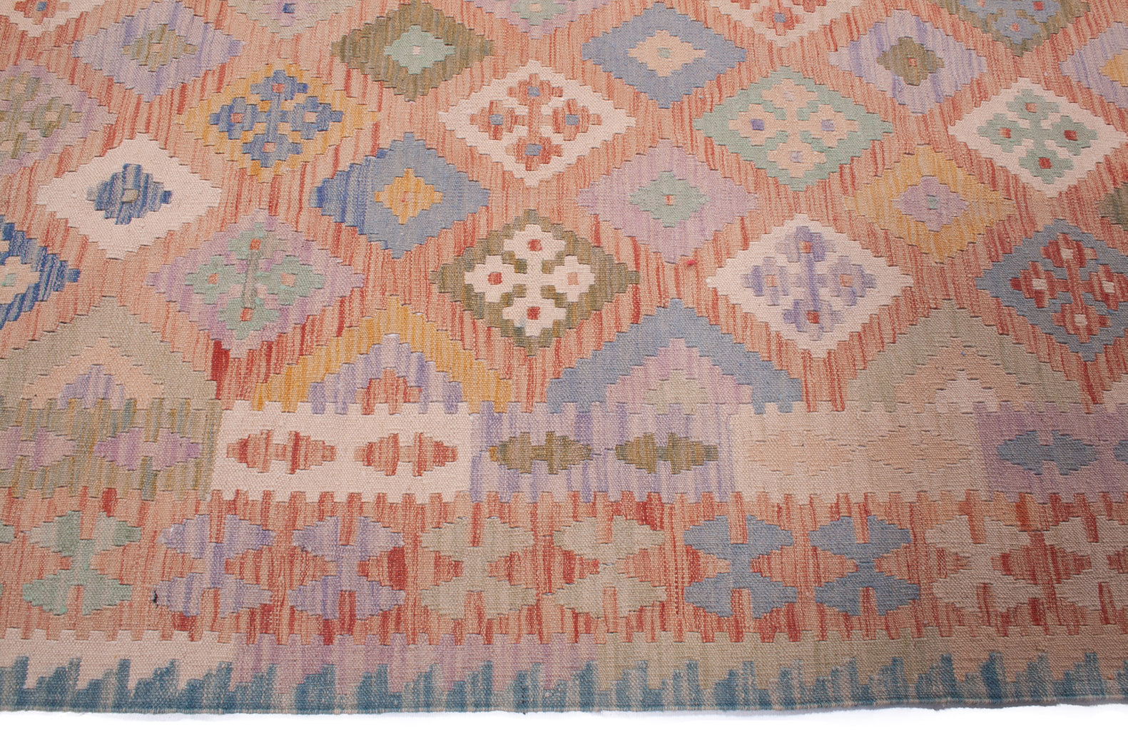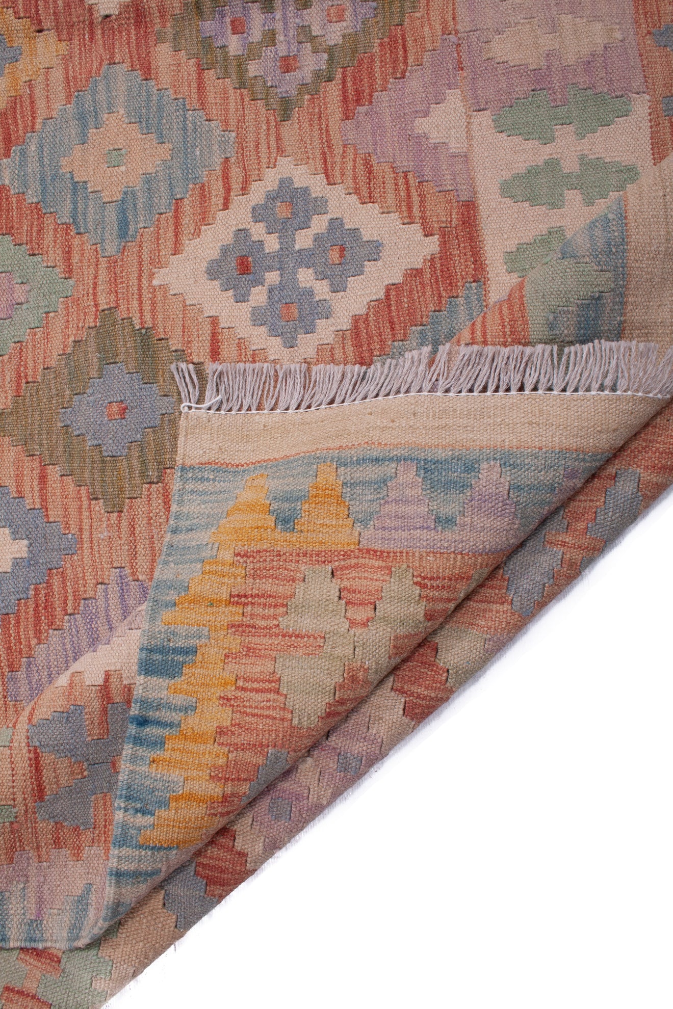 Handwoven in Afghanistan, this Kilim rug embodies the timeless appeal of tribal weaving, blending geometric precision with earthy subtlety. Its diamond medallions form a grid-like structure, softened by a palette of terracotta, sage green, dusty blue, and mauve.