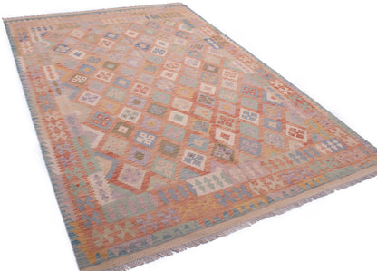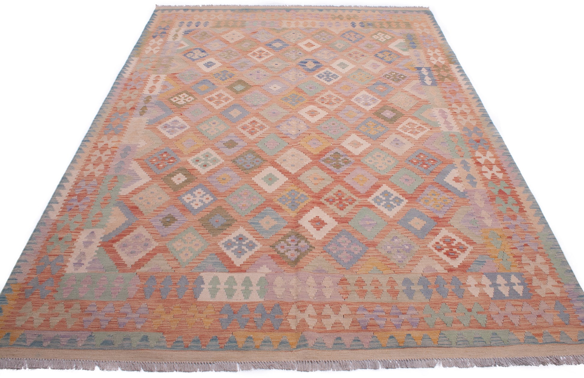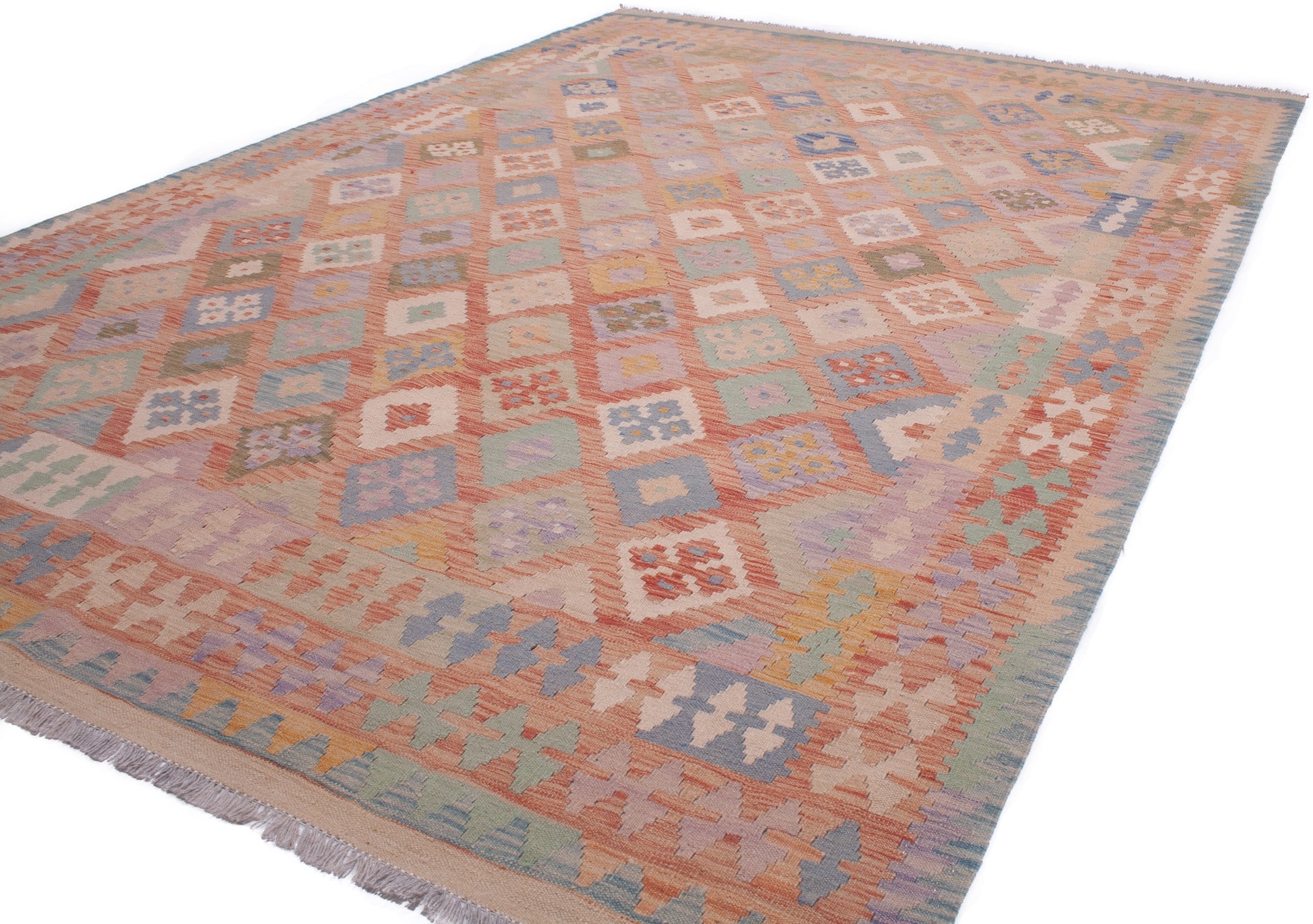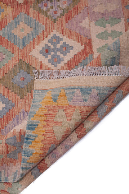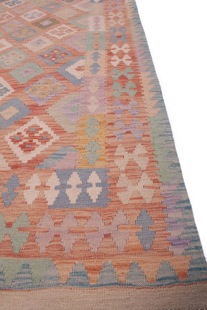 Handwoven in Afghanistan, this Kilim rug embodies the timeless appeal of tribal weaving, blending geometric precision with earthy subtlety. Its diamond medallions form a grid-like structure, softened by a palette of terracotta, sage green, dusty blue, and mauve.