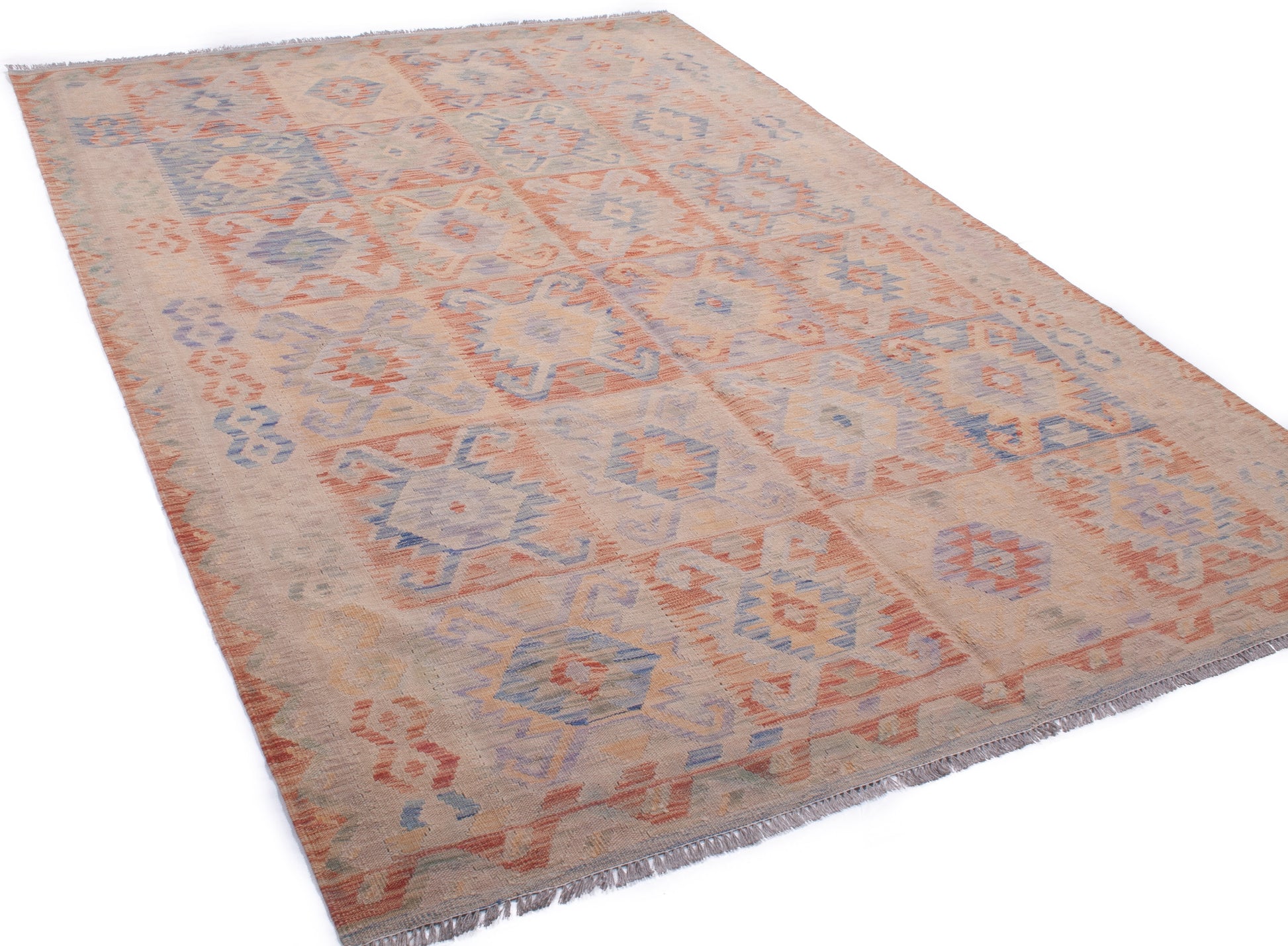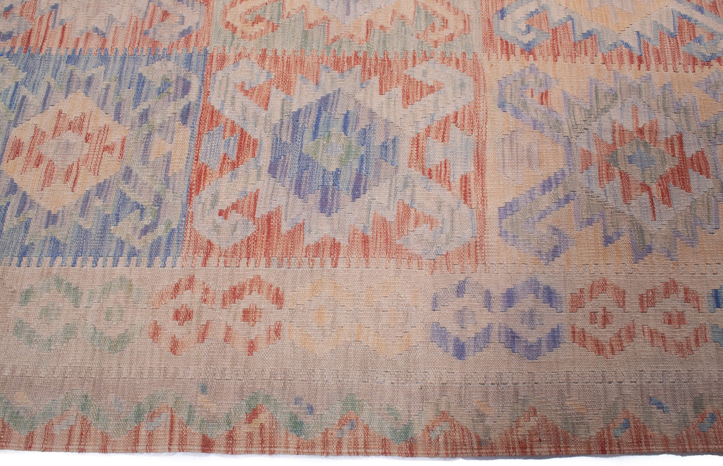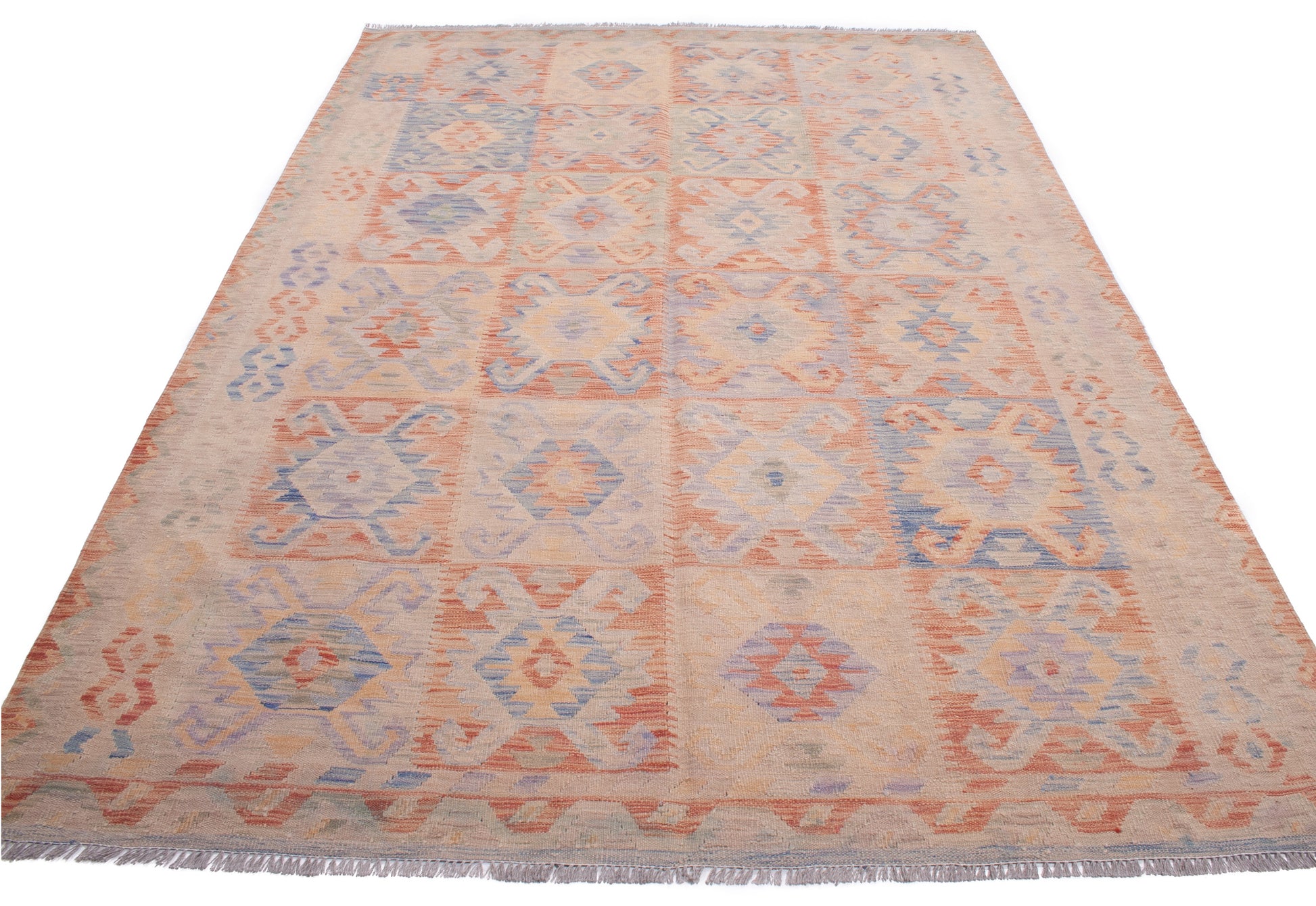 This Afghan Kilim rug weaves tradition into structure, featuring a Panel (Khesti) design that organises diamond and star motifs within neatly framed compartments. The mirrored, staggered arrangement of motifs creates a sense of rhythm and balance, softened by a palette of peach, beige, soft blue, and muted green, with touches of pale lavender and light orange.
