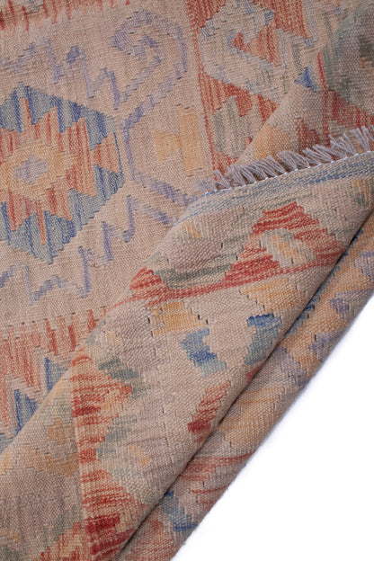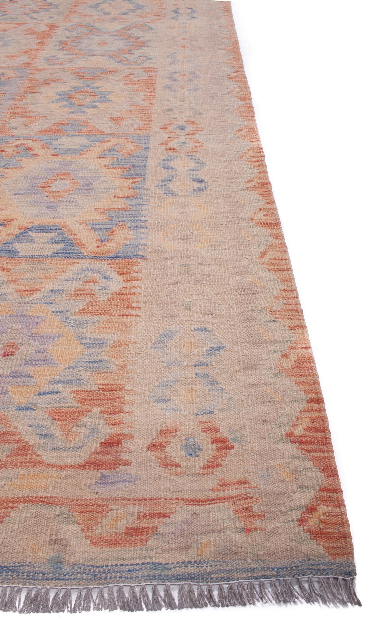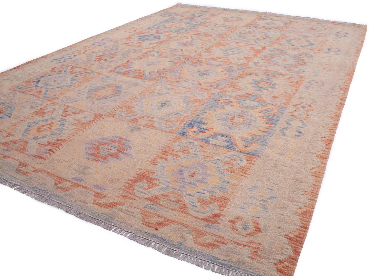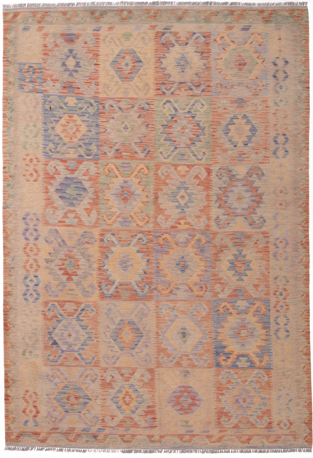 This Afghan Kilim rug weaves tradition into structure, featuring a Panel (Khesti) design that organises diamond and star motifs within neatly framed compartments. The mirrored, staggered arrangement of motifs creates a sense of rhythm and balance, softened by a palette of peach, beige, soft blue, and muted green, with touches of pale lavender and light orange.
