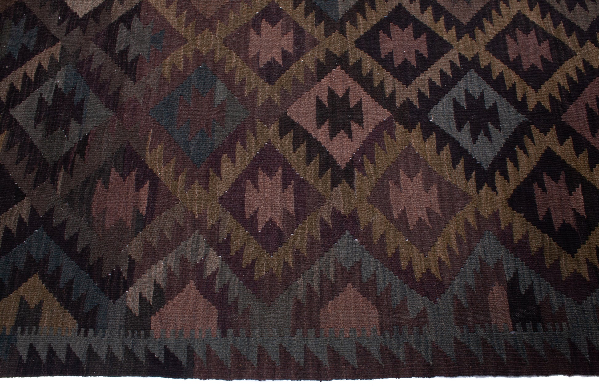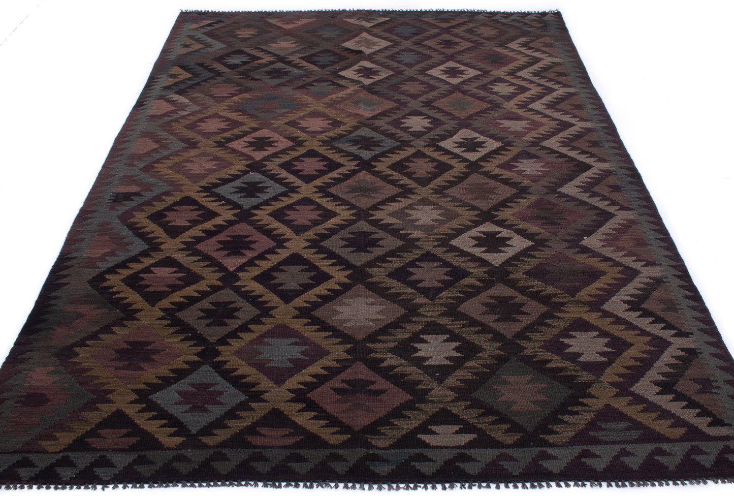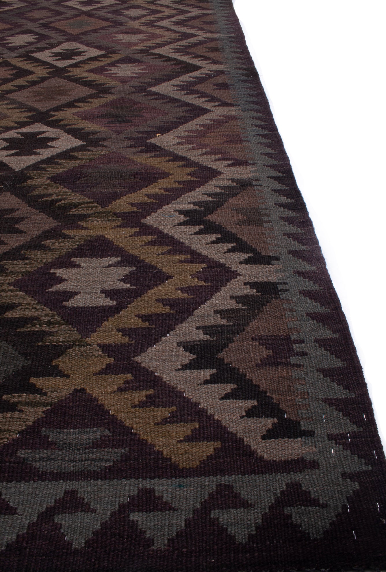 The earthy palette of burgundy, charcoal, olive, and mauve is softened by touches of slate blue and taupe, offering a grounded yet versatile aesthetic. Woven from wool on a cotton foundation, this flatweave is lightweight, durable, and practical for busy homes.