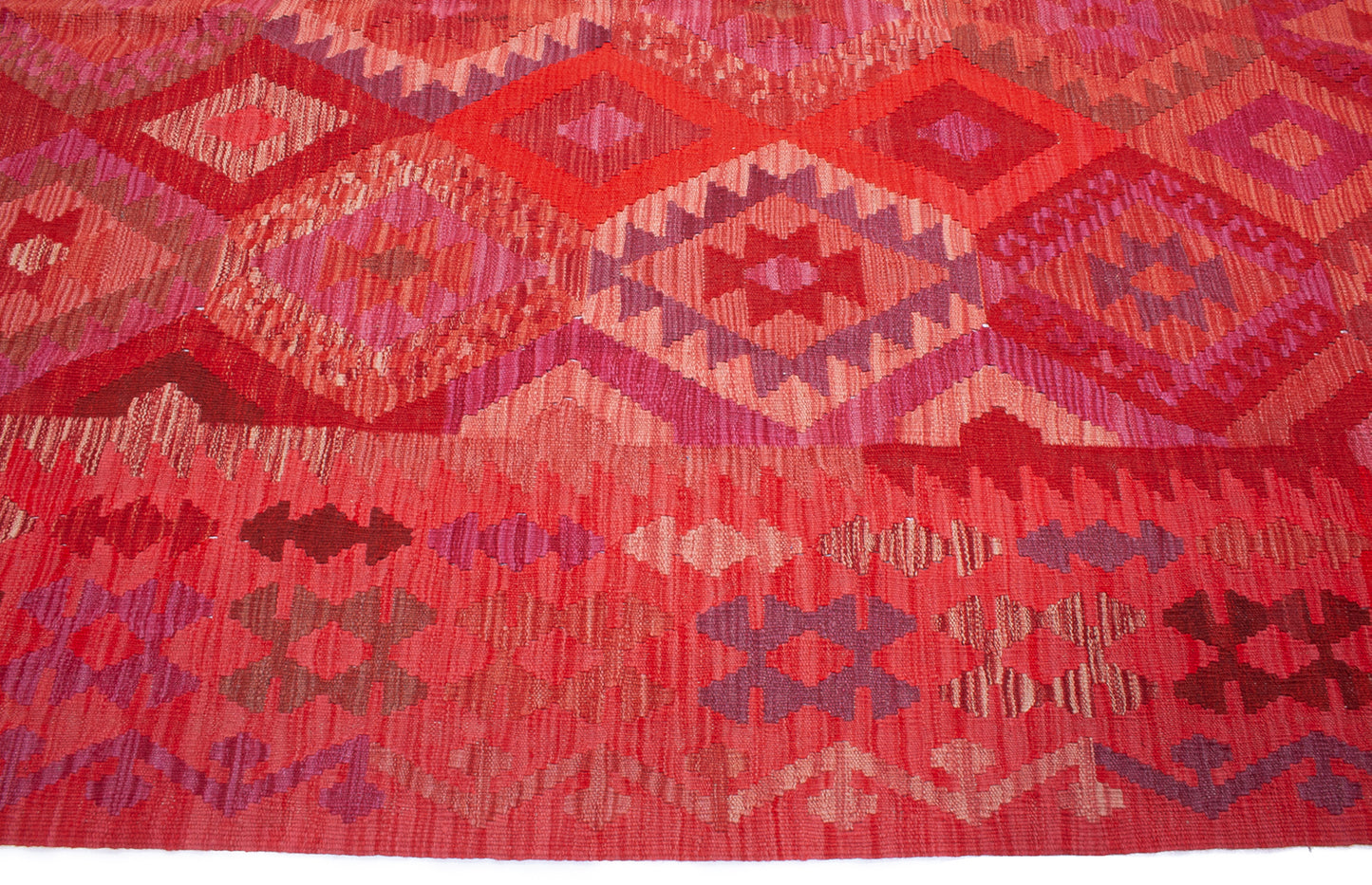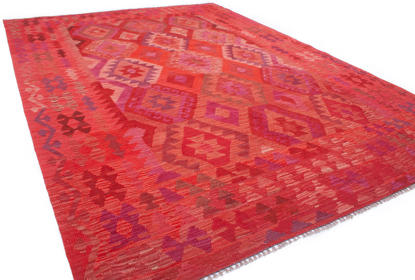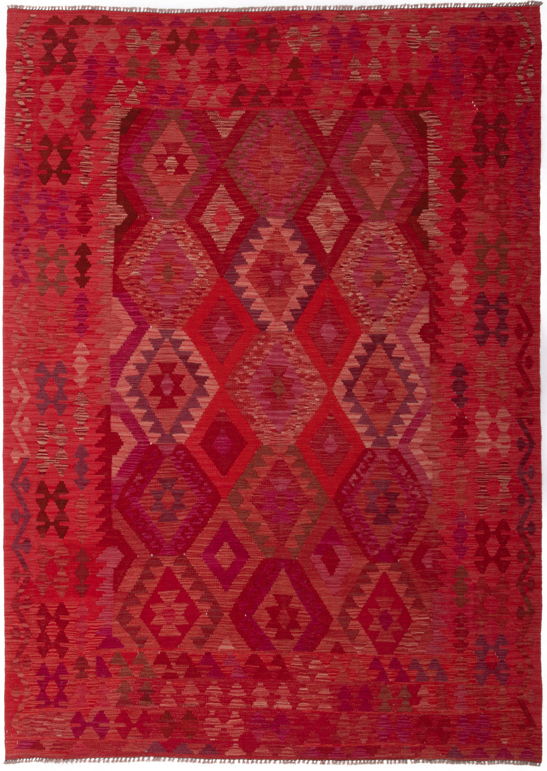 Handwoven in Afghanistan, this Kilim rug embodies the bold geometry and rich colour of tribal weaving. Its all-over diamond medallion layout creates a striking sense of rhythm, enhanced by a palette of crimson, burgundy, plum, and coral, with accents of rose pink and violet.